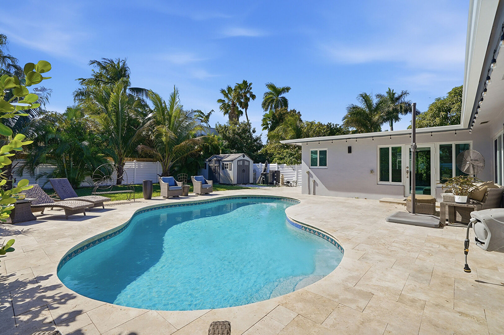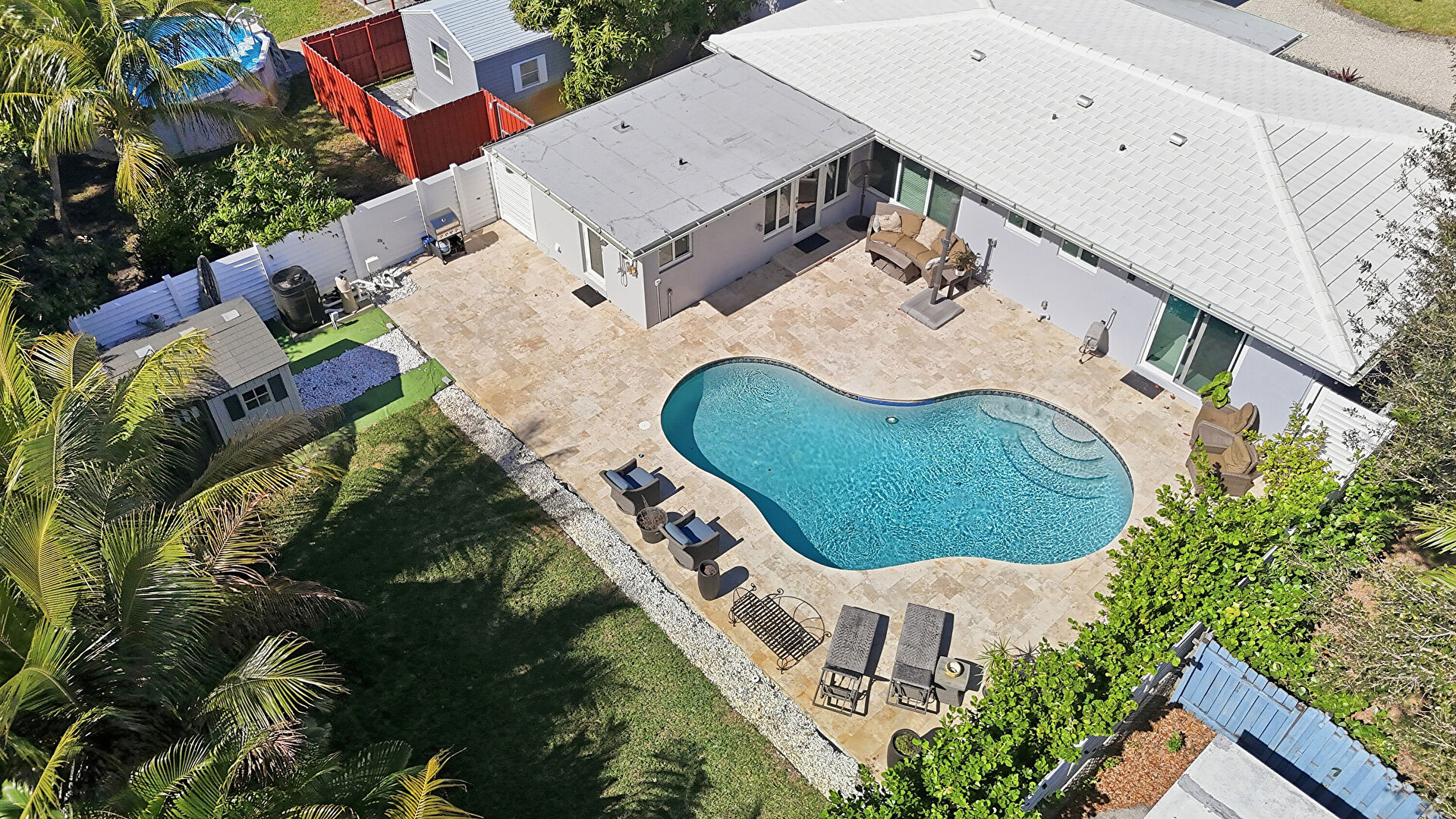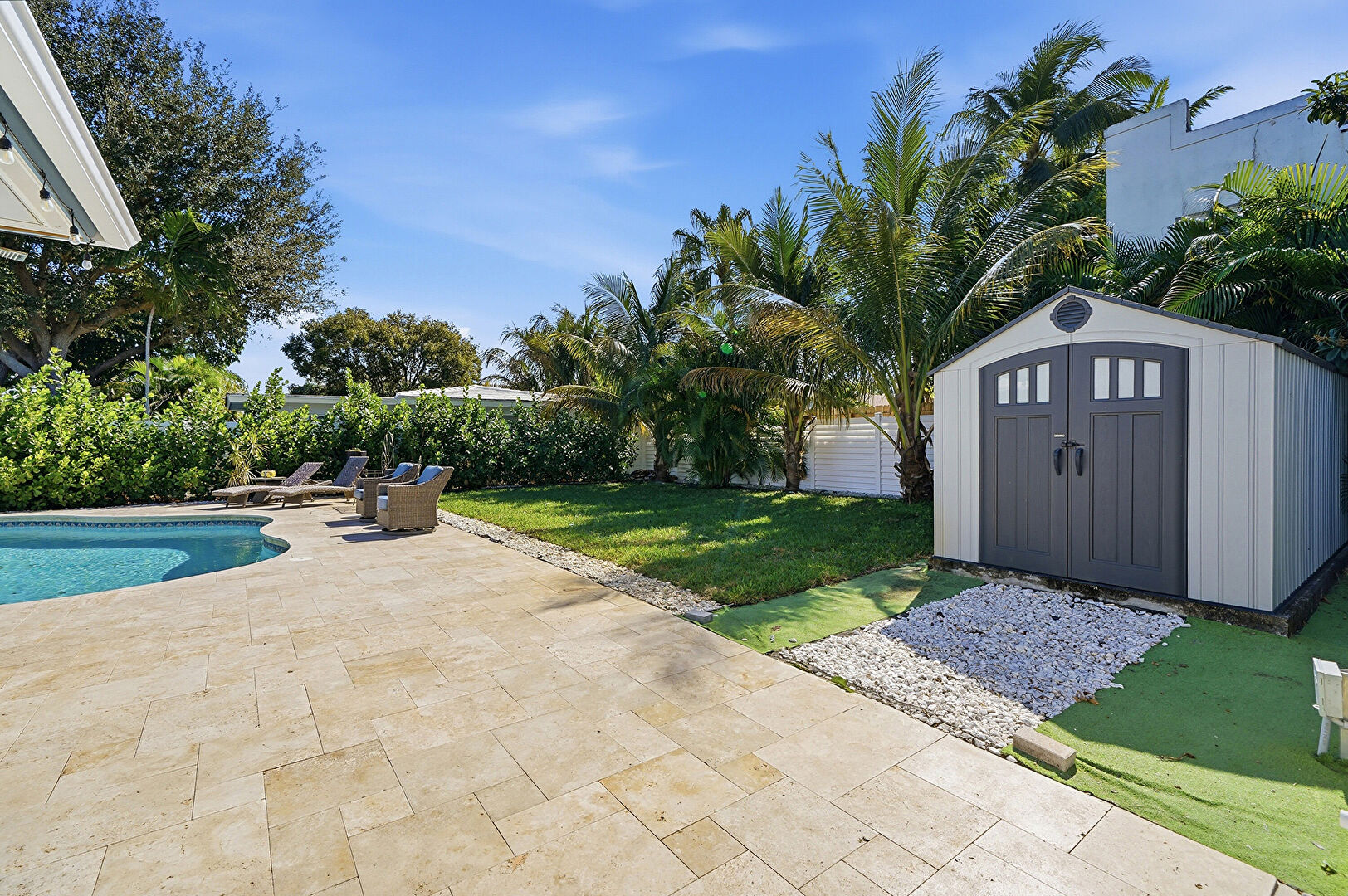 Fence, Lawn, Outdoor Structure, Patio, Shed, Patio, Pool, Porch