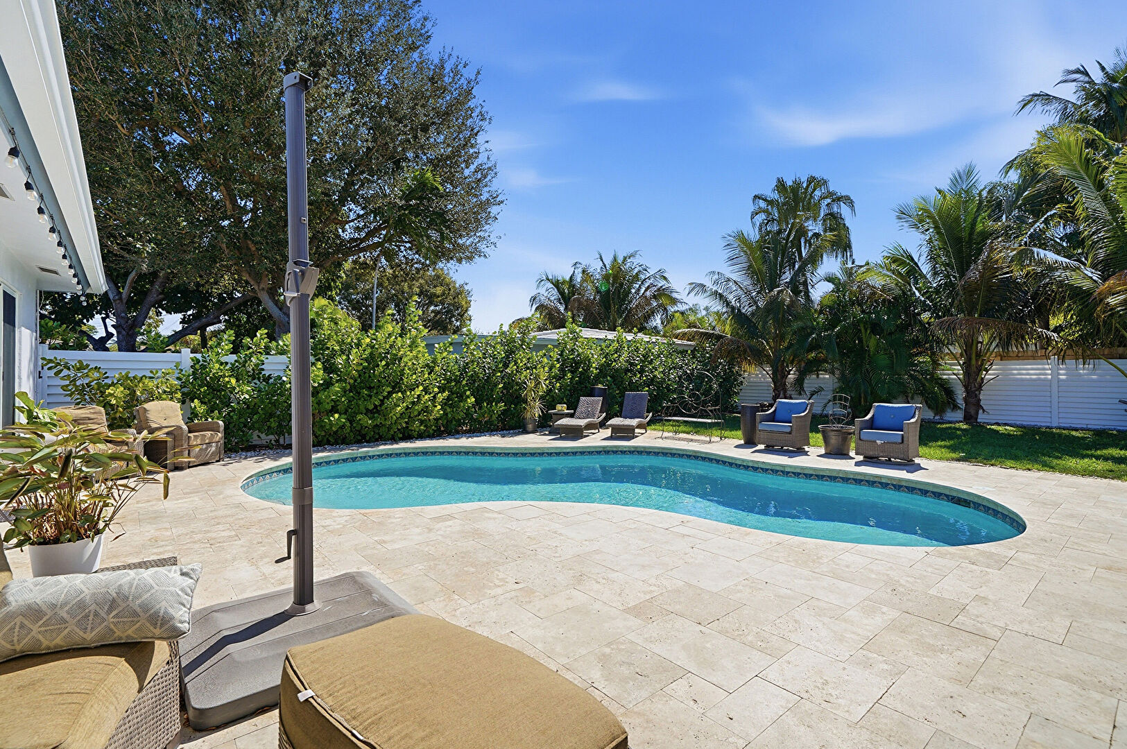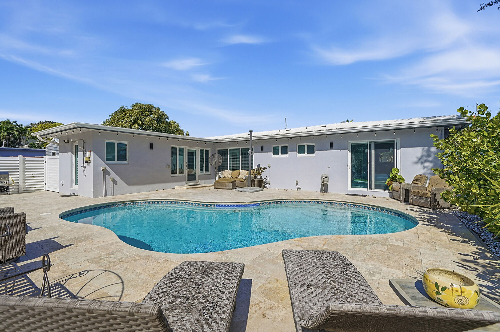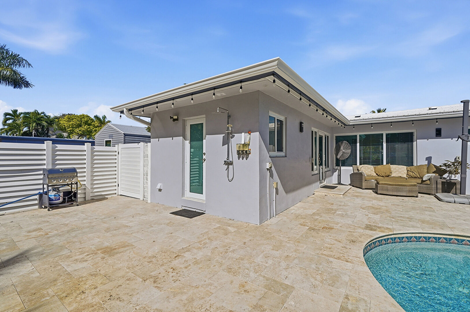 Downspout, Fence, Grill, Gutters, Lawn, Outdoor Living Space, Patio, Pool, Stucco Siding, Fence, Outdoor Living Space