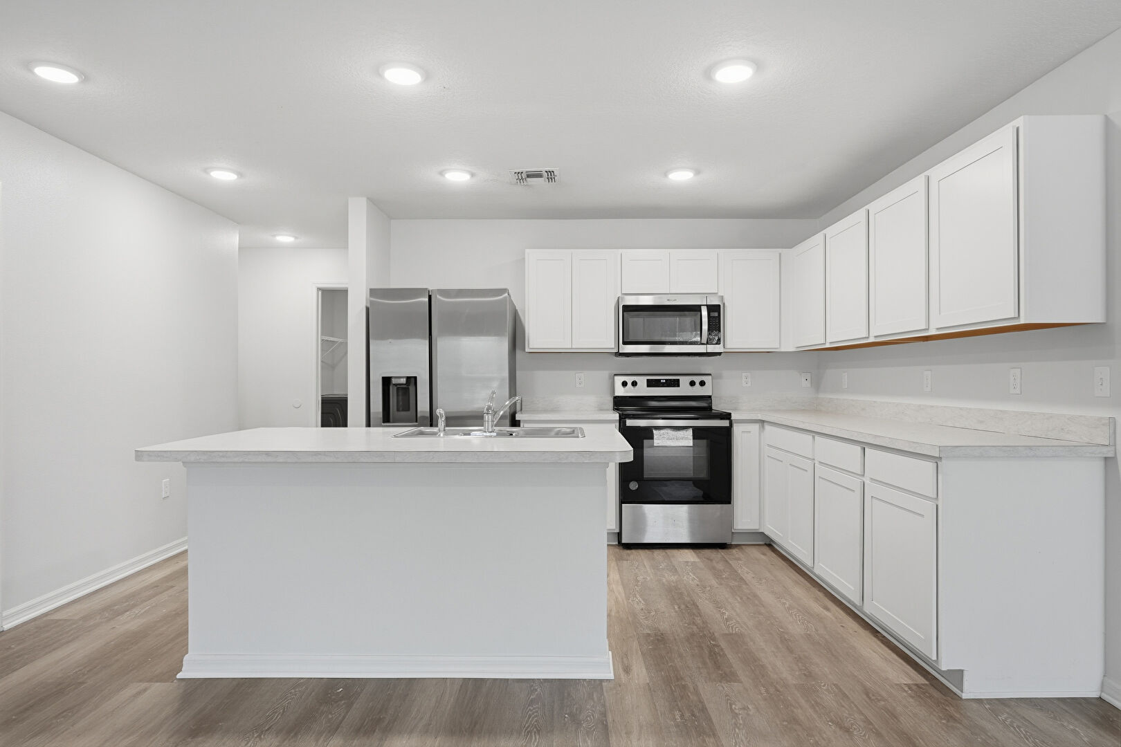 Baseboards Wall, Drywall, Kitchen Island, L Shaped Kitchen, Recessed Lighting, Shaker Cabinets, Vent, Wood Finish Floor, Shaker Cabinets, Wood Finish Floor