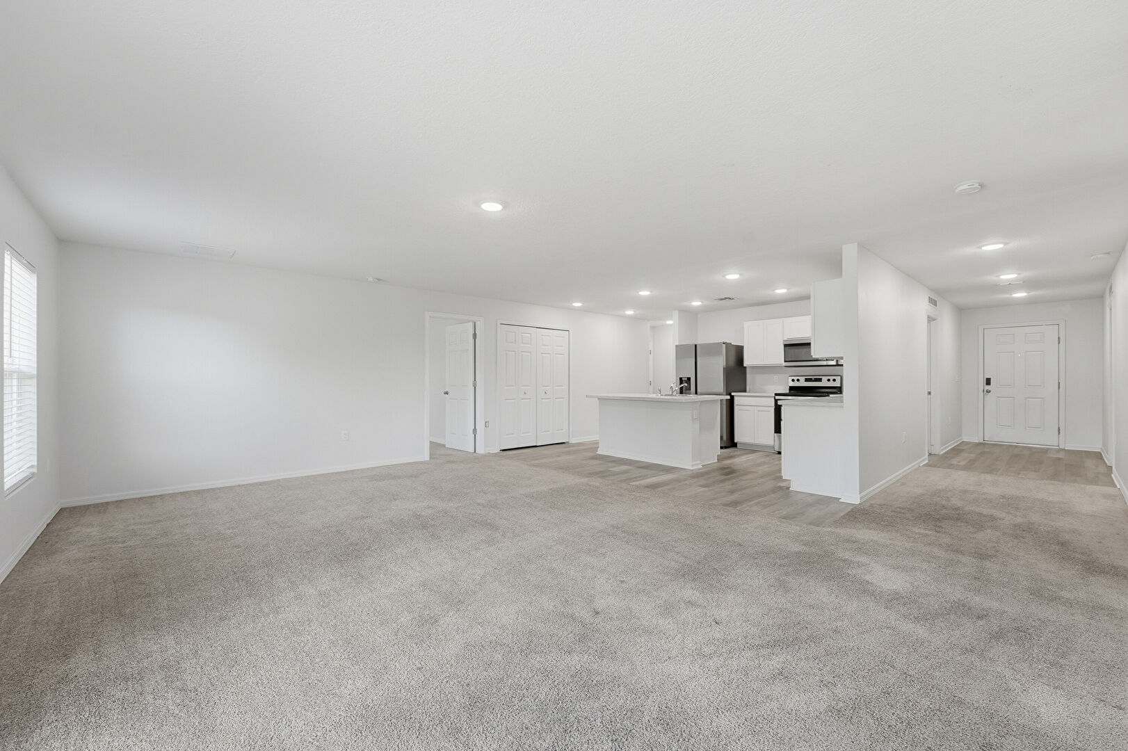 Baseboards Wall, Carpet, Drywall, L Shaped Kitchen, Natural Light, Recessed Lighting, Vent, Baseboards Wall, Carpet, Wood Finish Floor