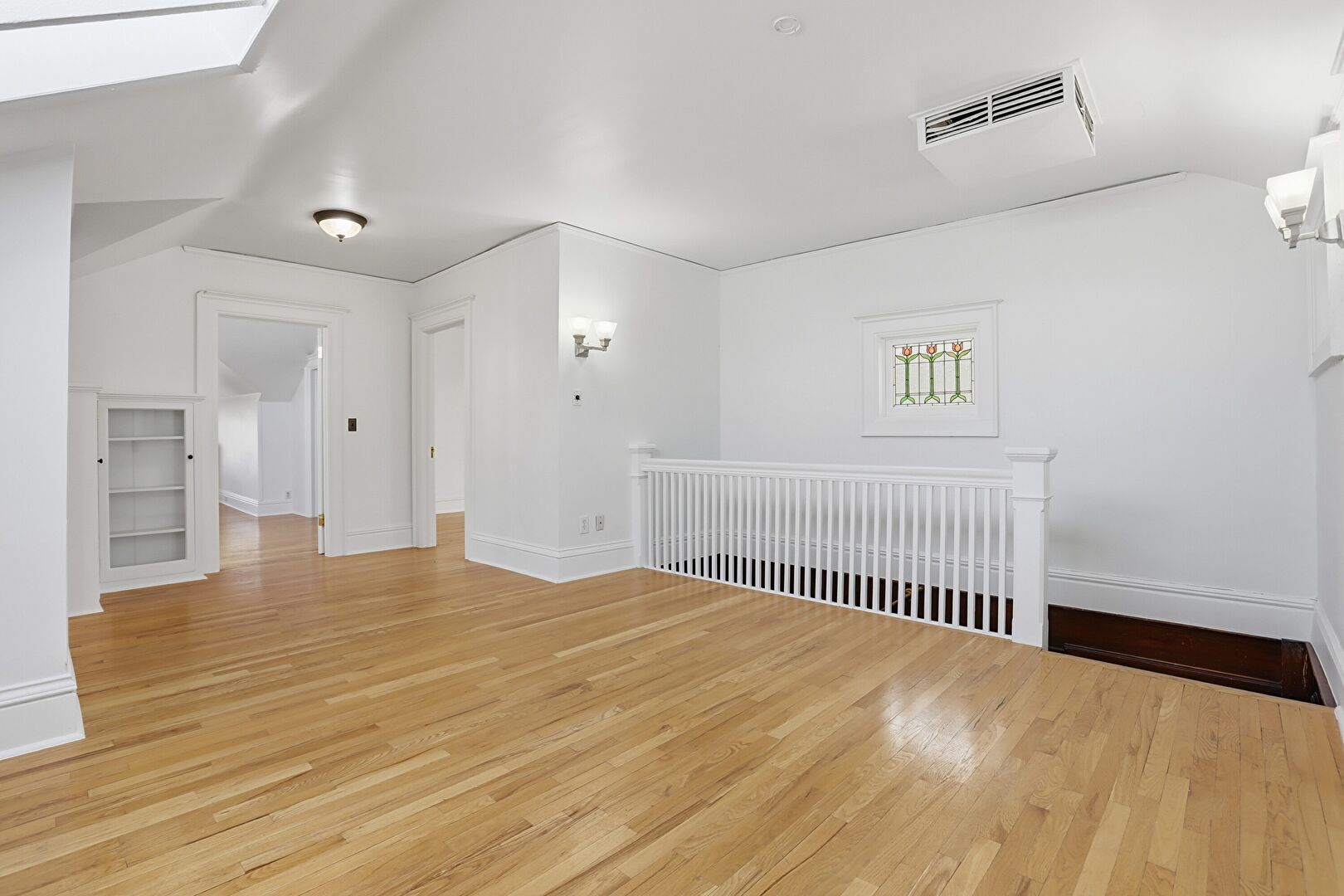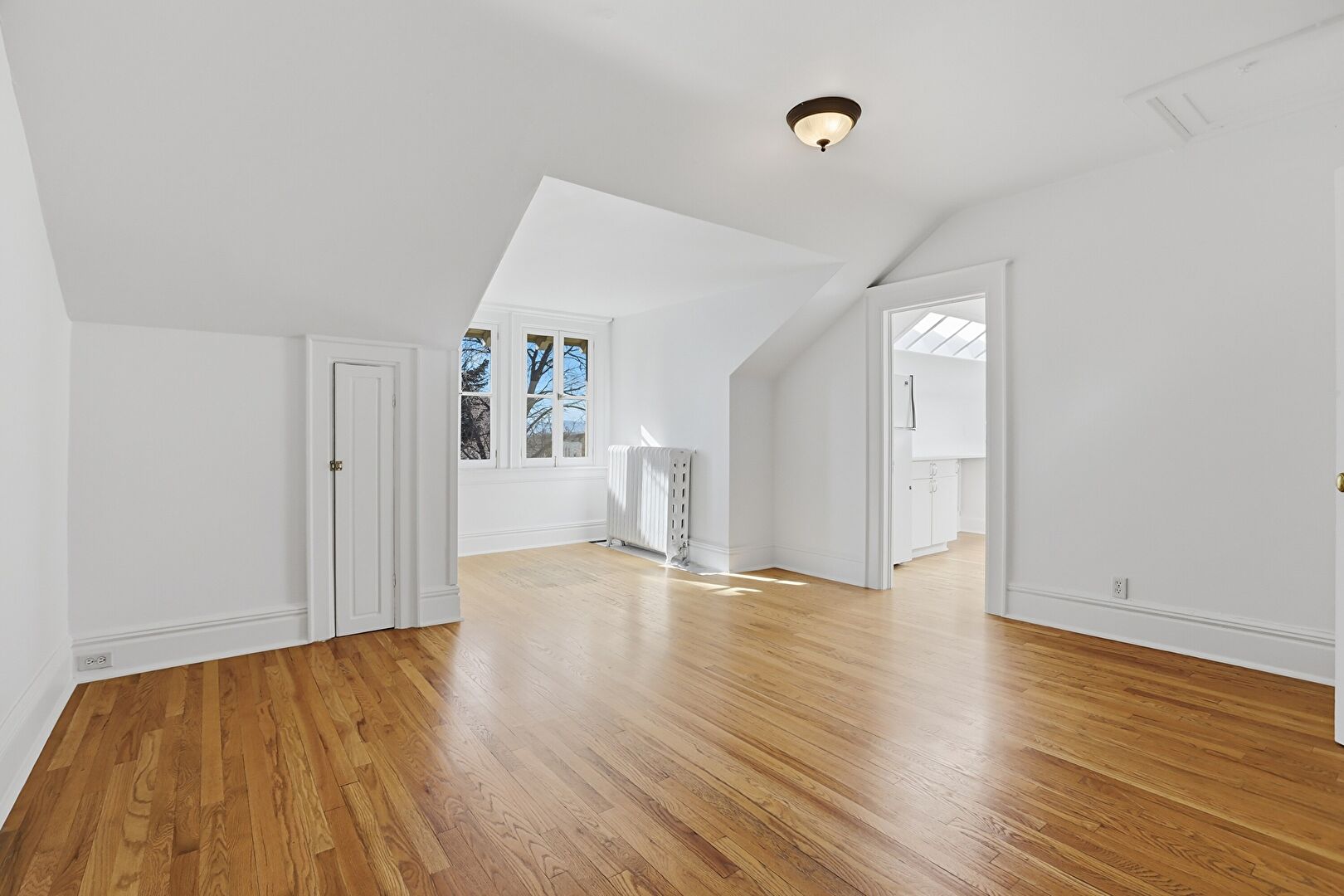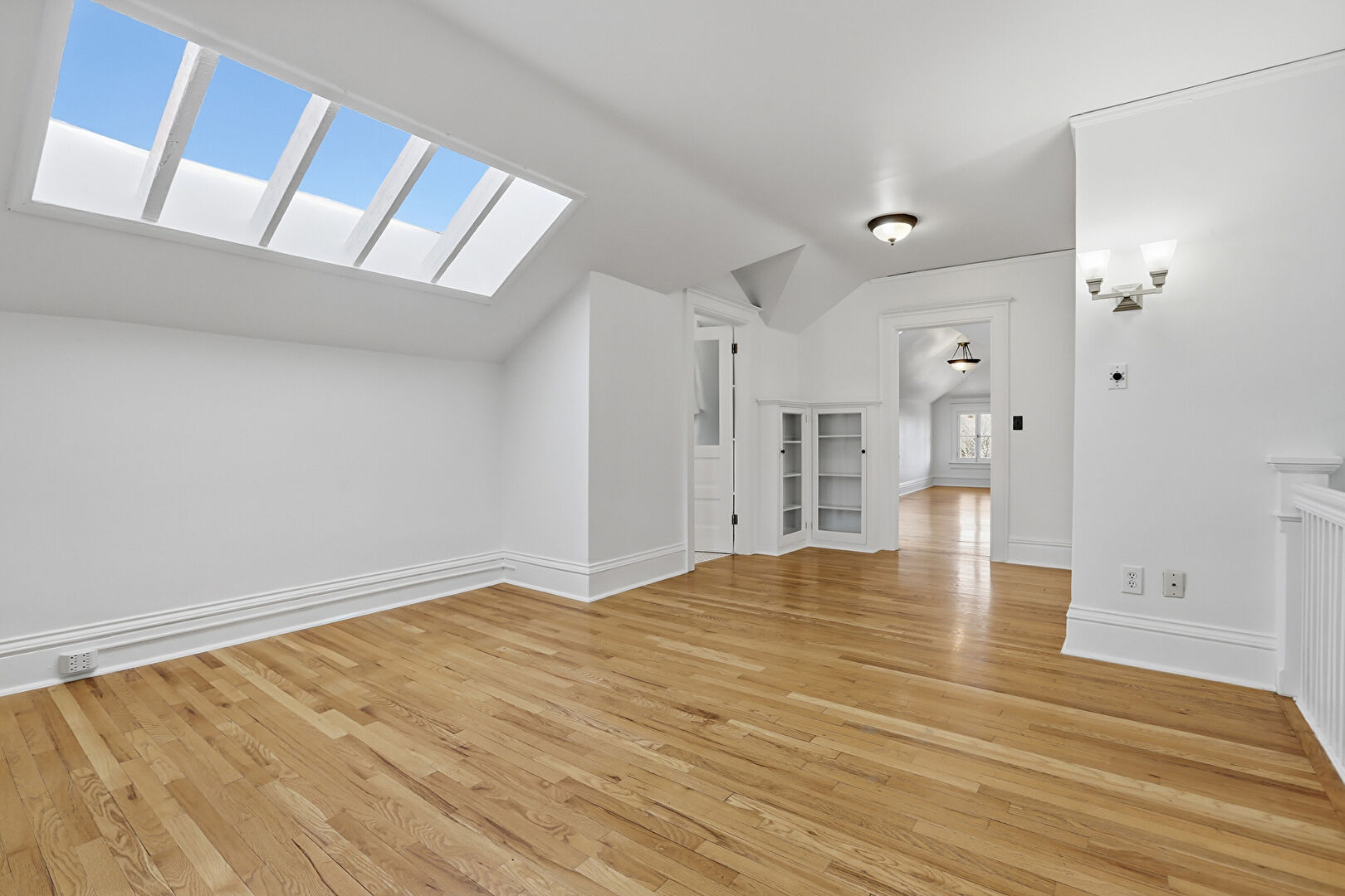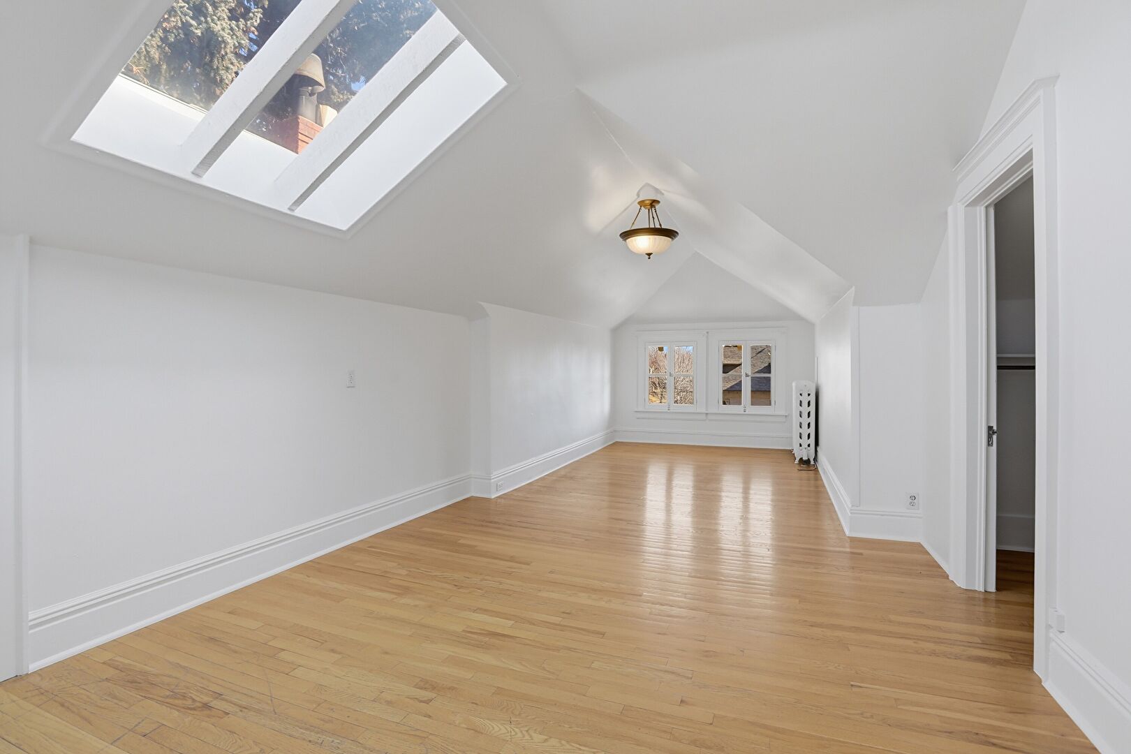 Baseboard Radiator, Baseboards Wall, Bonus Room, Built In Shelves, Ceiling Fan, Crown Molding, Drywall, Natural Light, Radiator, Skylight, Vaulted Ceiling, Vent, Wood Finish Floor, Baseboards Wall, Bonus Room, Brick Wall, Ceiling Fan, Drywall, Natural Light, Paneling Wall, Radiator, Skylight, Wood Finish Floor