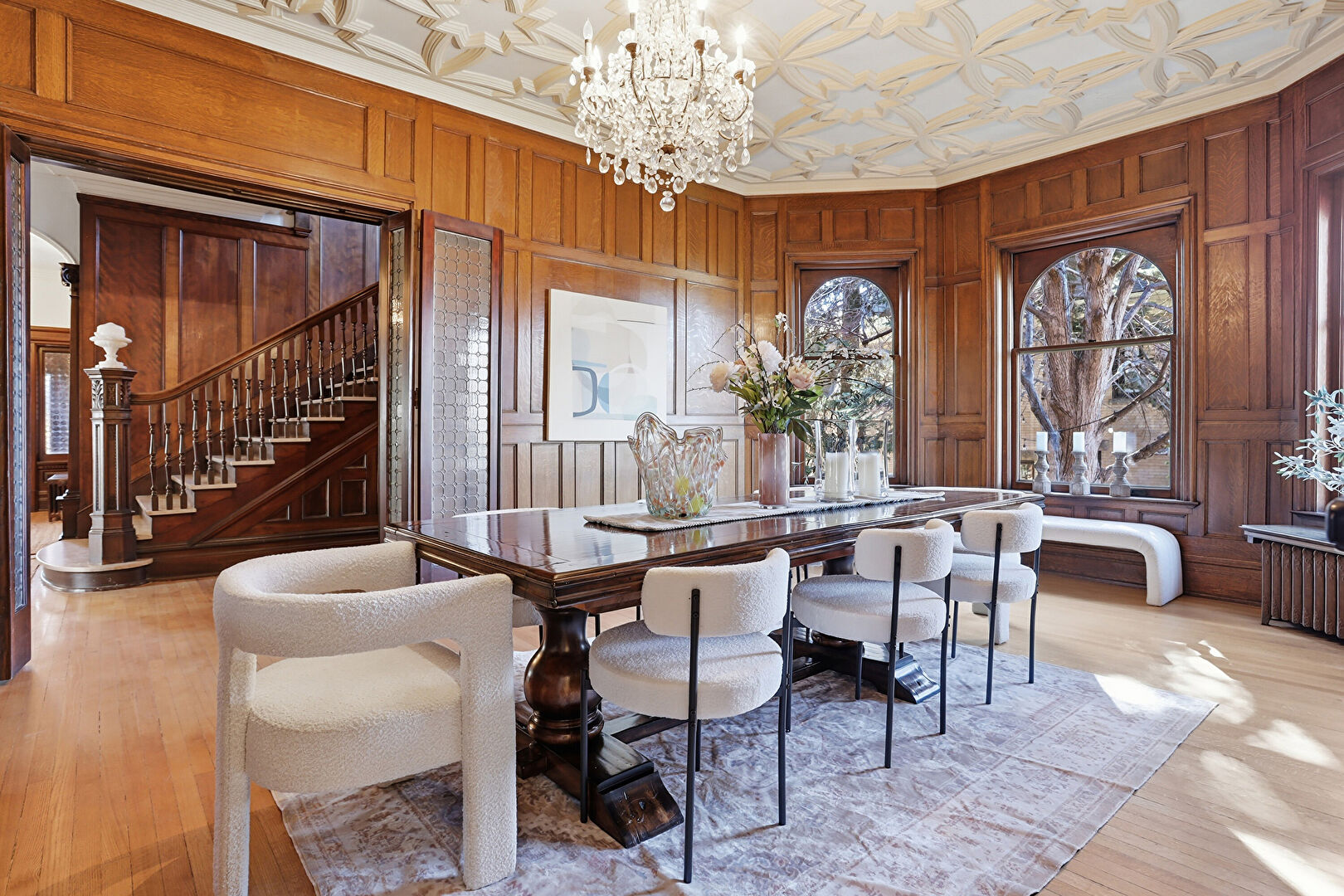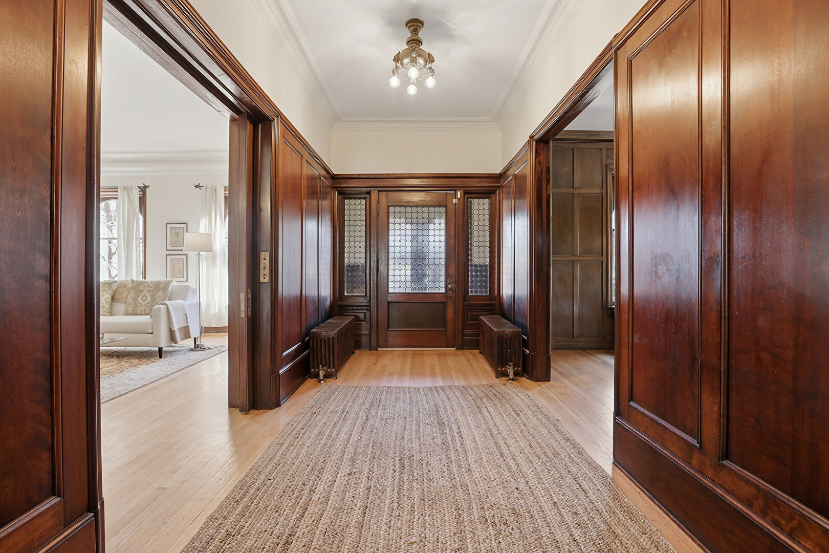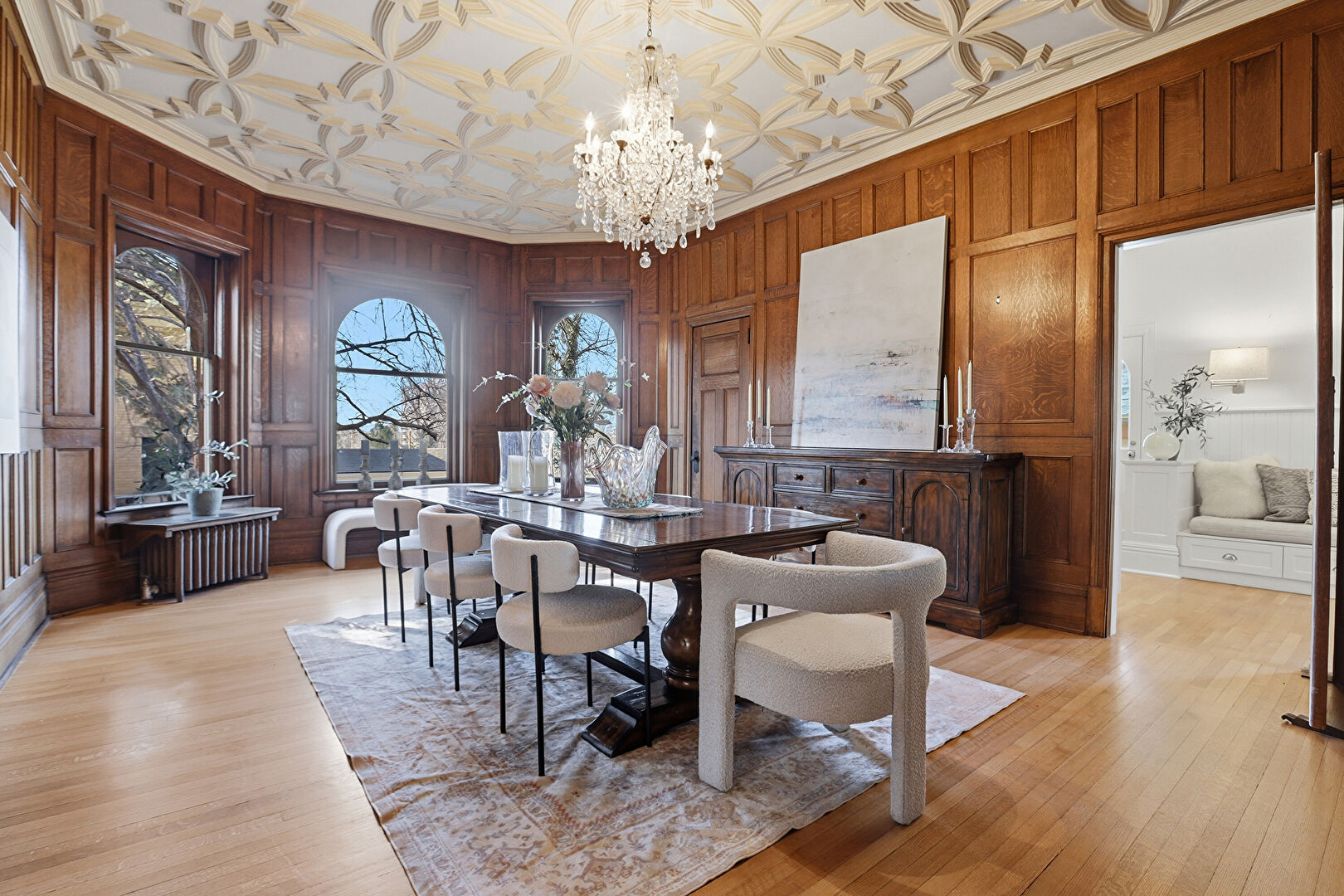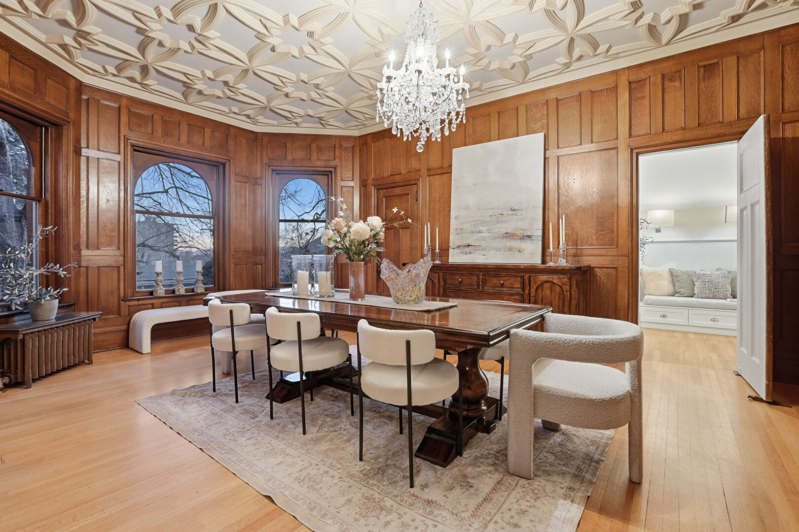 Baseboards Wall, Coffered Ceiling, Crown Molding, Drywall, Fireplace, Natural Light, Notable Chandelier, Paneling Wall, Radiator, Recessed Lighting, Stairs, Wainscot Wall, Wood Finish Floor, Wood Wall, Baseboards Wall, Crown Molding, Drywall, Paneling Wall, Recessed Lighting, Vent, Wood Finish Floor