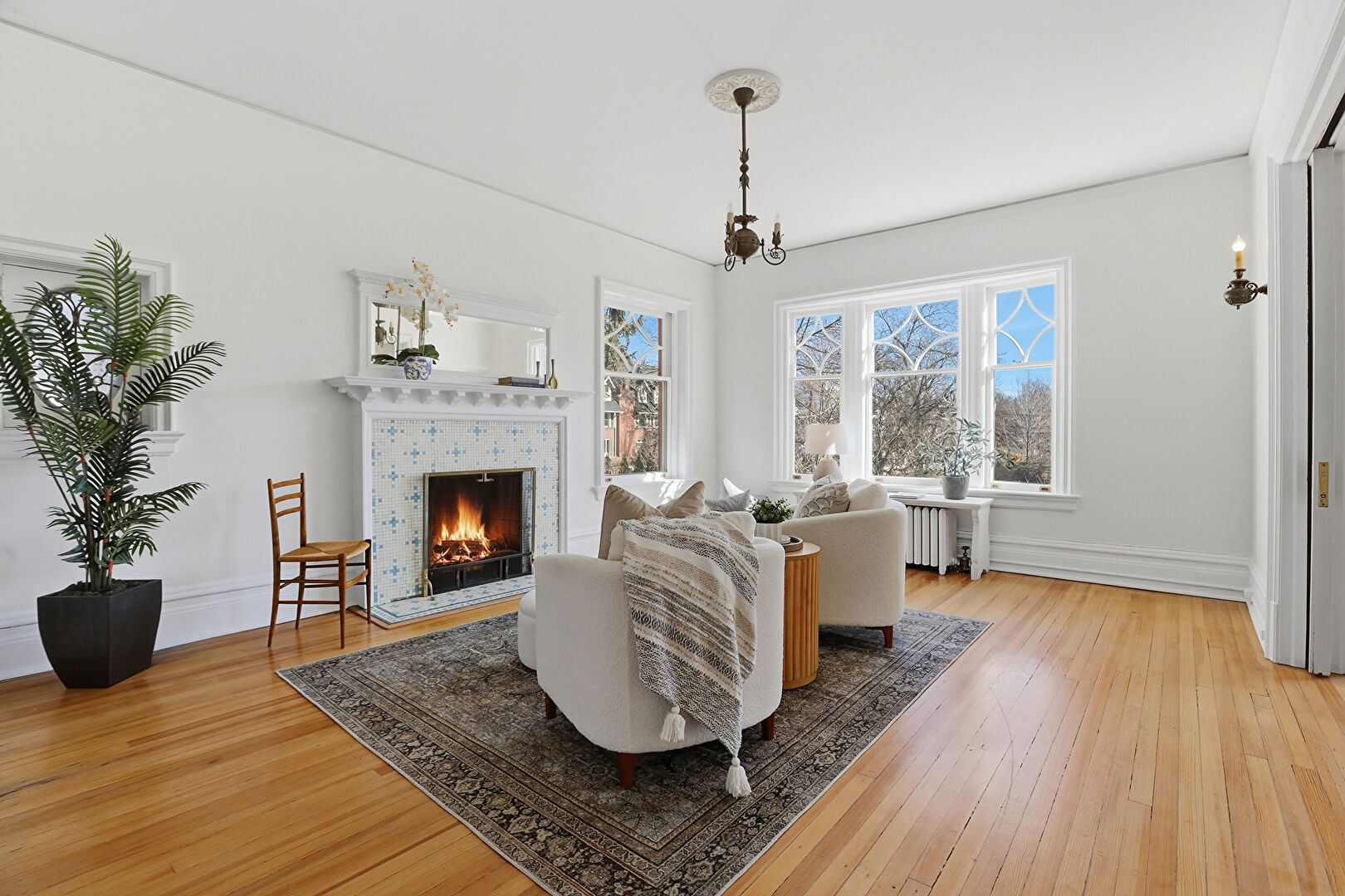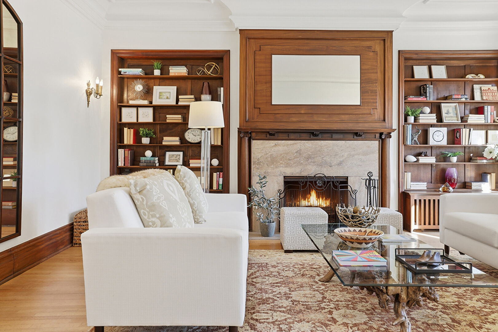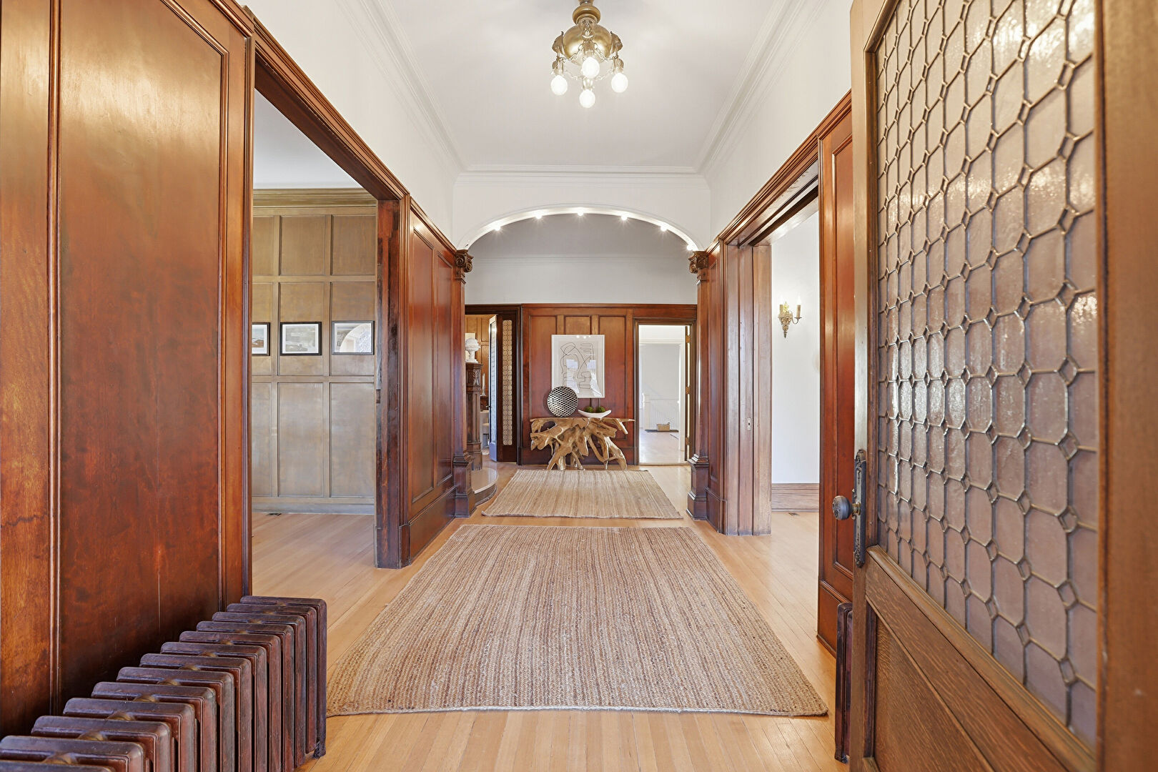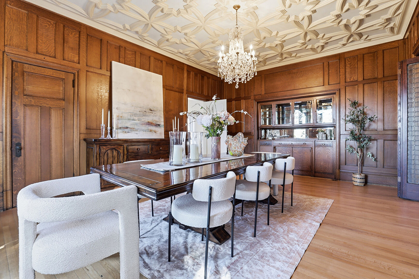 Baseboards Wall, Coffered Ceiling, Crown Molding, Drywall, Fireplace, Natural Light, Notable Chandelier, Paneling Wall, Radiator, Recessed Lighting, Stairs, Wainscot Wall, Wood Finish Floor, Wood Wall, Baseboards Wall, Crown Molding, Drywall, Paneling Wall, Recessed Lighting, Vent, Wood Finish Floor