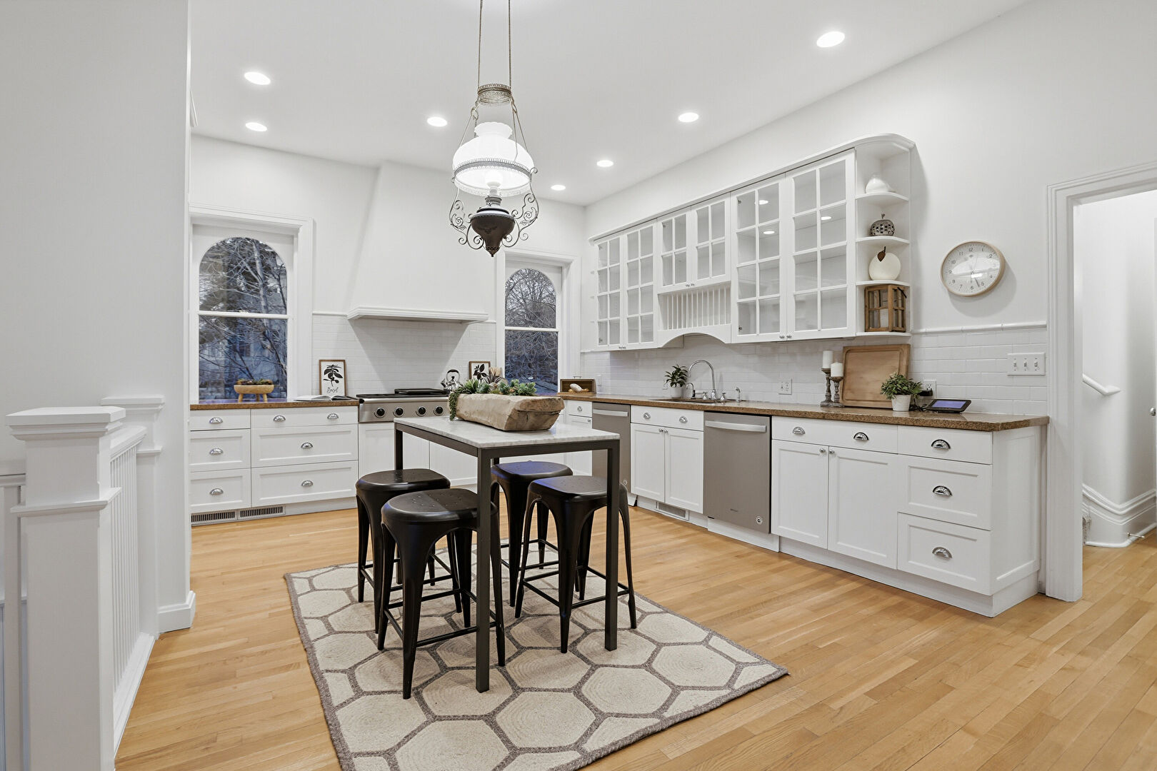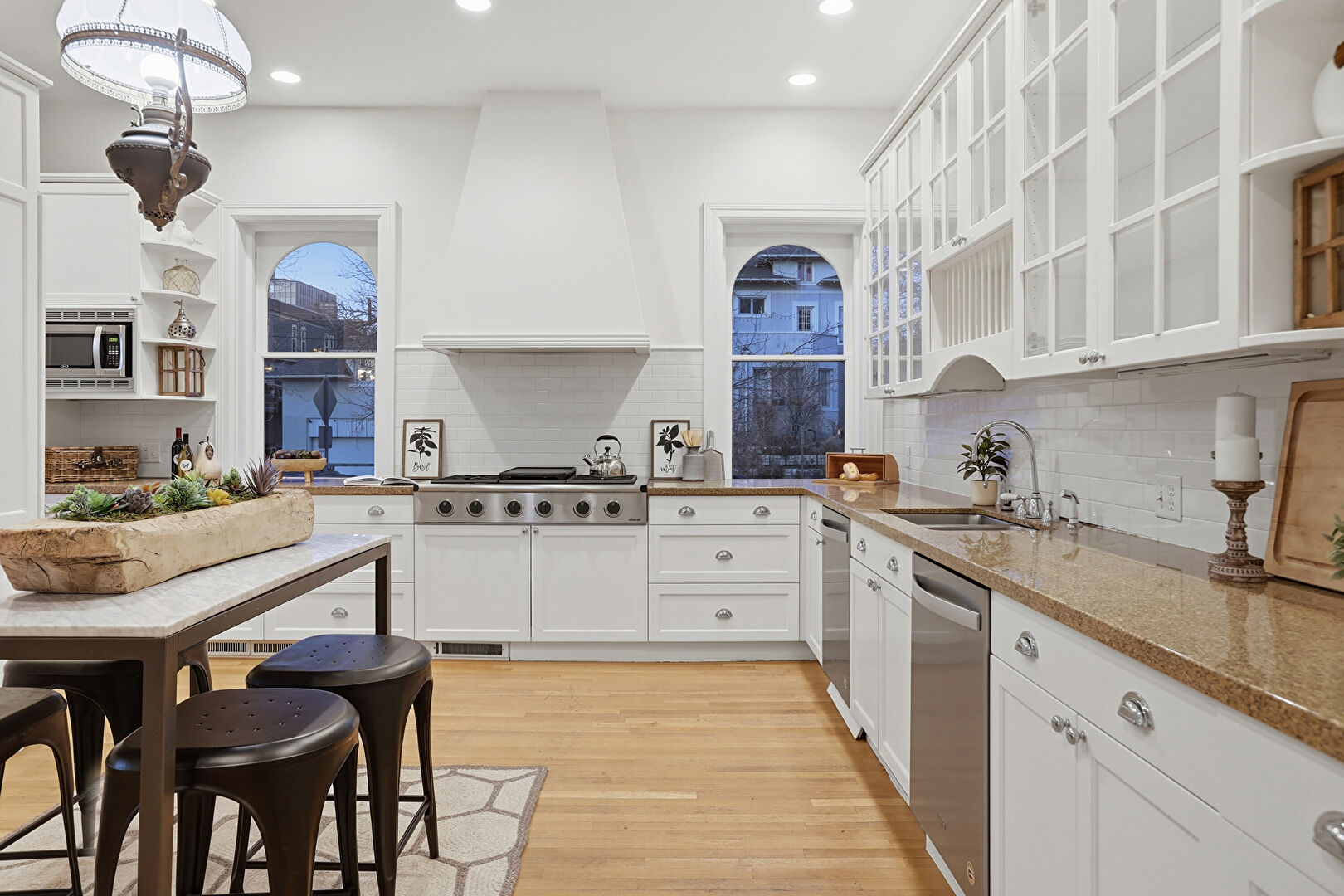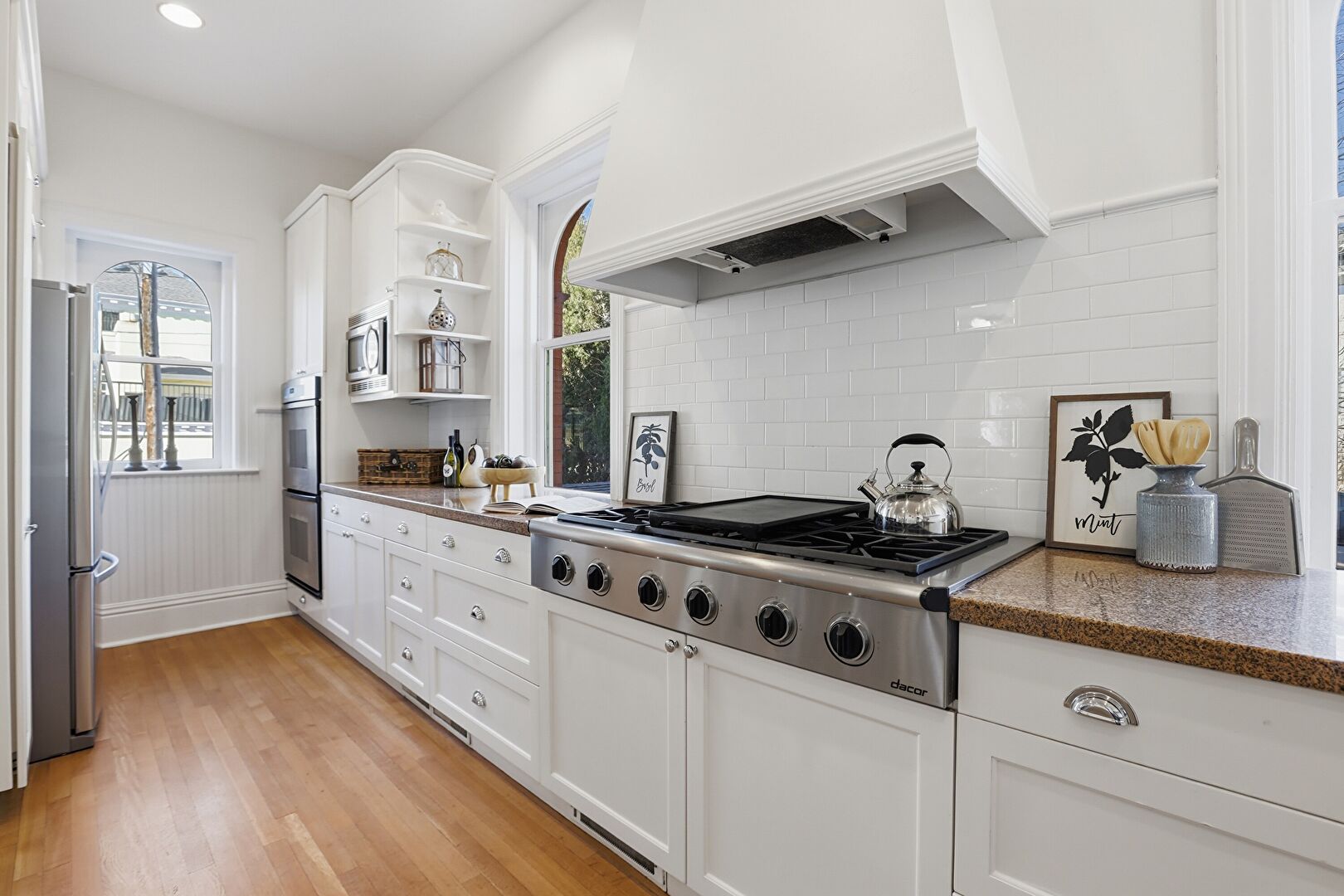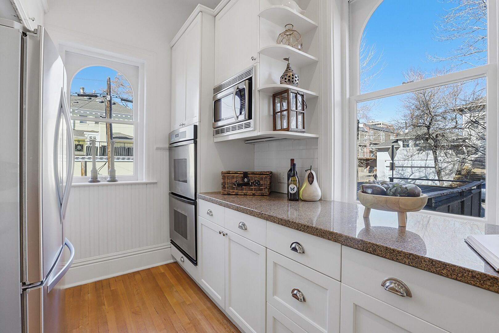 Arched Cabinets, Baseboard Radiator, Baseboards Wall, Crown Molding Cabinets, Double Oven, Drywall, Glass Insert Cabinets, Kitchen Bar, Kitchen Island, Kitchen Peninsula, Natural Light, One Wall Kitchen, Open Shelves, Opens To Living Area, Pendant Lighting, Raised Cabinets, Recessed Lighting, Shaker Cabinets, Skylight, Stone Countertops, Tile Floor, Trash Compactor, Vaulted Ceiling, Vent, Visible Hinge Cabinets, Wood Finish Floor, Baseboards Wall, Drywall, Kitchen Island, Natural Light, Open Shelves, Shaker Cabinets, Vent, Visible Hinge Cabinets