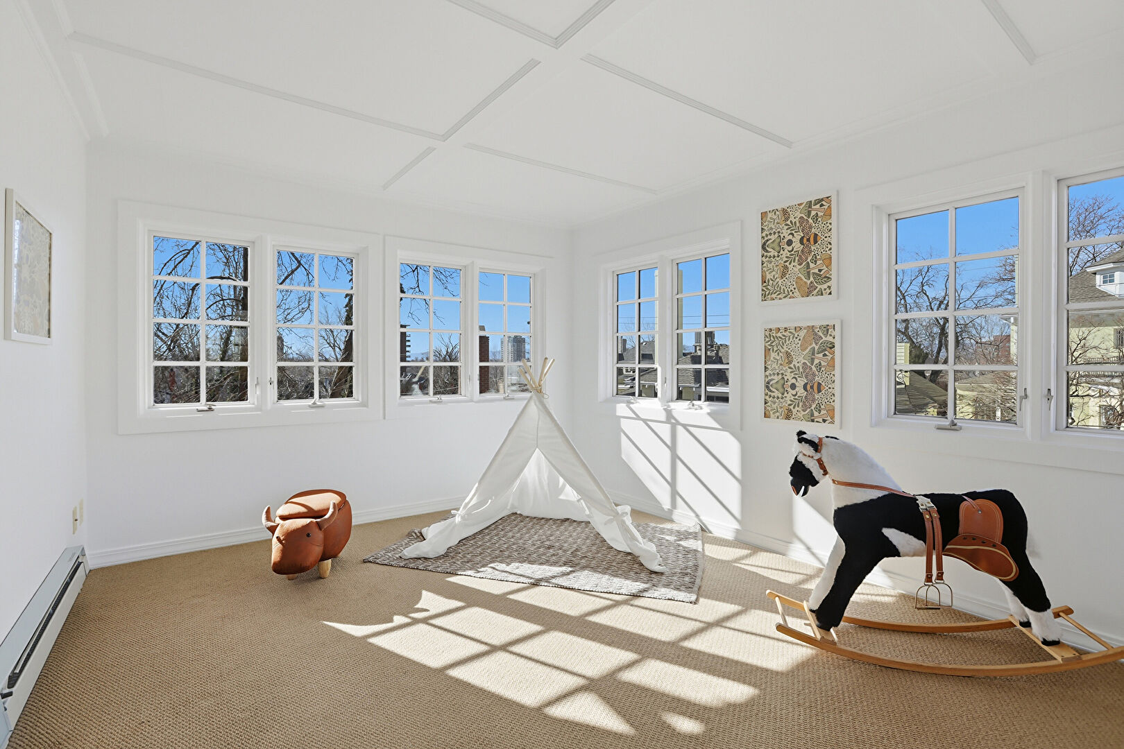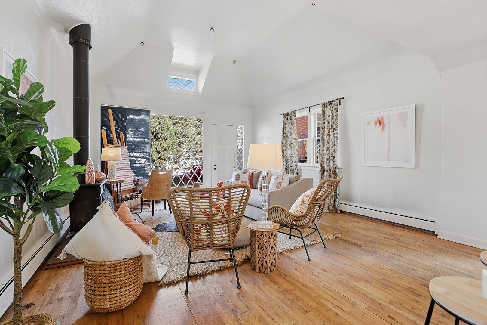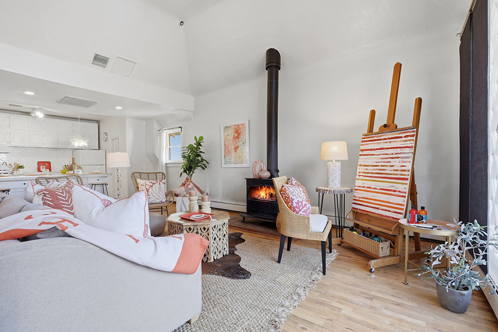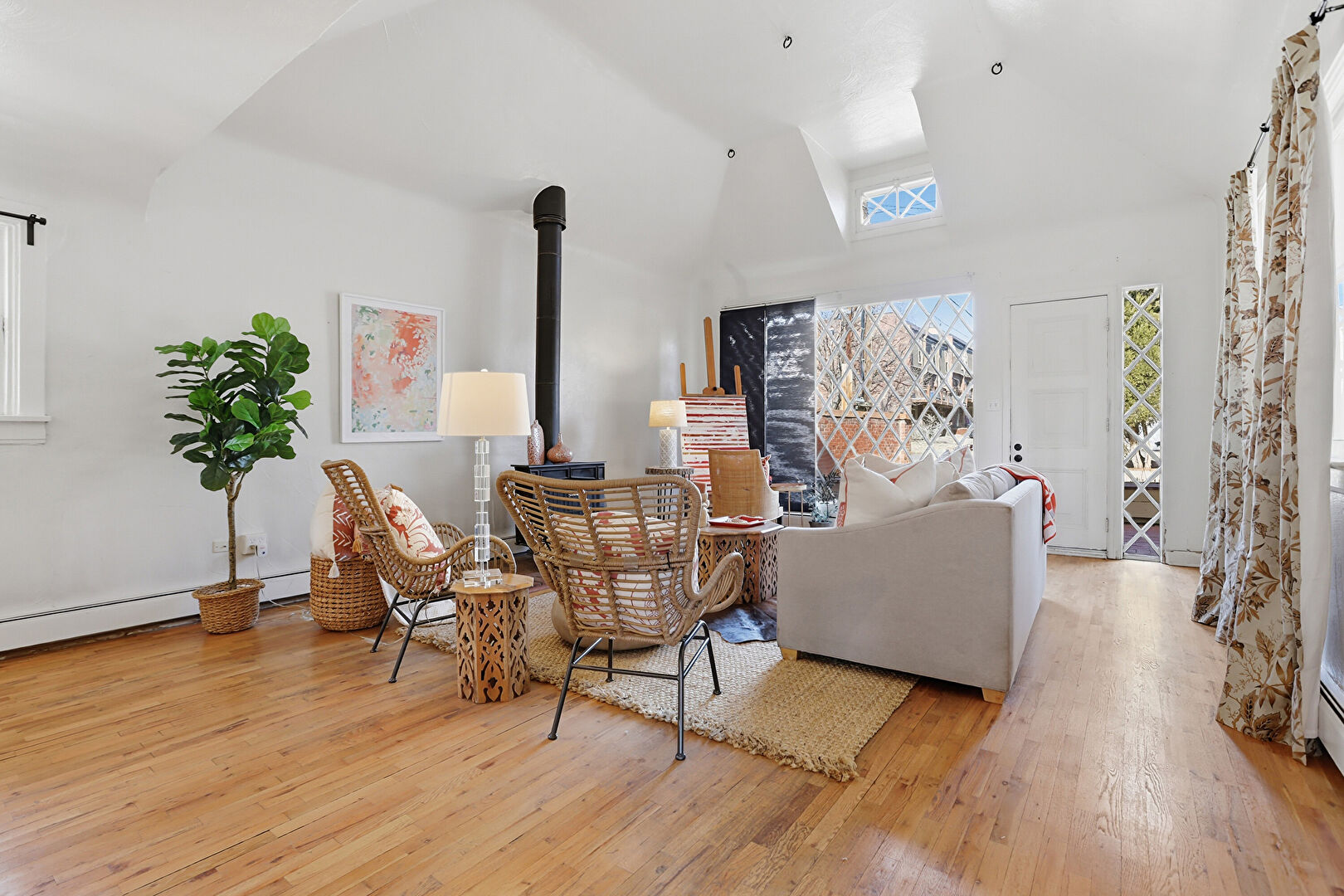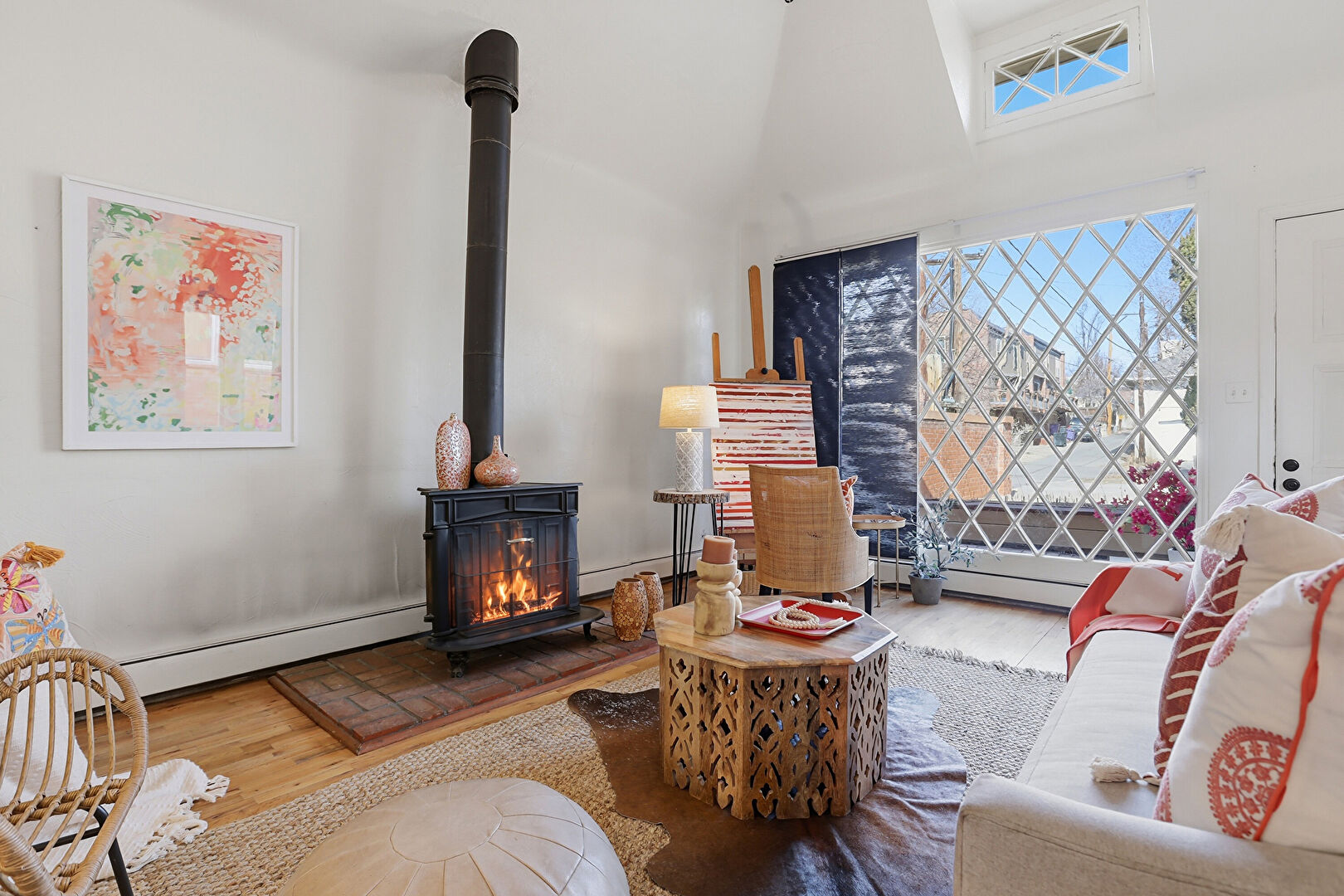 Baseboard Radiator, Baseboards Wall, Brick Siding, Dormer Roof, Downspout, Drywall, Fence, Gutters, High Ceiling, Natural Light, Radiator, Shingle Roof, Sunroom, Vaulted Ceiling, Wood Finish Floor, Wood Stove, Drywall, Natural Light, Patio, Shingle Roof, Stoop