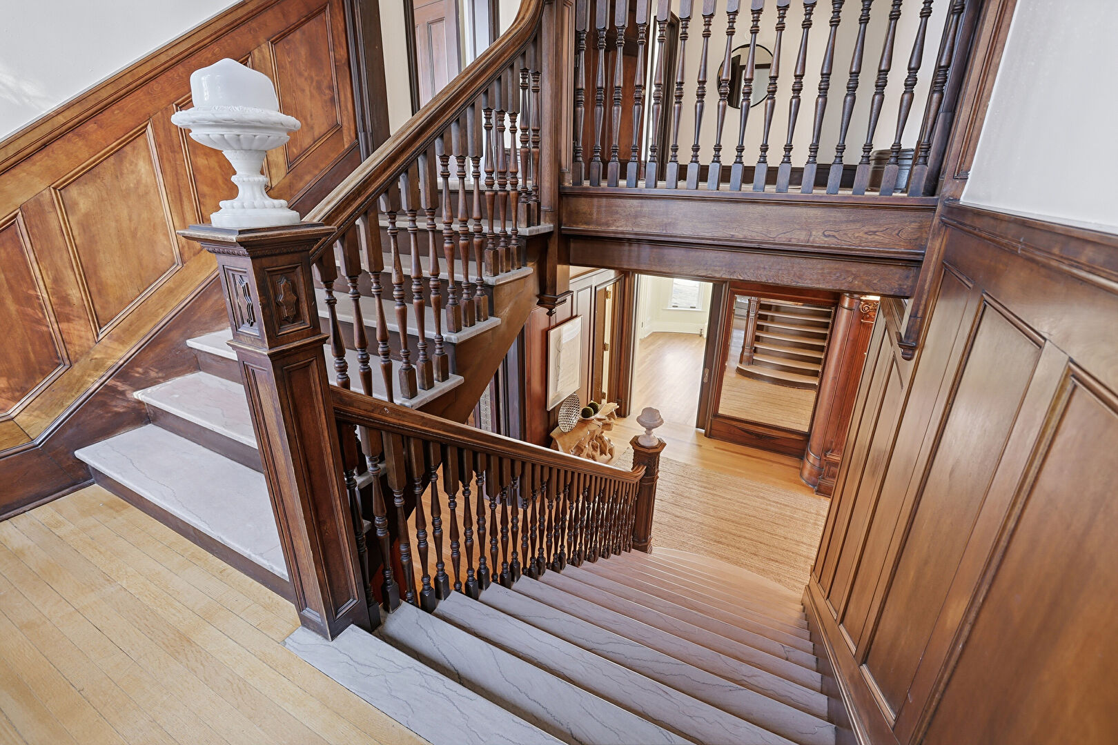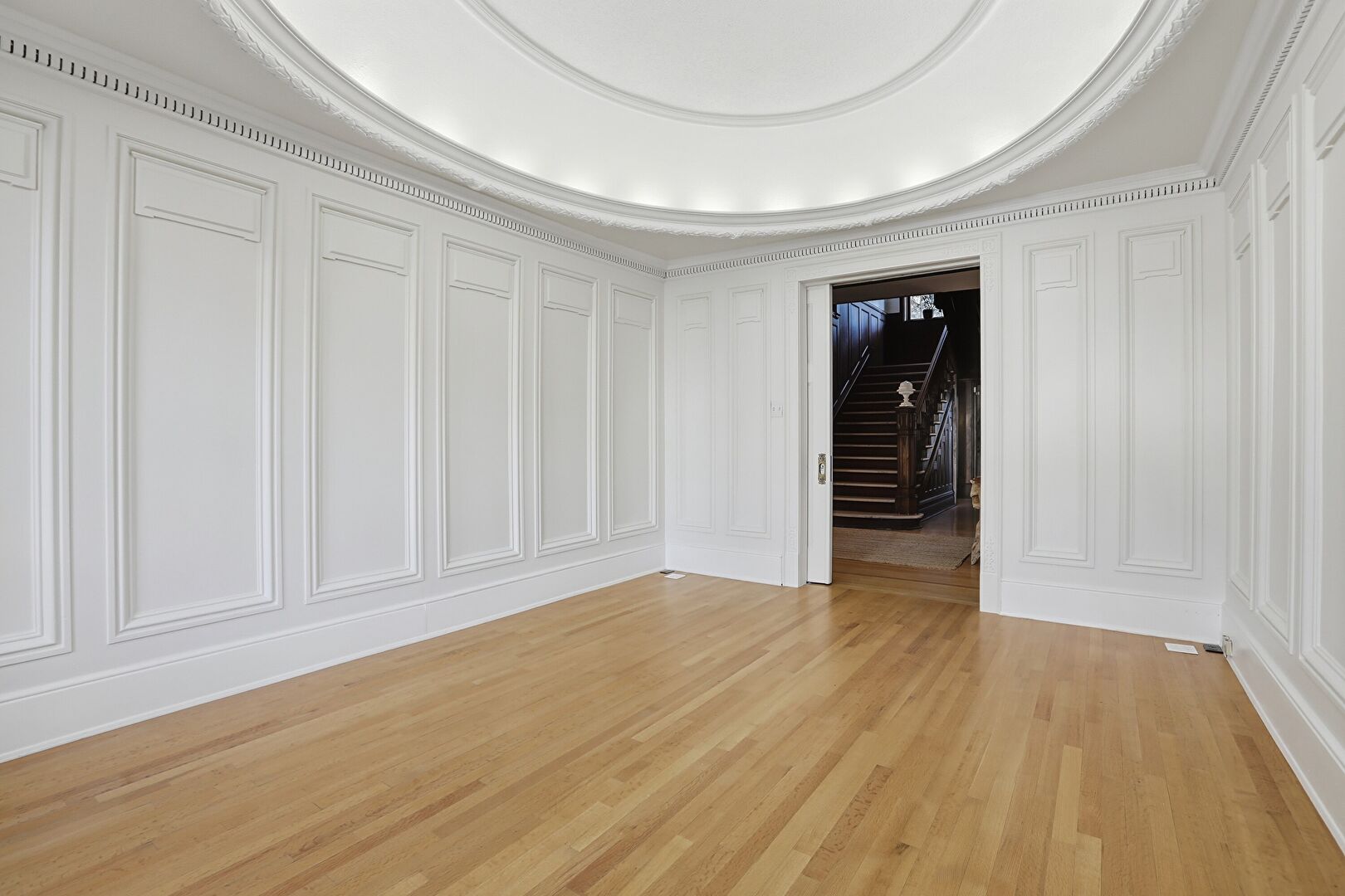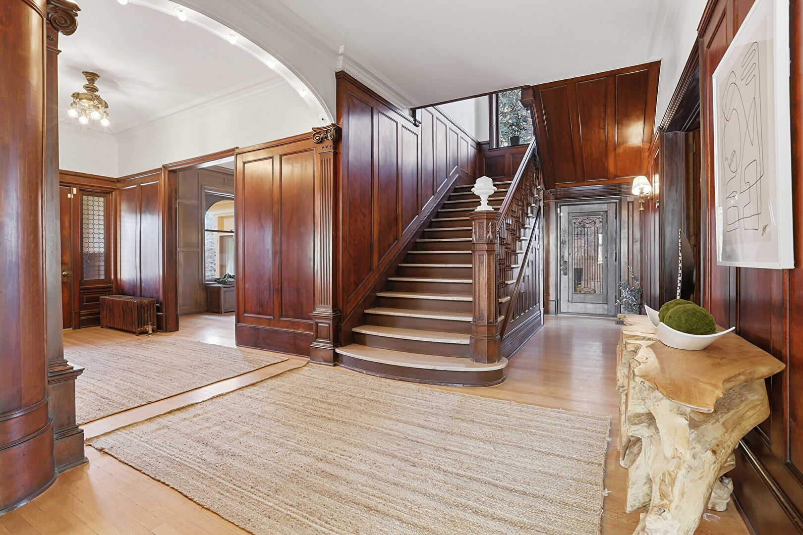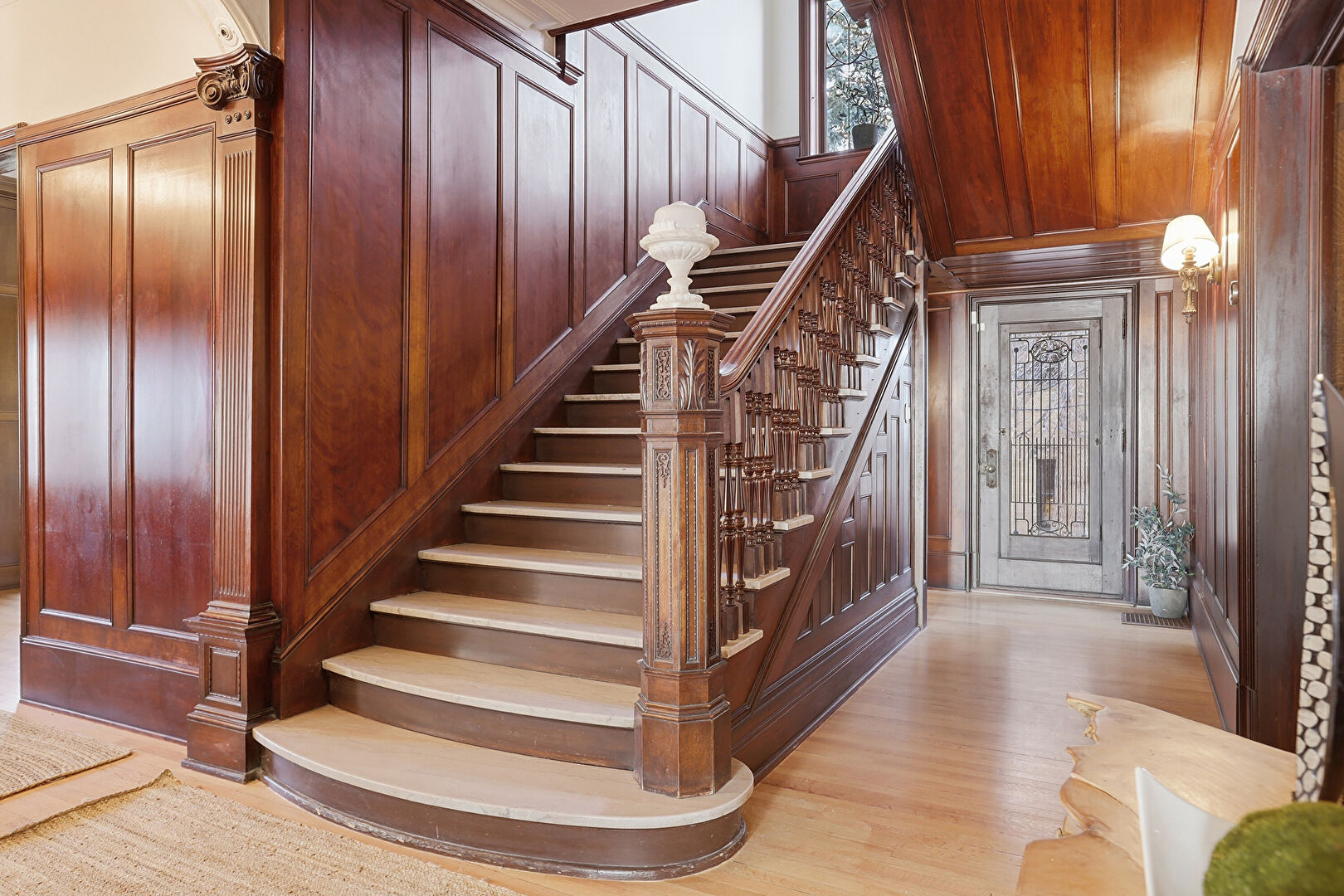 Arched Walkways, Crown Molding, Decorative Columns, Drywall, High Ceiling, Natural Light, Paneling Wall, Stairs, Wainscot Wall, Wood Finish Floor, Wood Wall, Natural Light, Wood Finish Floor