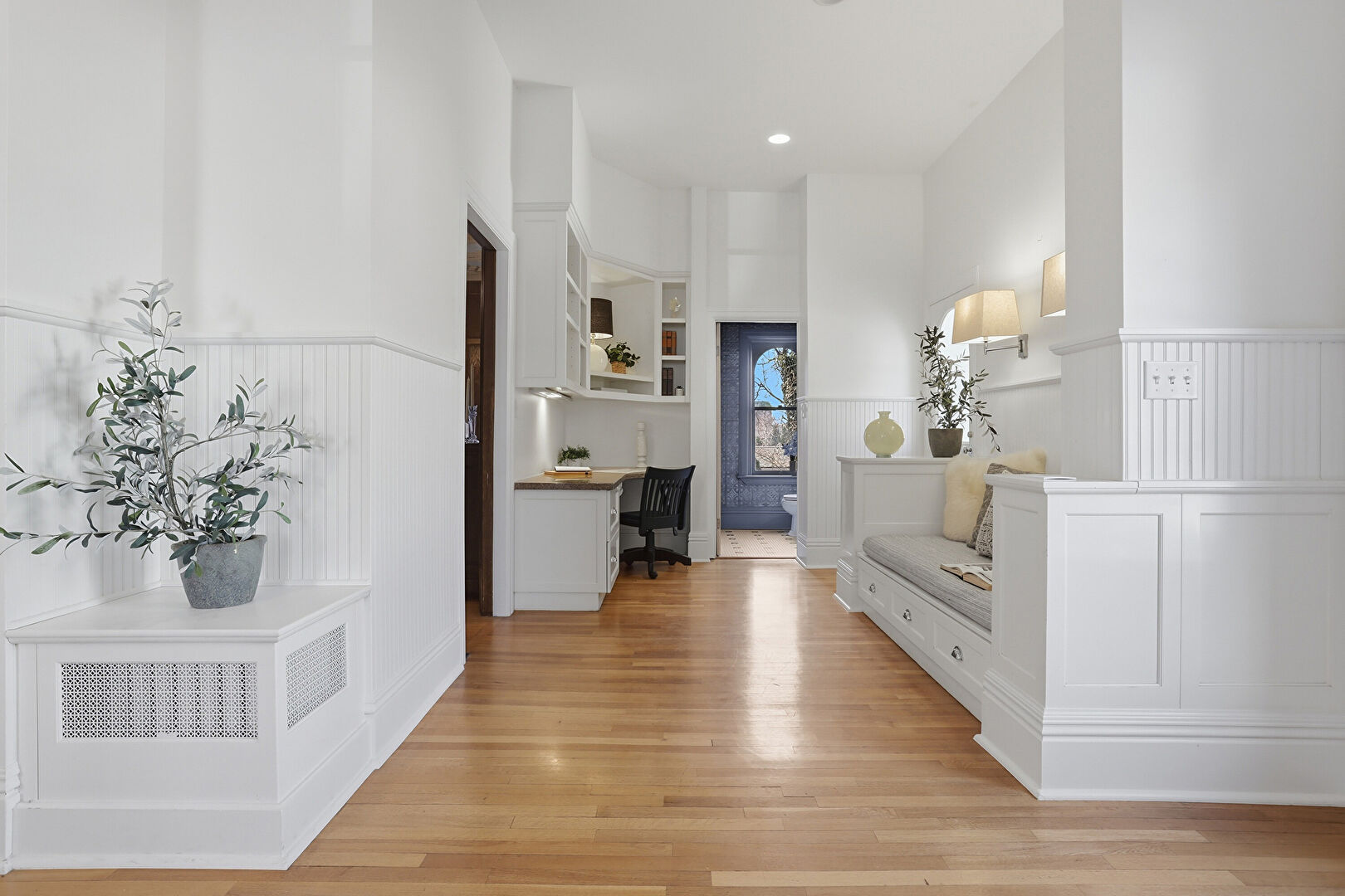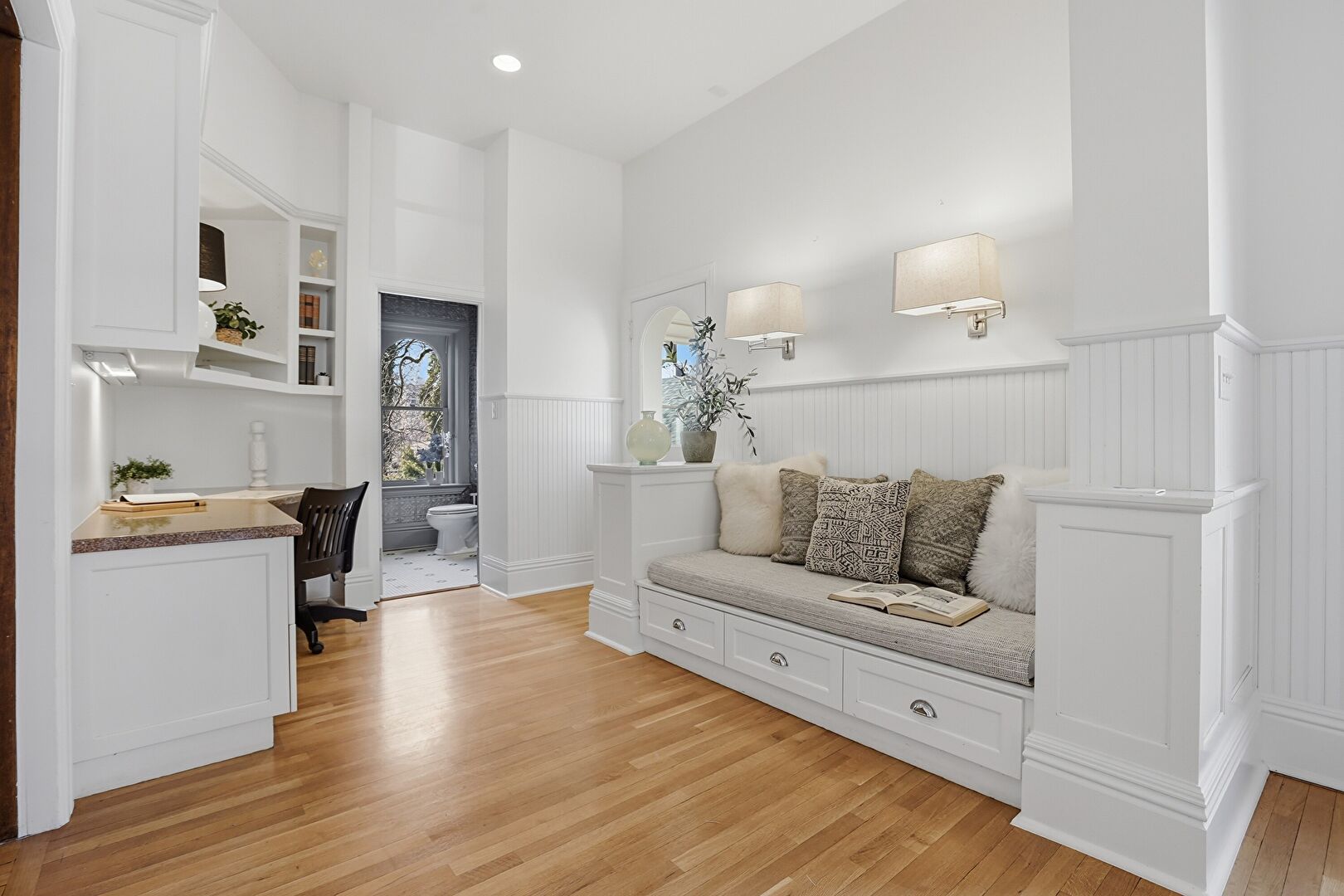Built In Shelves, Crown Molding, Drywall, High Ceiling, Natural Light, Office Area, Paneling Wall, Recessed Lighting, Upstairs Landing, Wainscot Wall, Wood Finish Floor, Baseboards Wall, Recessed Lighting, Wainscot Wall