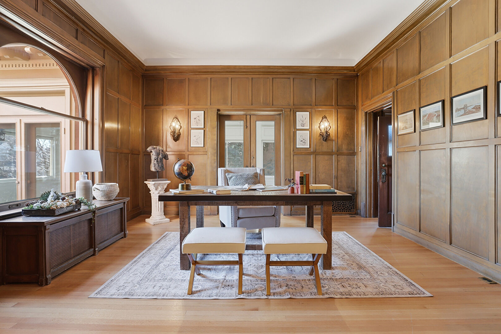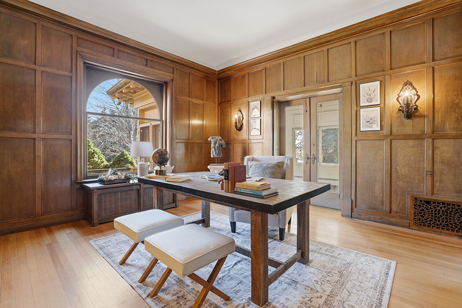 Crown Molding, French Doors, Natural Light, Office Area, Paneling Wall, Vent, Wood Finish Floor, Wood Wall, Crown Molding, Natural Light, Wood Wall