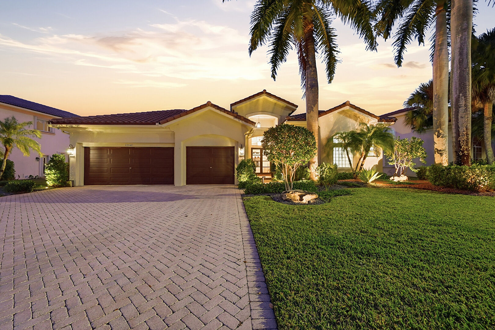 French Doors, Gutters, Stucco Siding, Tile Roof, Downspout
