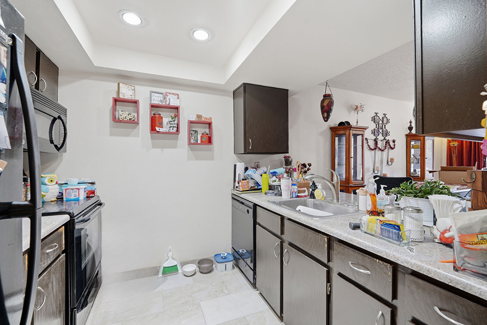 Baseboards Wall, Dark Brown Cabinets, Drywall, Gray Cabinets, Kitchen Bar, Kitchen Peninsula, Pass Through Window, Recessed Lighting, Stone Countertops, Textured Ceiling, Toaster, Tray Ceiling, Visible Hinge Cabinets, Drywall, Tile Floor