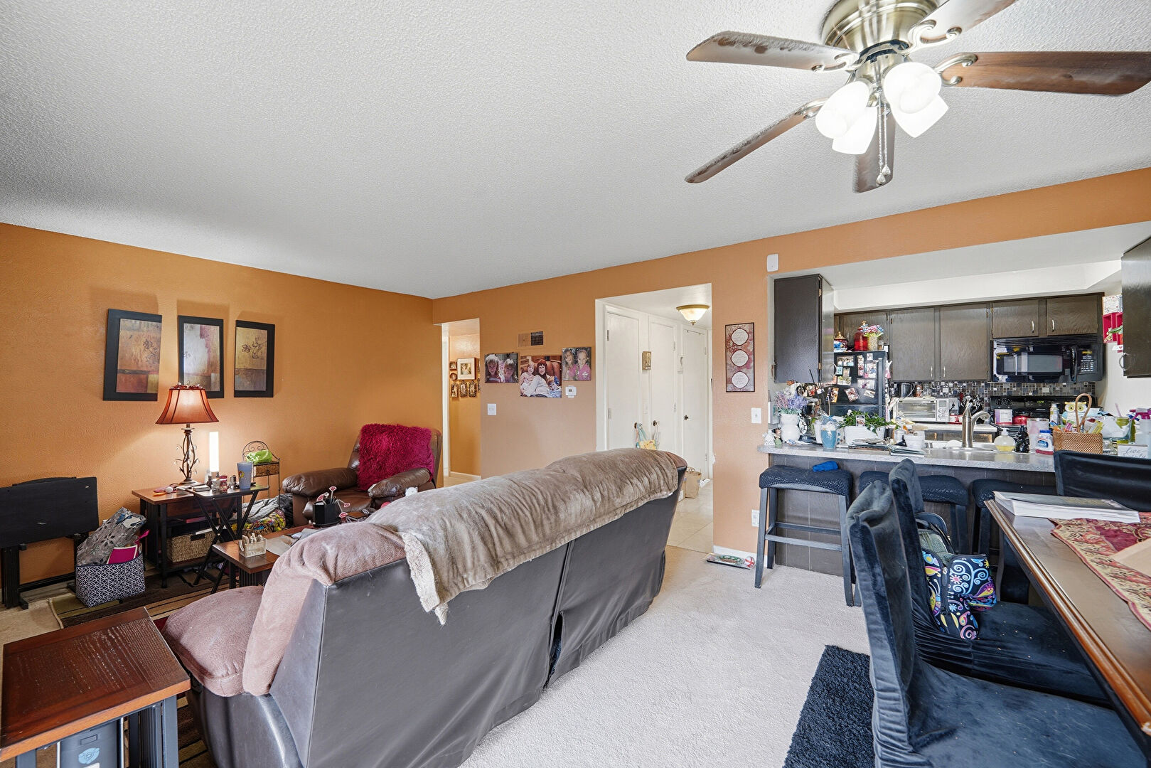 Carpet, Ceiling Fan, Drywall, Fireplace, Natural Light, Textured Ceiling, Baseboards Wall, Drywall