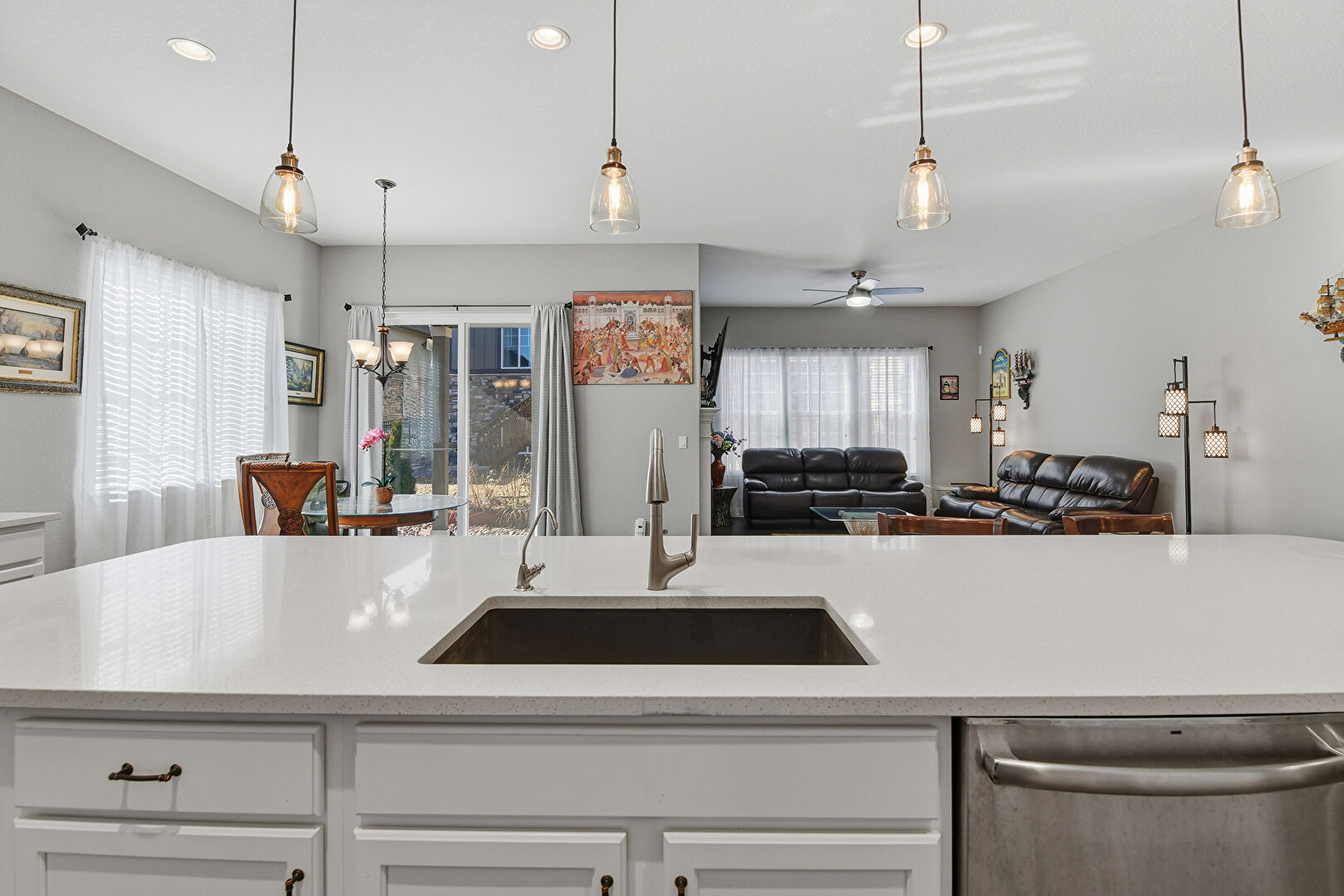 Baseboards Wall, Ceiling Fan, Crown Molding Cabinets, Double Oven, Drywall, Fireplace, Kitchen Bar, Kitchen Island, L Shaped Kitchen, Natural Light, Notable Chandelier, Opens To Living Area, Pendant Lighting, Recessed Lighting, Shaker Cabinets, Stone Countertops, Vent, Wood Finish Floor, Crown Molding Cabinets, Double Oven, Drywall, Notable Chandelier, Opens To Living Area, Recessed Lighting, Shaker Cabinets, Stone Countertops