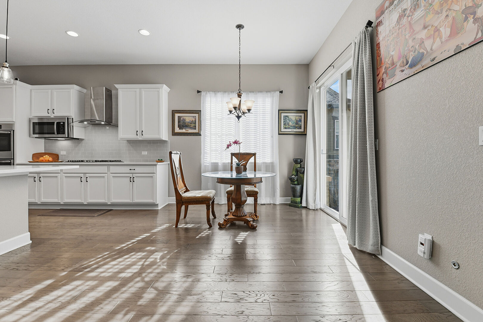 Baseboards Wall, Drywall, Natural Light, Notable Chandelier, Recessed Lighting, Wood Finish Floor, Baseboards Wall, Notable Chandelier
