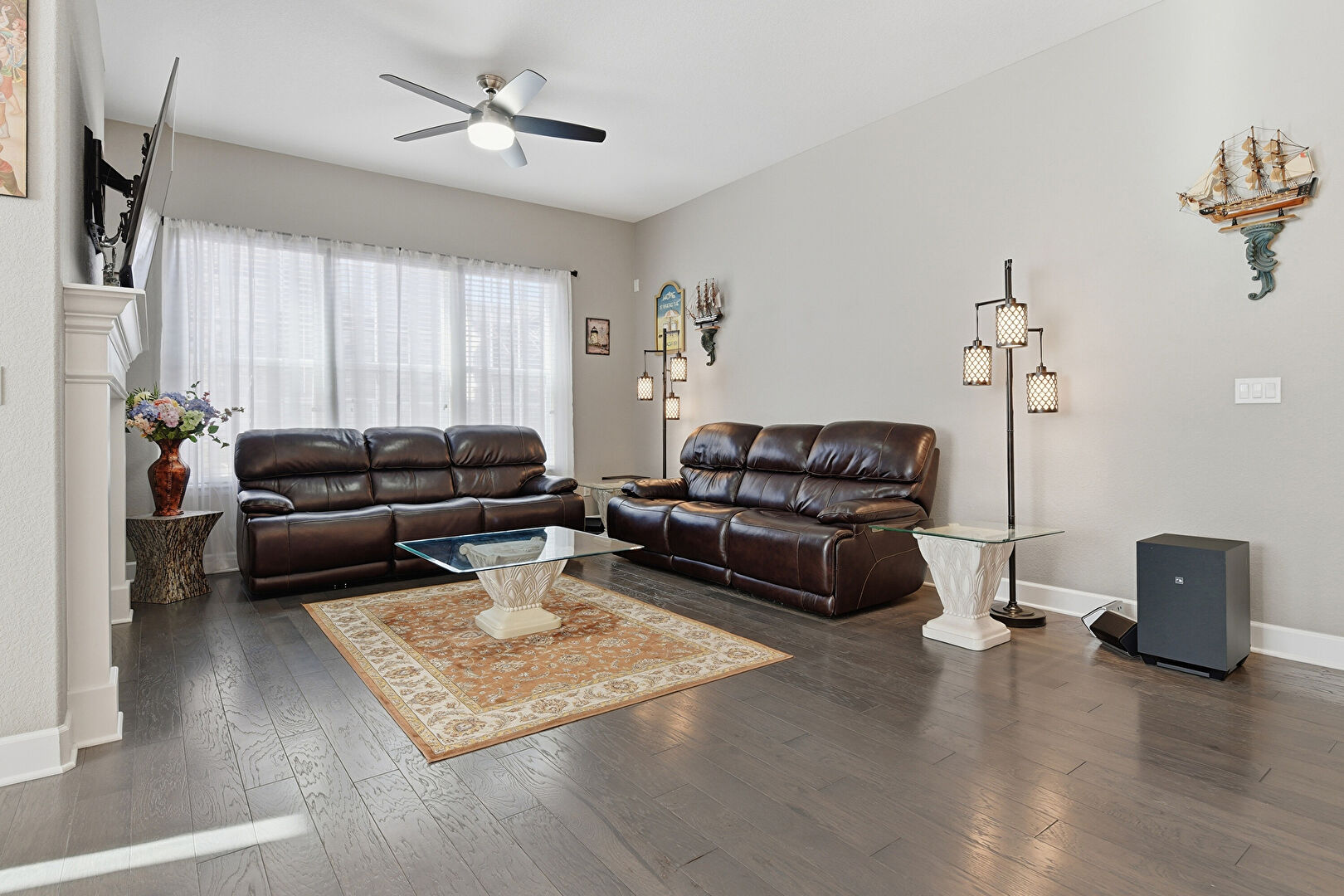Baseboards Wall, Ceiling Fan, Double Oven, Drywall, Fireplace, Natural Light, Recessed Lighting, Wood Finish Floor, Baseboards Wall, L Shaped Kitchen, Wood Finish Floor
