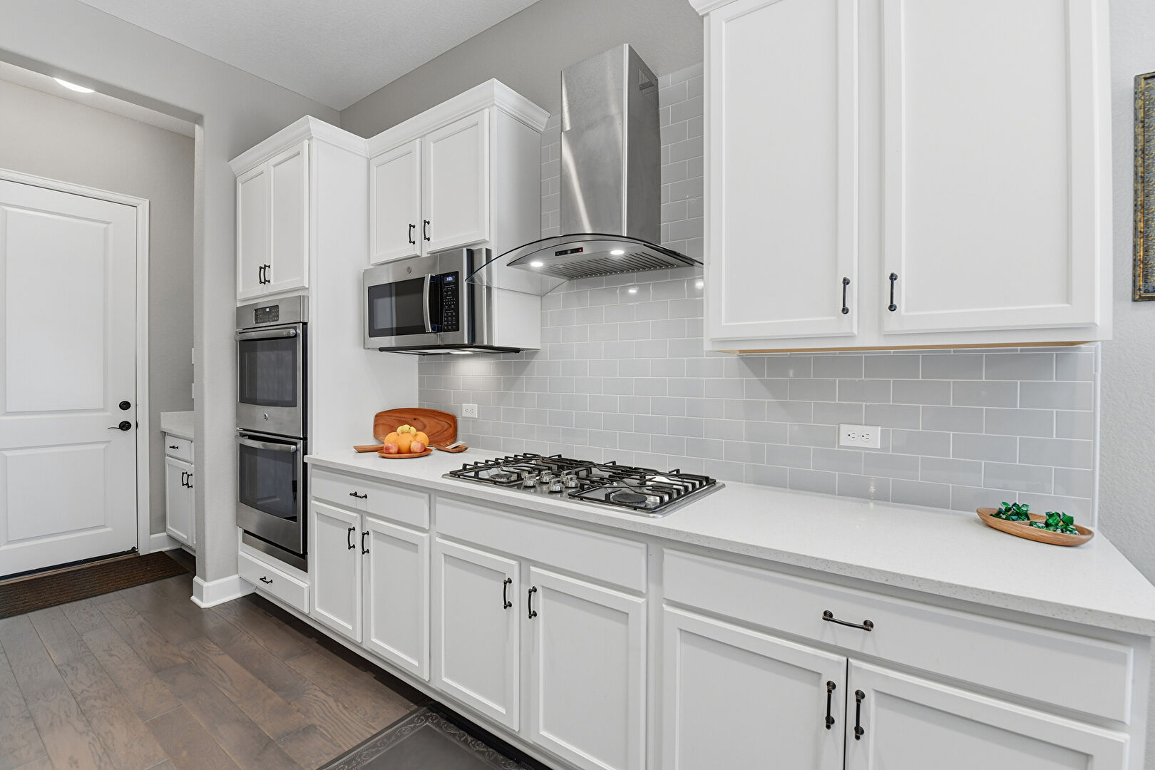 Baseboards Wall, Ceiling Fan, Crown Molding Cabinets, Double Oven, Drywall, Natural Light, Notable Chandelier, Pendant Lighting, Recessed Lighting, Shaker Cabinets, Stone Countertops, Wood Finish Floor, Textured Wall, Wood Finish Floor