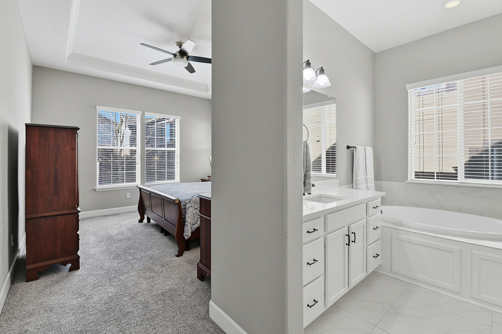 Baseboards Wall, Carpet, Ceiling Fan, Drywall, Ensuite Bathroom, Full Bathroom, Marble Finish Floor, Natural Light, Vanity, Water Closet, Marble Finish Floor, Natural Light, Two Single Vanities, Vanity