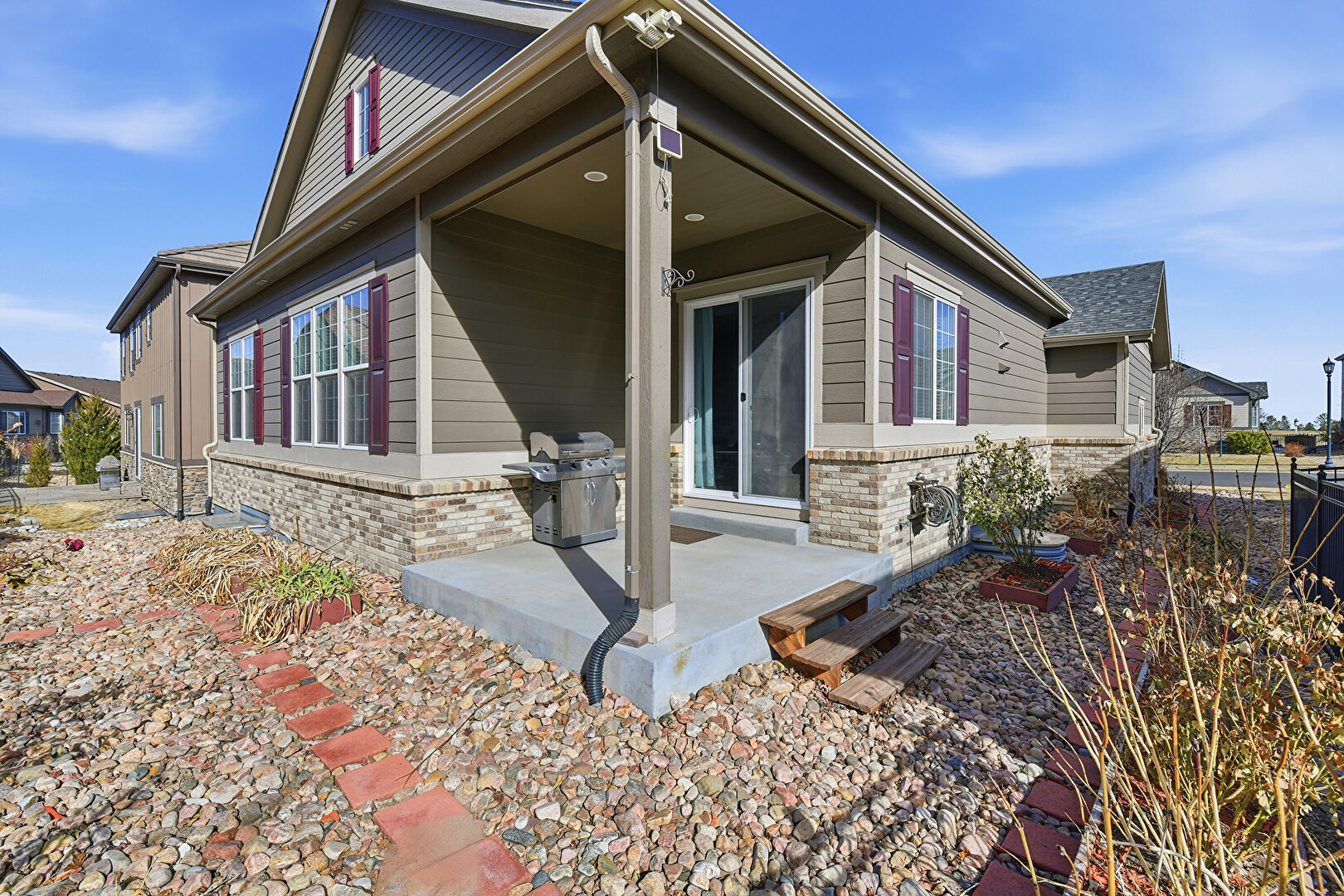 Concrete Foundation, Downspout, Fence, Grill, Gutters, Horizontal Siding, Porch, Stone Siding, Brick Siding