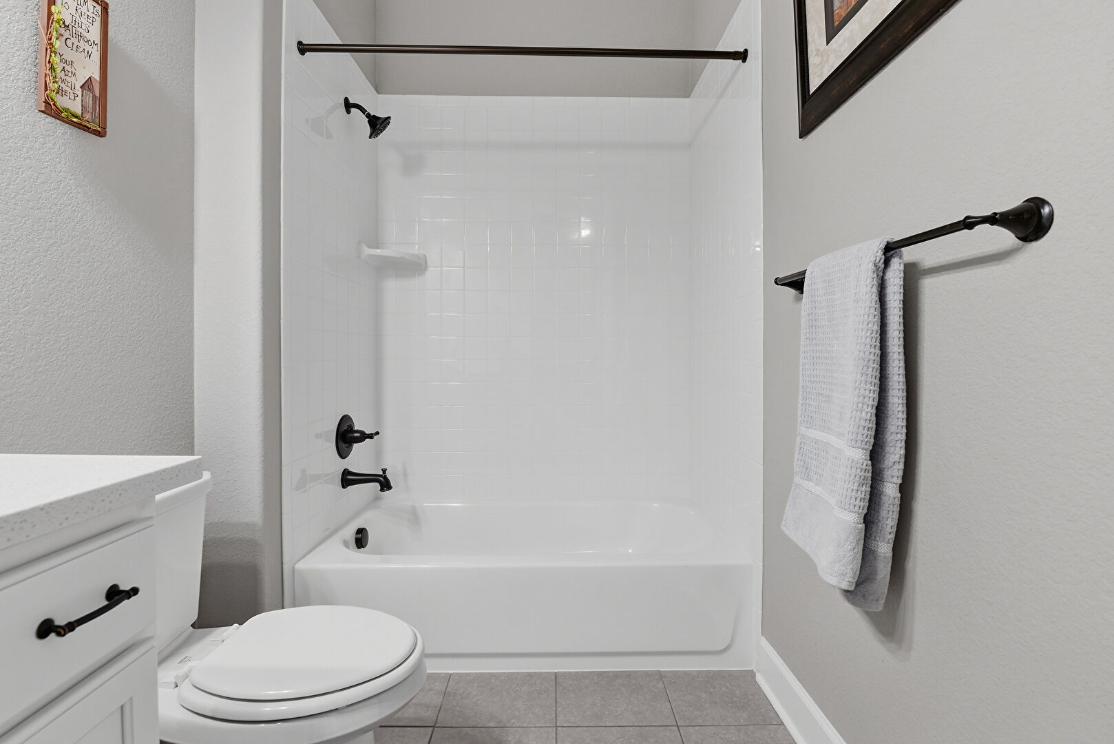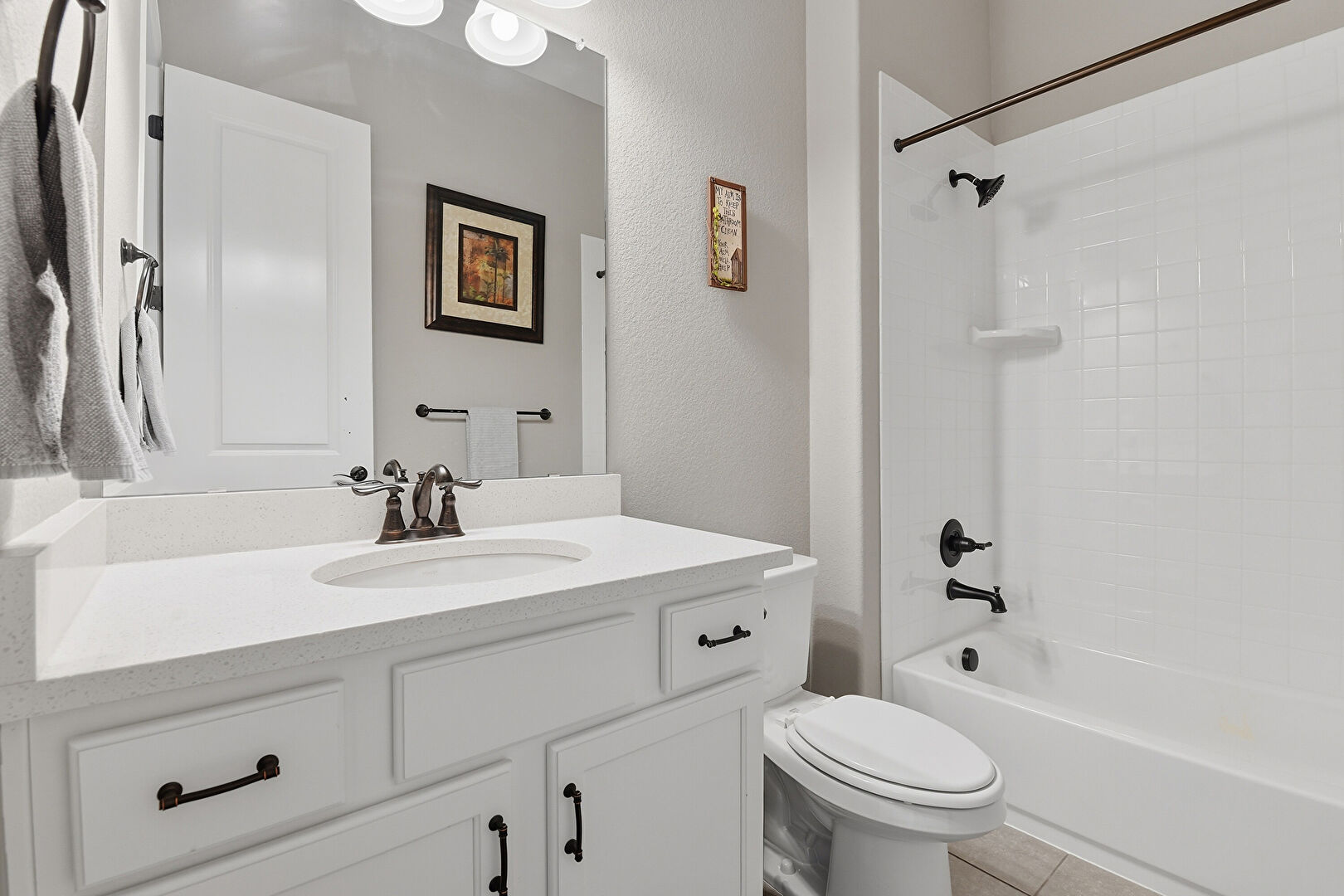Baseboards Wall, Combined Bath Shower, Full Bathroom, Half Bathroom, Textured Wall, Tile Floor, Vanity, Combined Bath Shower, Full Bathroom, Tile Floor, Vanity