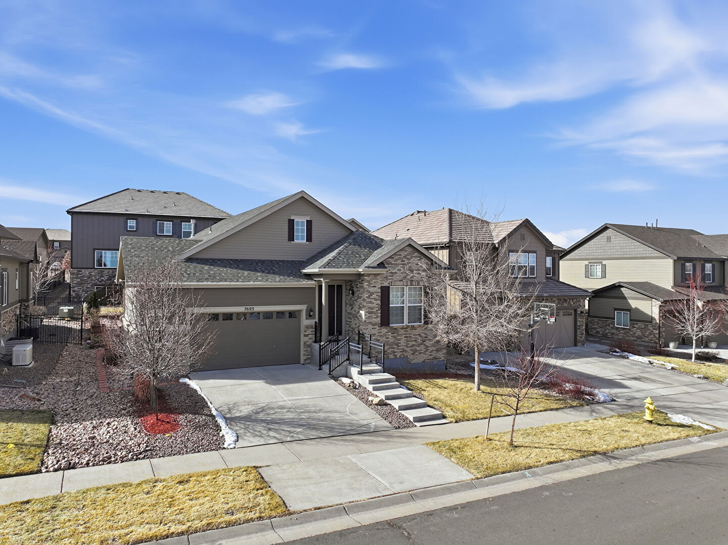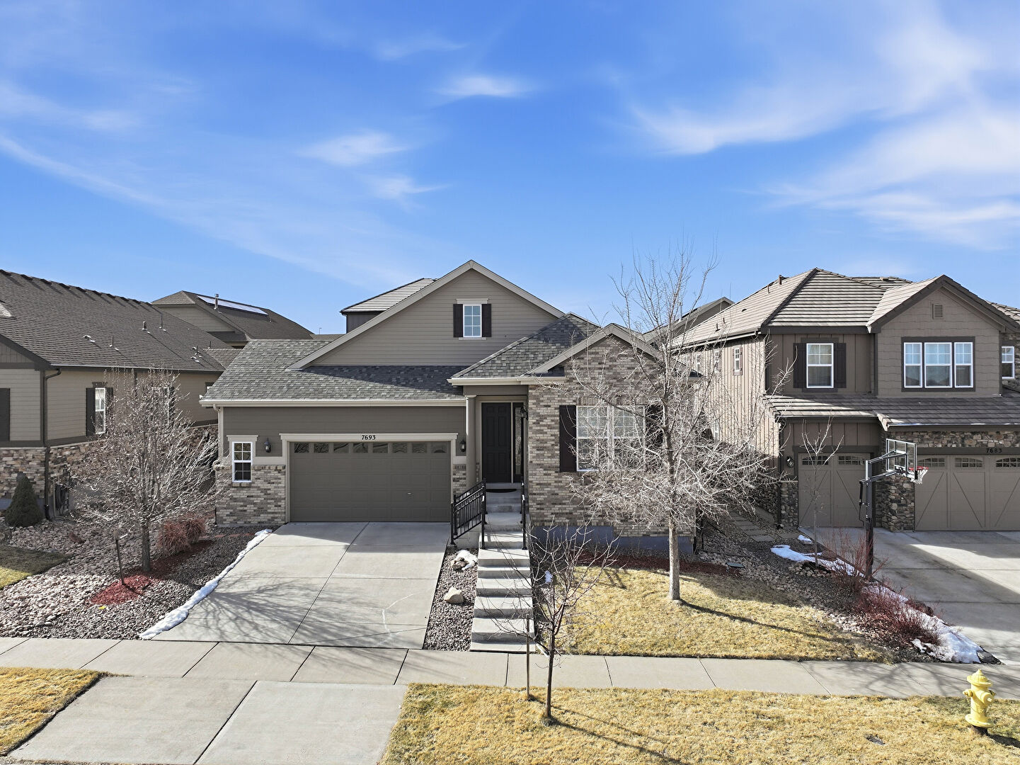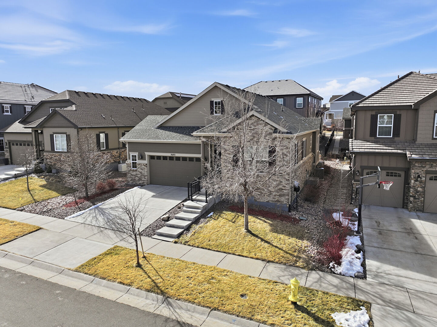 Brick Siding, Central Ac, Concrete Foundation, Downspout, Driveway, Gutters, Lawn, Residential View, Shingle Roof, Stone Siding, Stoop, Horizontal Siding, Stoop