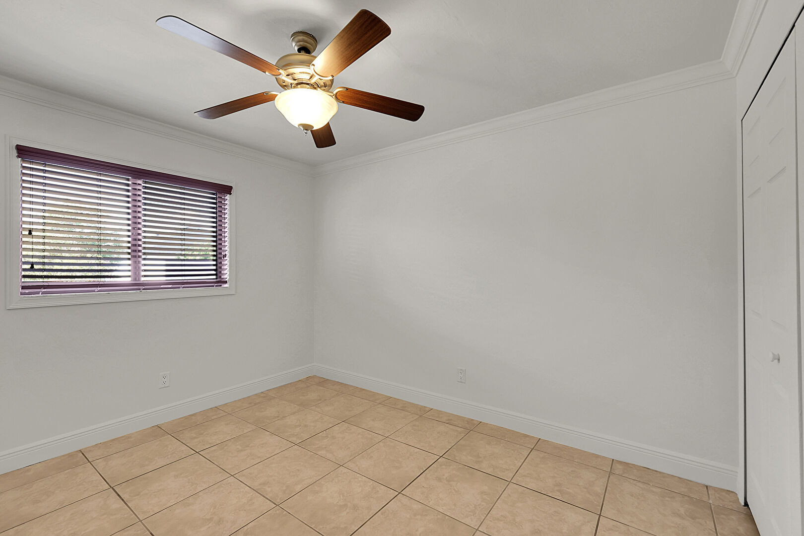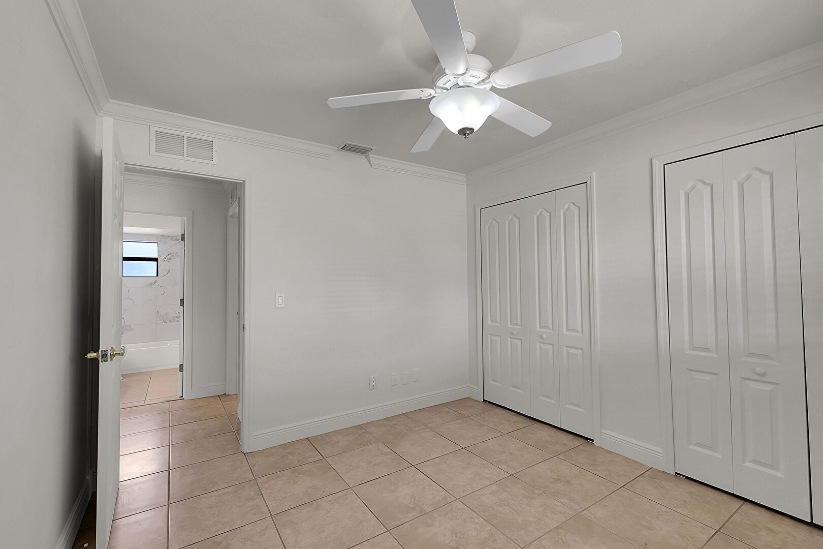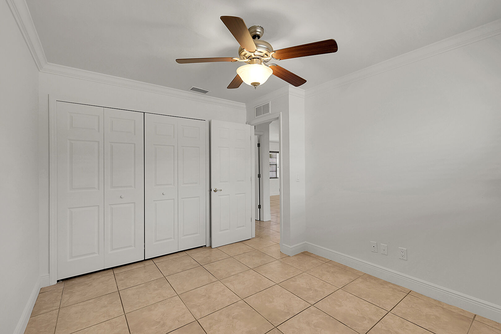 Baseboards Wall, Ceiling Fan, Crown Molding, Drywall, Natural Light, Tile Floor, Two Closets, Vent, Closet, Crown Molding, Tile Floor, Two Closets