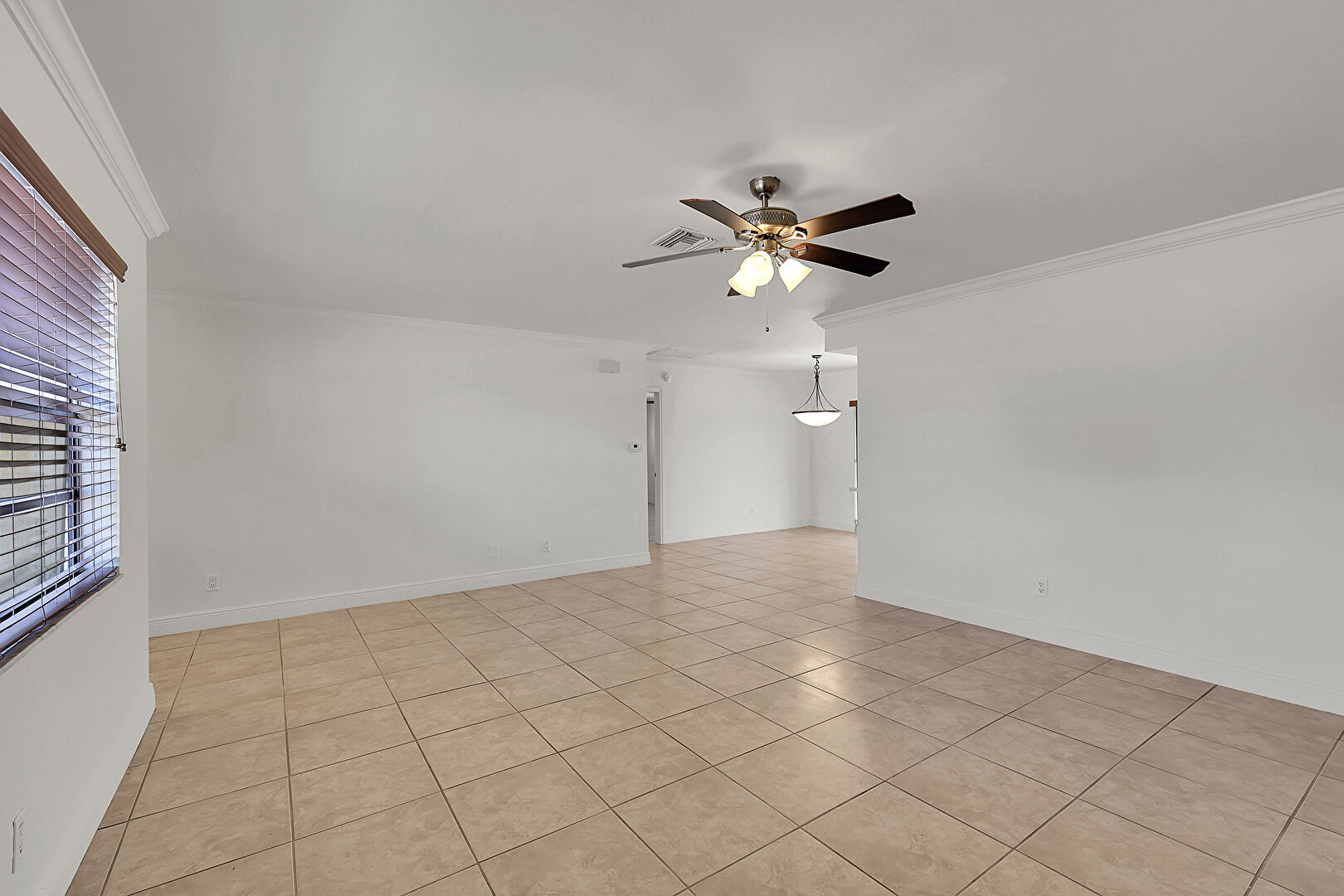 Baseboards Wall, Ceiling Fan, Crown Molding, Drywall, Natural Light, Tile Floor, Vent, Crown Molding, Drywall, Natural Light