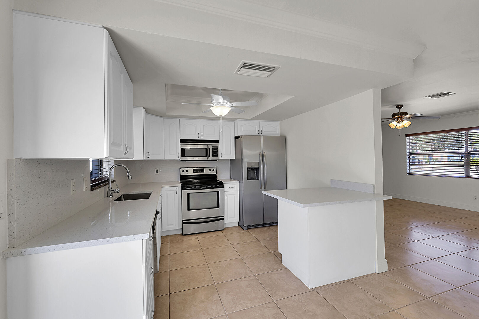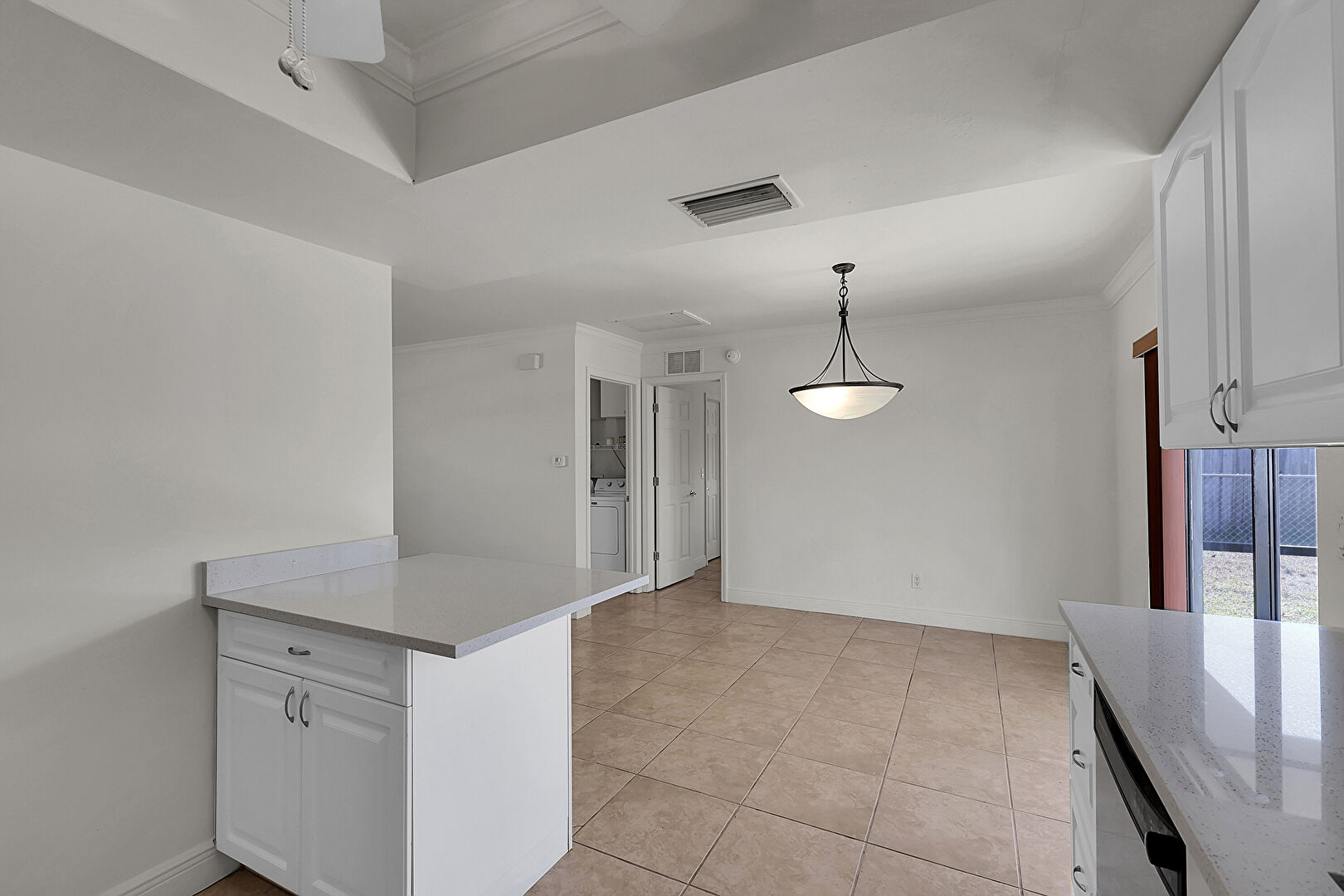 Arched Cabinets, Baseboards Wall, Ceiling Fan, Crown Molding, Drywall, Kitchen Peninsula, Laundry, Natural Light, Opens To Living Area, Pendant Lighting, Raised Cabinets, Smoke Carbon Monoxide Detector, Stone Countertops, Tile Floor, Tray Ceiling, U Shaped Kitchen, Vent, Washer Dryer, Arched Cabinets, Kitchen Peninsula, Stone Countertops