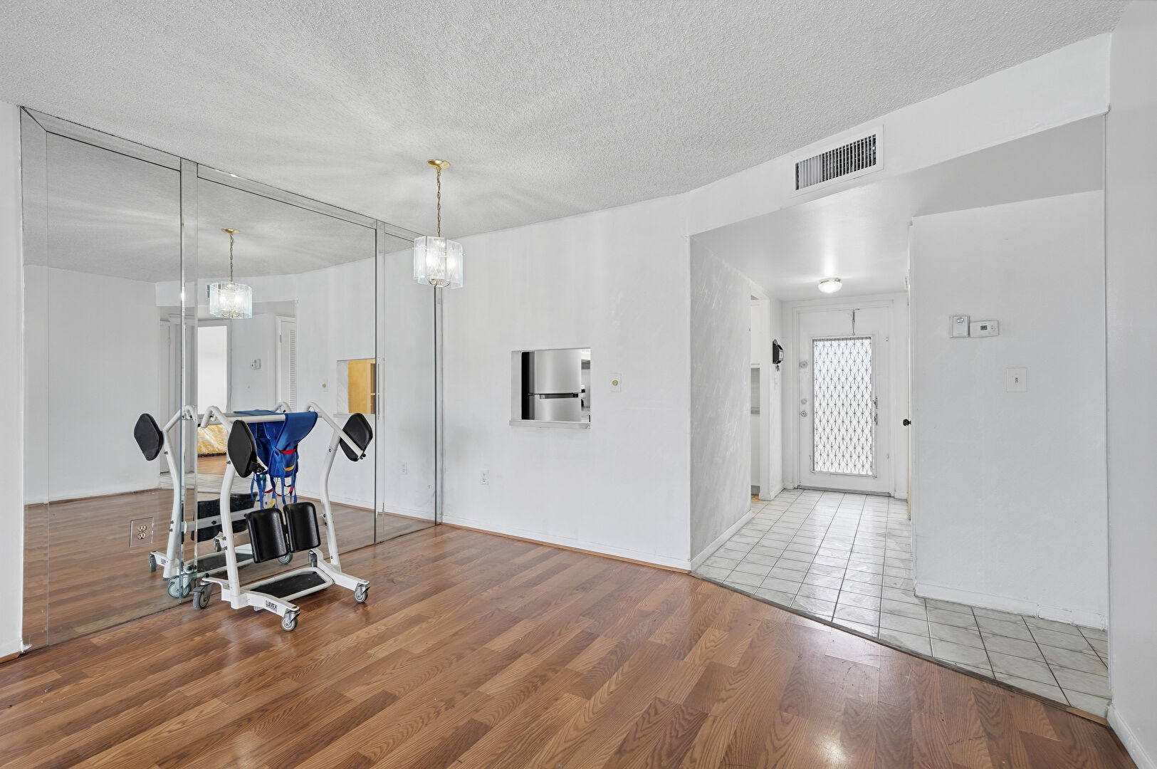 Ceiling Fan, Drywall, Natural Light, Textured Ceiling, Tile Floor, Vent, Wood Finish Floor, Notable Chandelier, Textured Ceiling