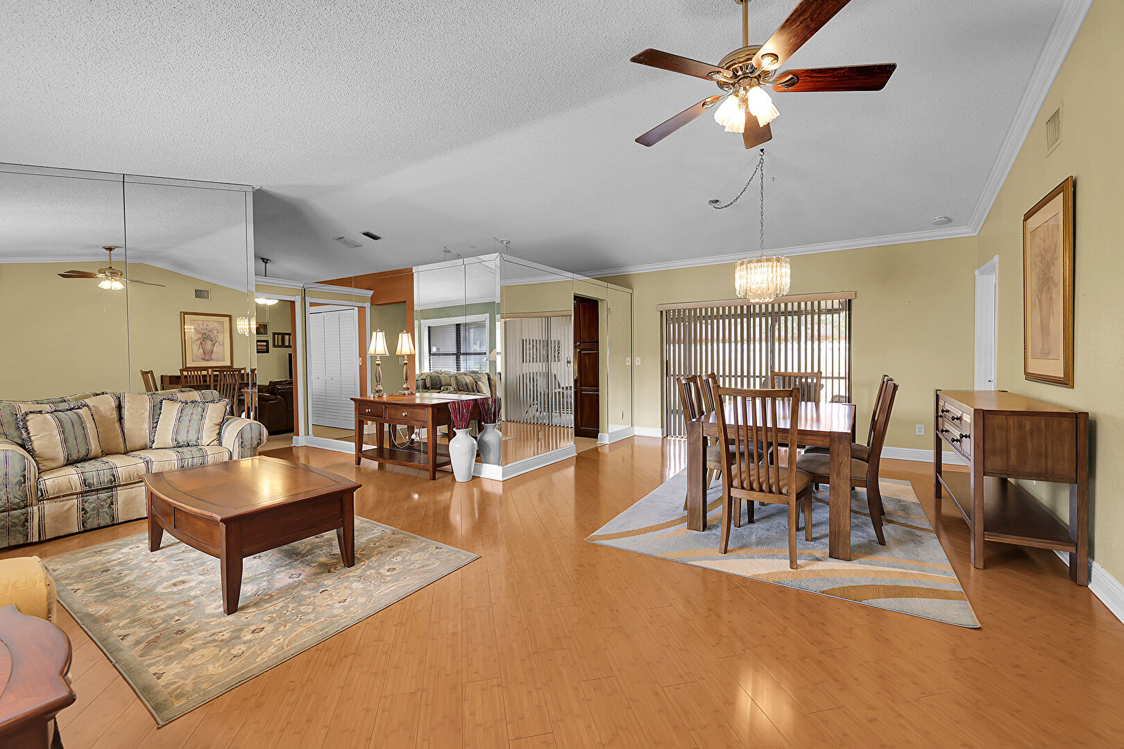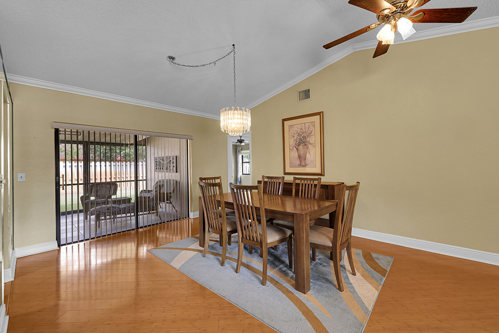 Baseboards Wall, Cathedral Ceiling, Ceiling Fan, Crown Molding, Drywall, Natural Light, Notable Chandelier, Smoke Carbon Monoxide Detector, Textured Ceiling, Vaulted Ceiling, Vent, Wood Finish Floor, Natural Light, Notable Chandelier, Vaulted Ceiling, Vent