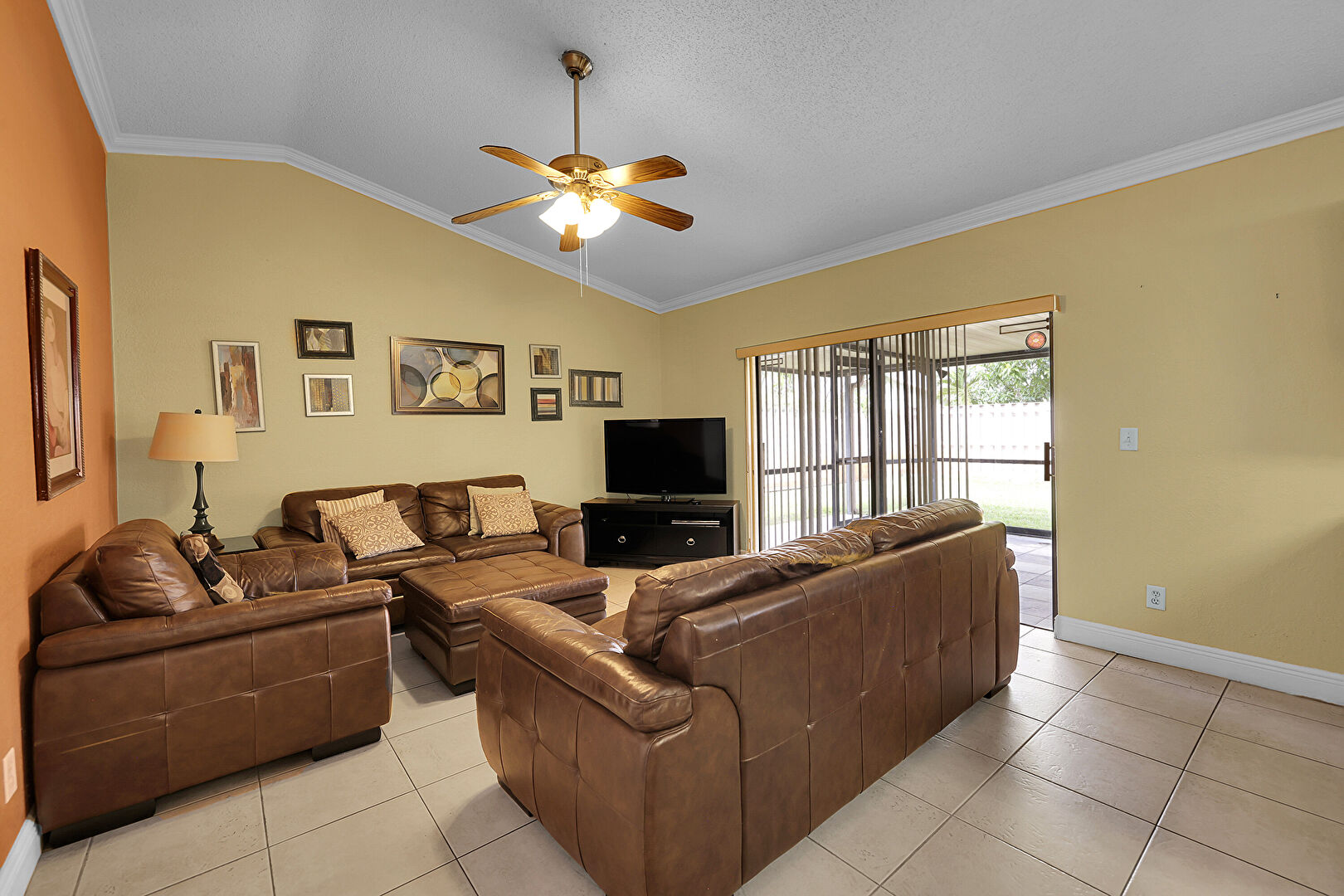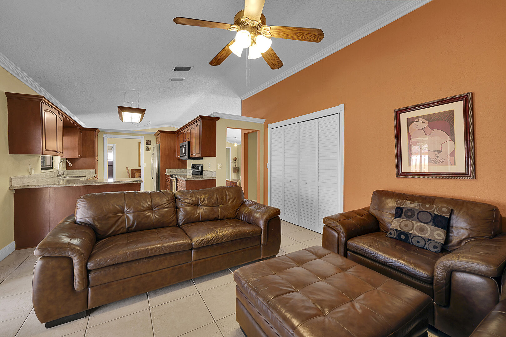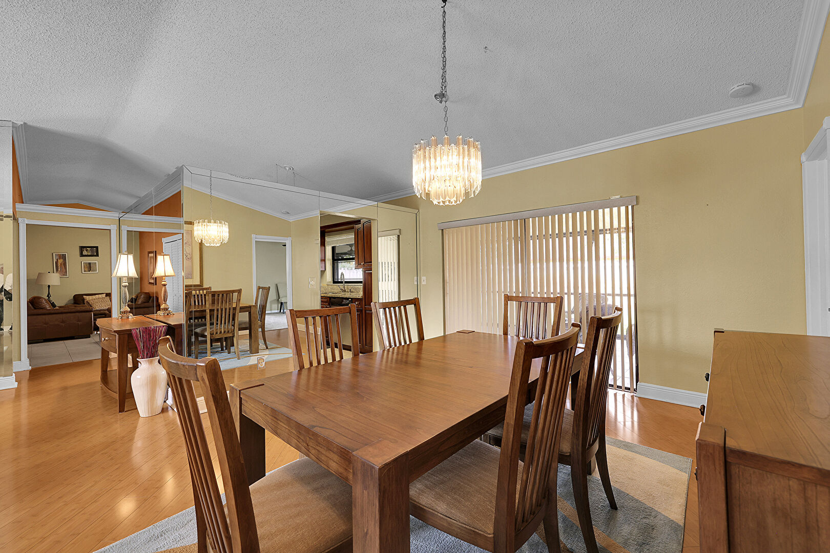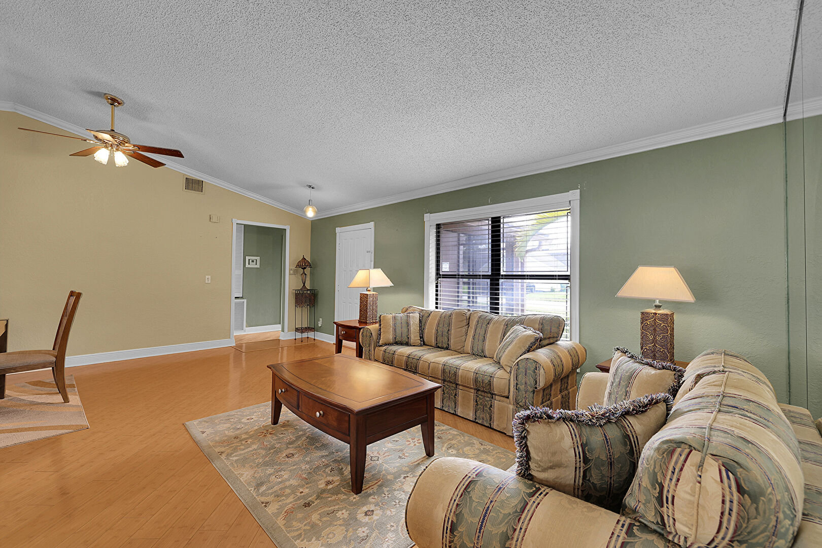 Baseboards Wall, Cathedral Ceiling, Ceiling Fan, Crown Molding, Drywall, G Shaped Kitchen, Natural Light, Notable Chandelier, Textured Ceiling, Tile Floor, Vaulted Ceiling, Vent, Wood Finish Floor, Baseboards Wall, Crown Molding, Drywall, Natural Light, Wood Finish Floor