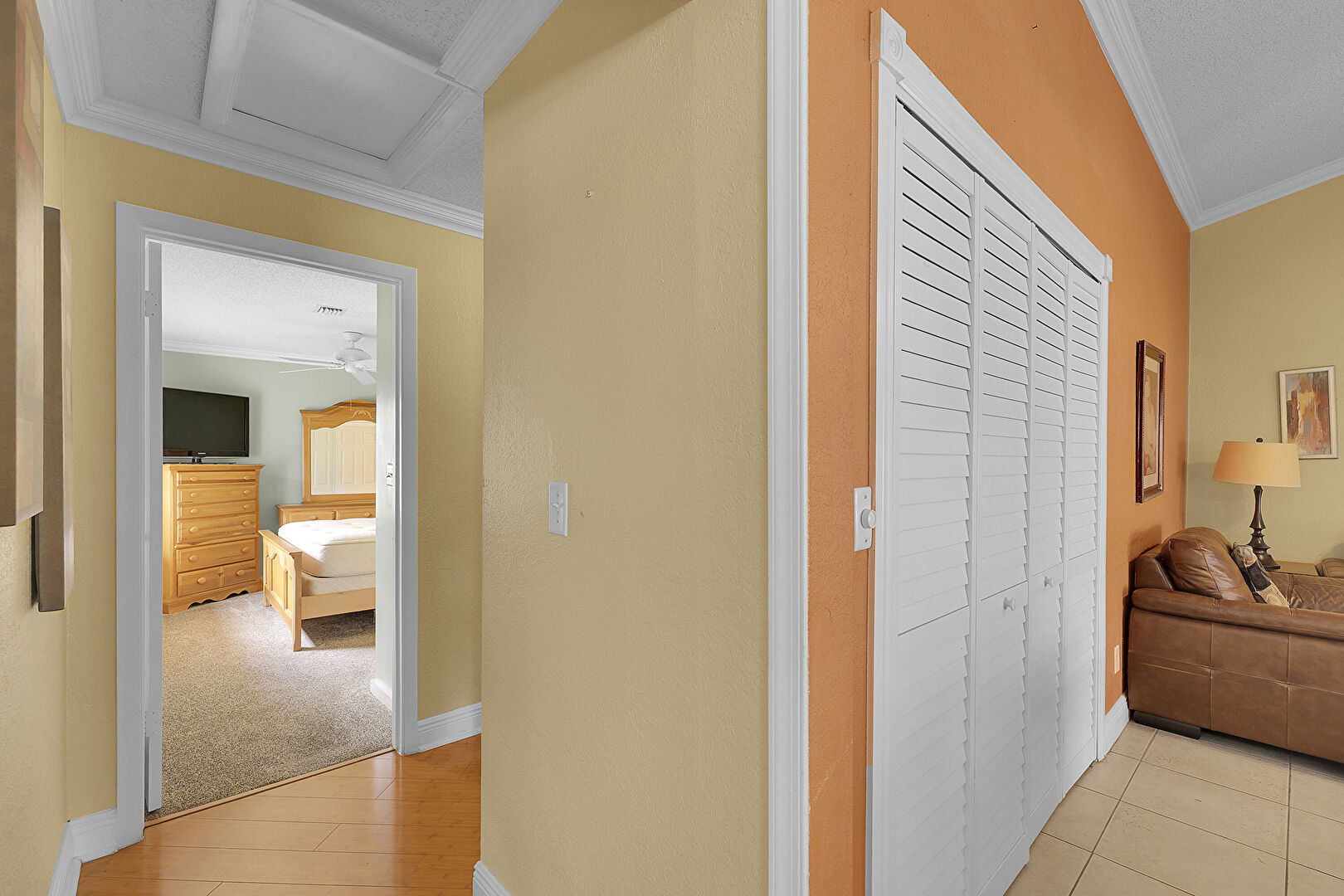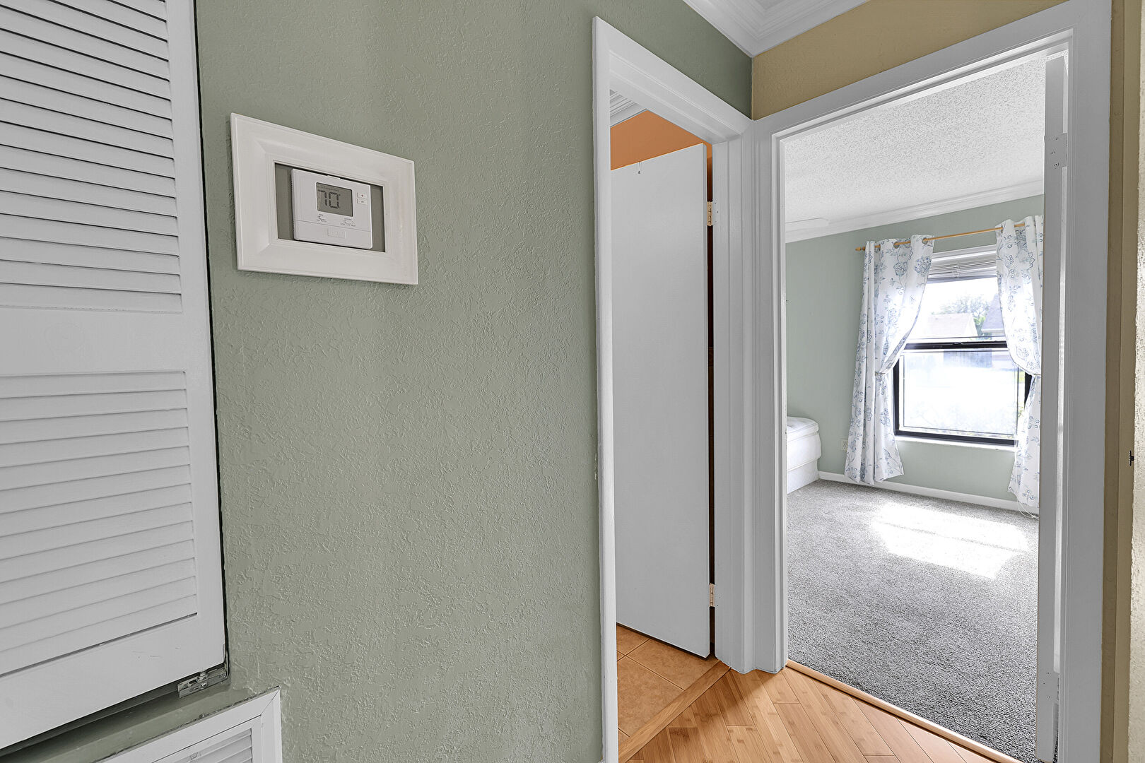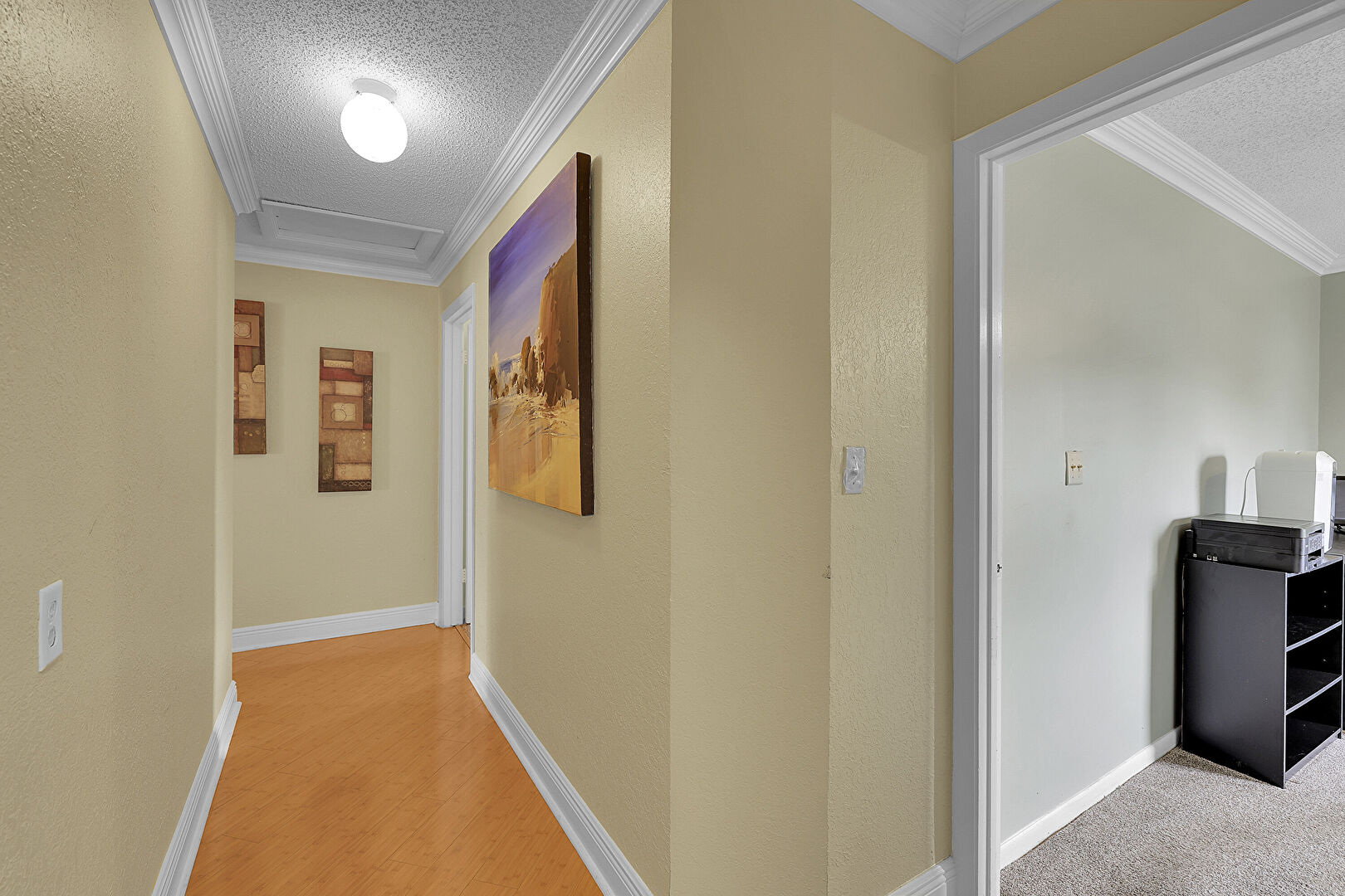 Baseboards Wall, Carpet, Crown Molding, Drywall, Natural Light, Scuttle, Textured Ceiling, Textured Wall, Wood Finish Floor, Textured Ceiling, Textured Wall, Wood Finish Floor