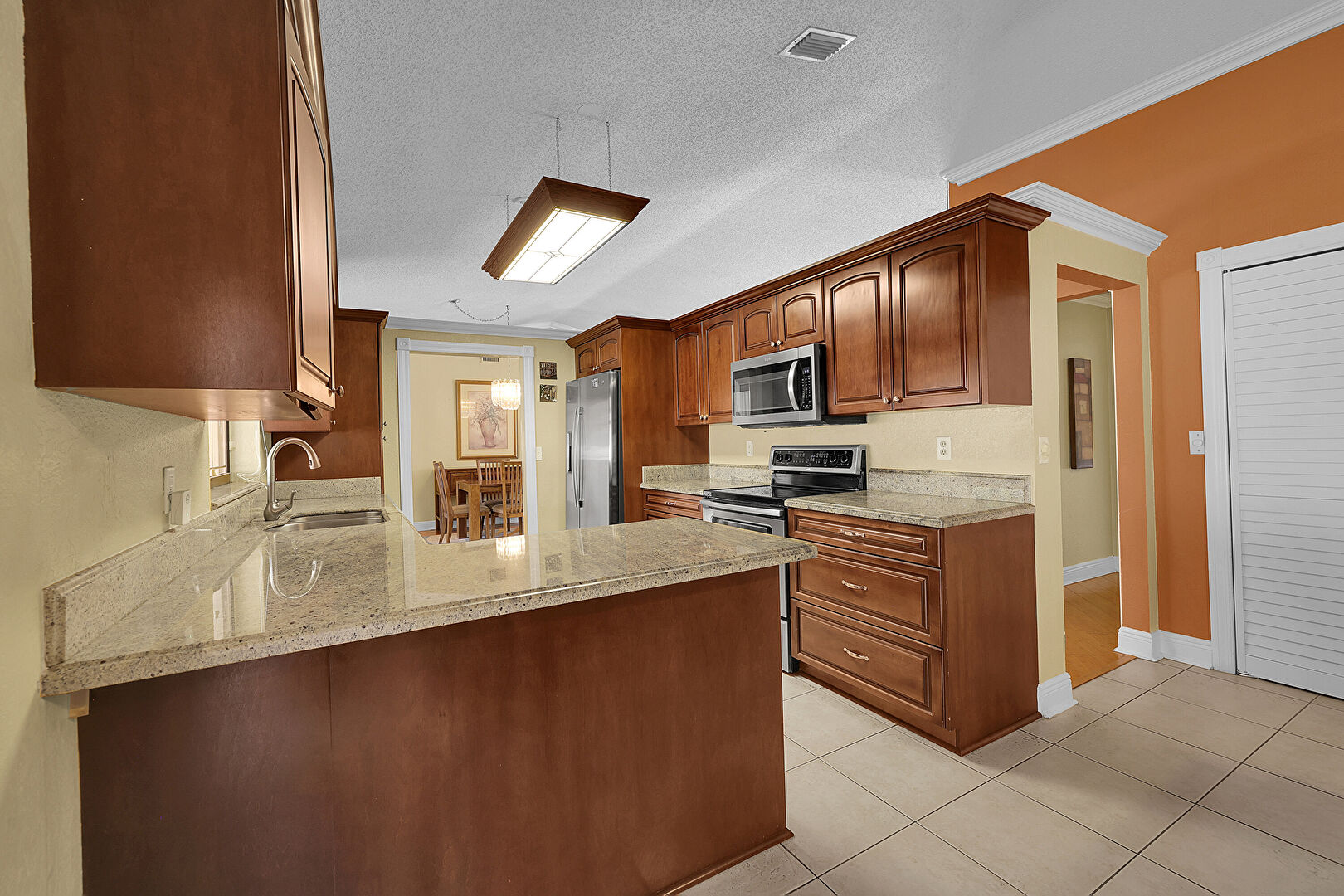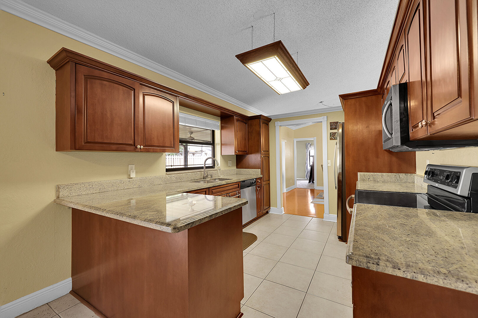 Arched Cabinets, Baseboards Wall, Cathedral Ceiling, Ceiling Fan, Crown Molding, Crown Molding Cabinets, Drywall, G Shaped Kitchen, Kitchen Peninsula, Medium Brown Cabinets, Natural Light, Opens To Living Area, Raised Cabinets, Stone Countertops, Textured Ceiling, Tile Floor, Vaulted Ceiling, Vent, Baseboards Wall, Kitchen Bar, Tile Floor