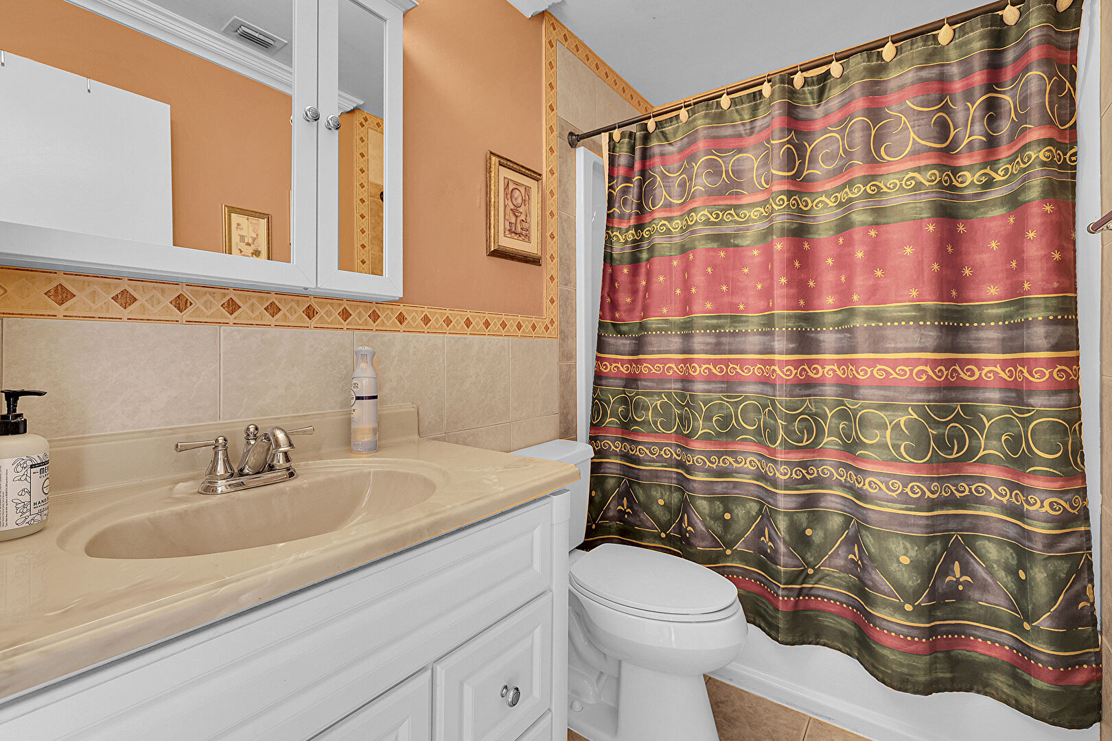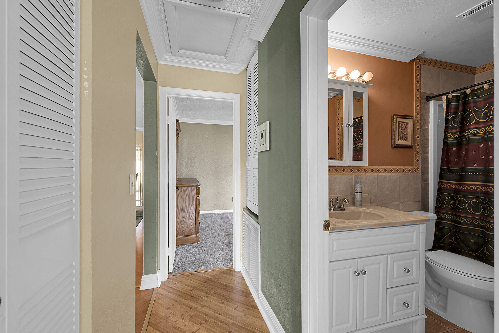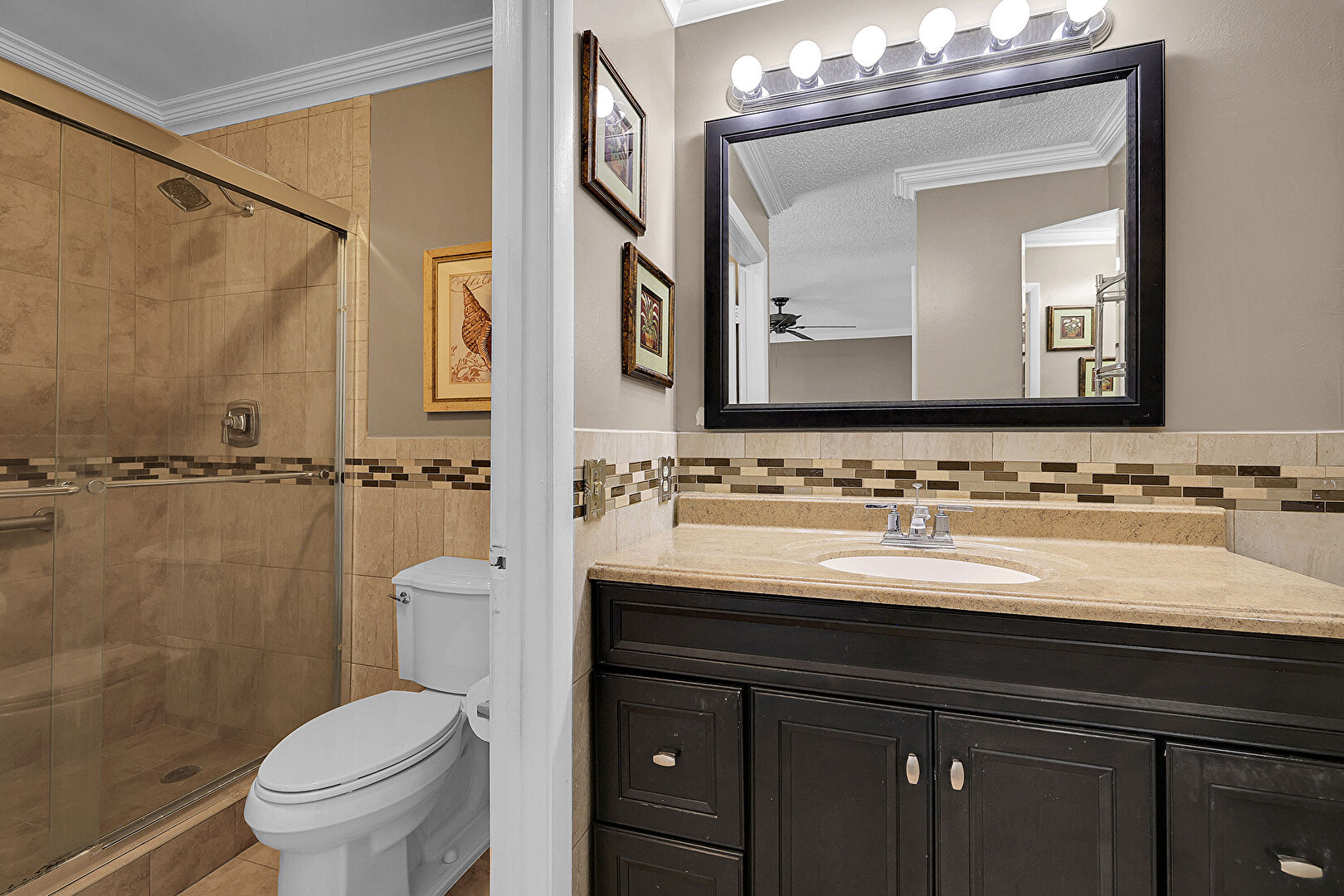 Baseboards Wall, Ceiling Fan, Combined Bath Shower, Crown Molding, Drywall, Full Bathroom, Textured Ceiling, Tile Floor, Tile Wall, Vanity, Vent, Wainscot Wall, Water Closet, Crown Molding, Vanity, Wood Finish Floor