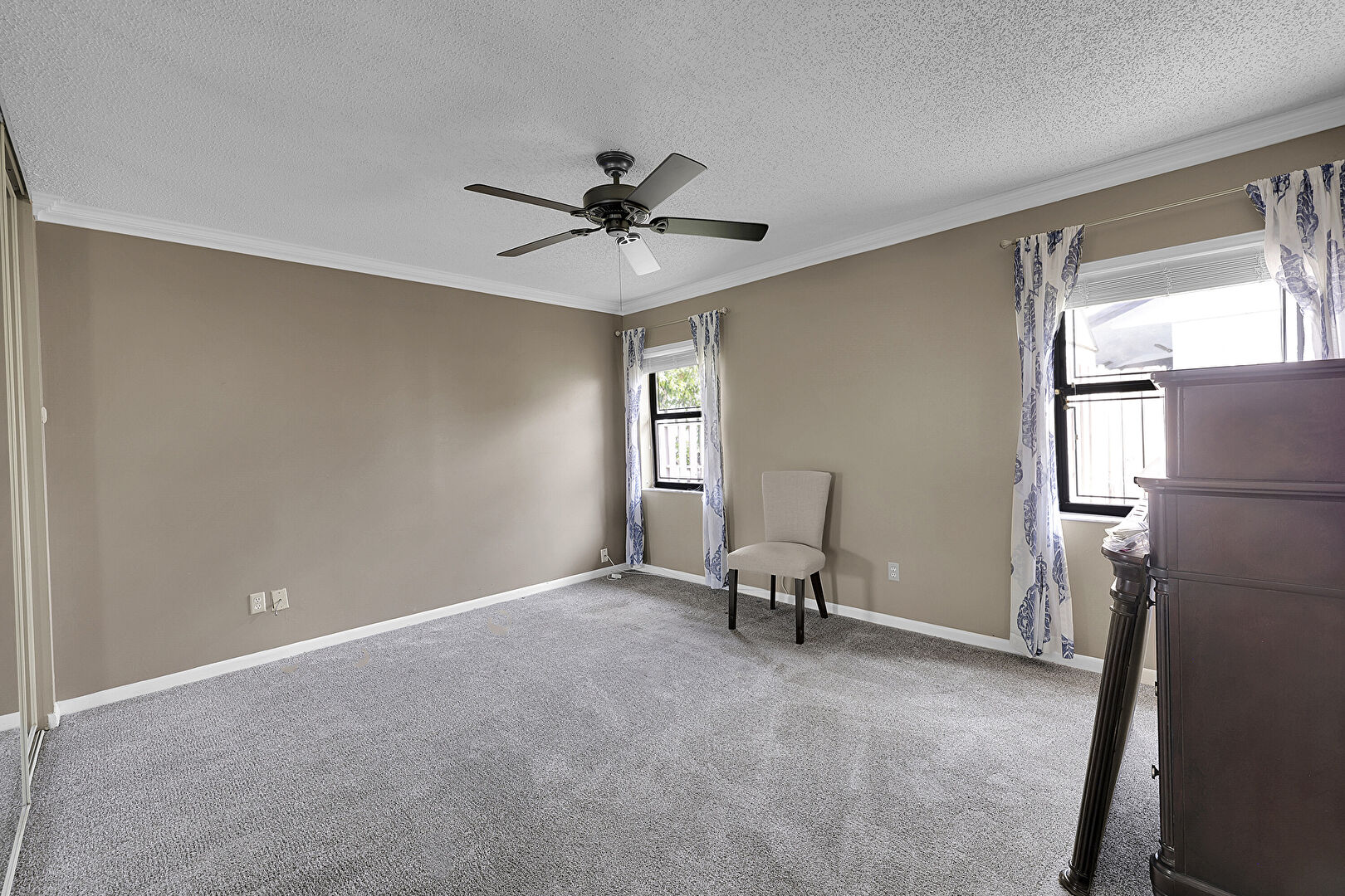 Baseboards Wall, Carpet, Ceiling Fan, Crown Molding, Drywall, Textured Ceiling, Natural Light