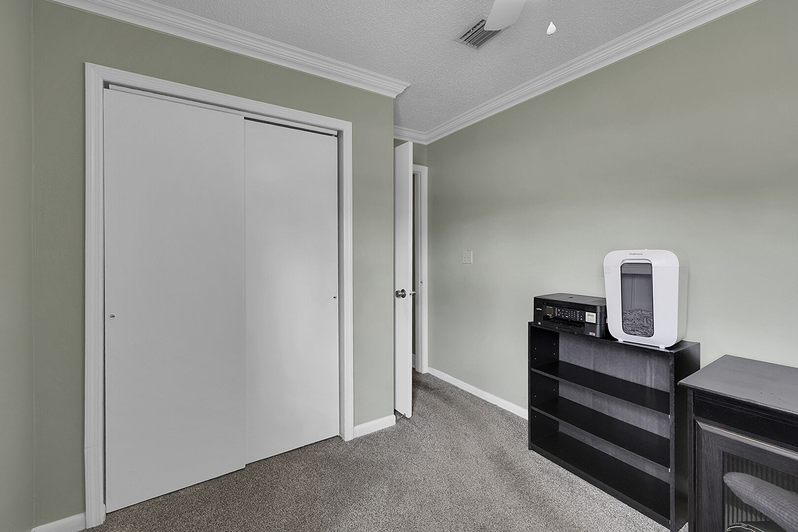 Carpet, Crown Molding, Drywall, Natural Light, Office Area, Vent, Textured Ceiling