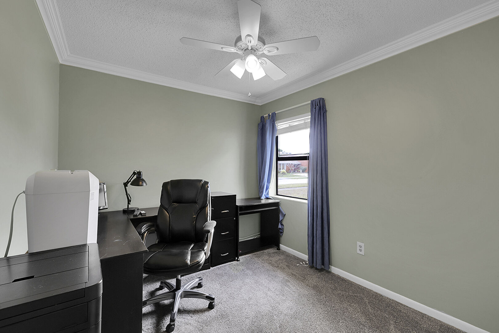 Baseboards Wall, Carpet, Ceiling Fan, Crown Molding, Drywall, Office Area, Textured Ceiling, Natural Light