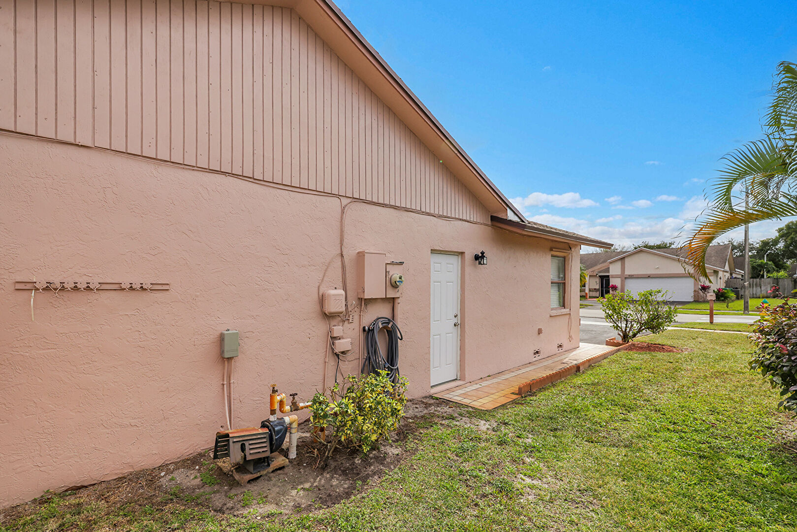 Electric Meter, Lawn, Stucco Siding, Vertical Siding, Gas Meter