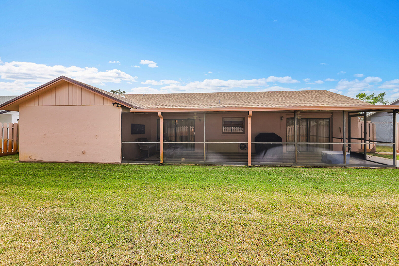 Downspout, Fence, Gate, Gutters, Lawn, Outdoor Structure, Shed, Shingle Roof, Stucco Siding, Sunroom, Vertical Siding, Grill, Lawn, Vertical Siding