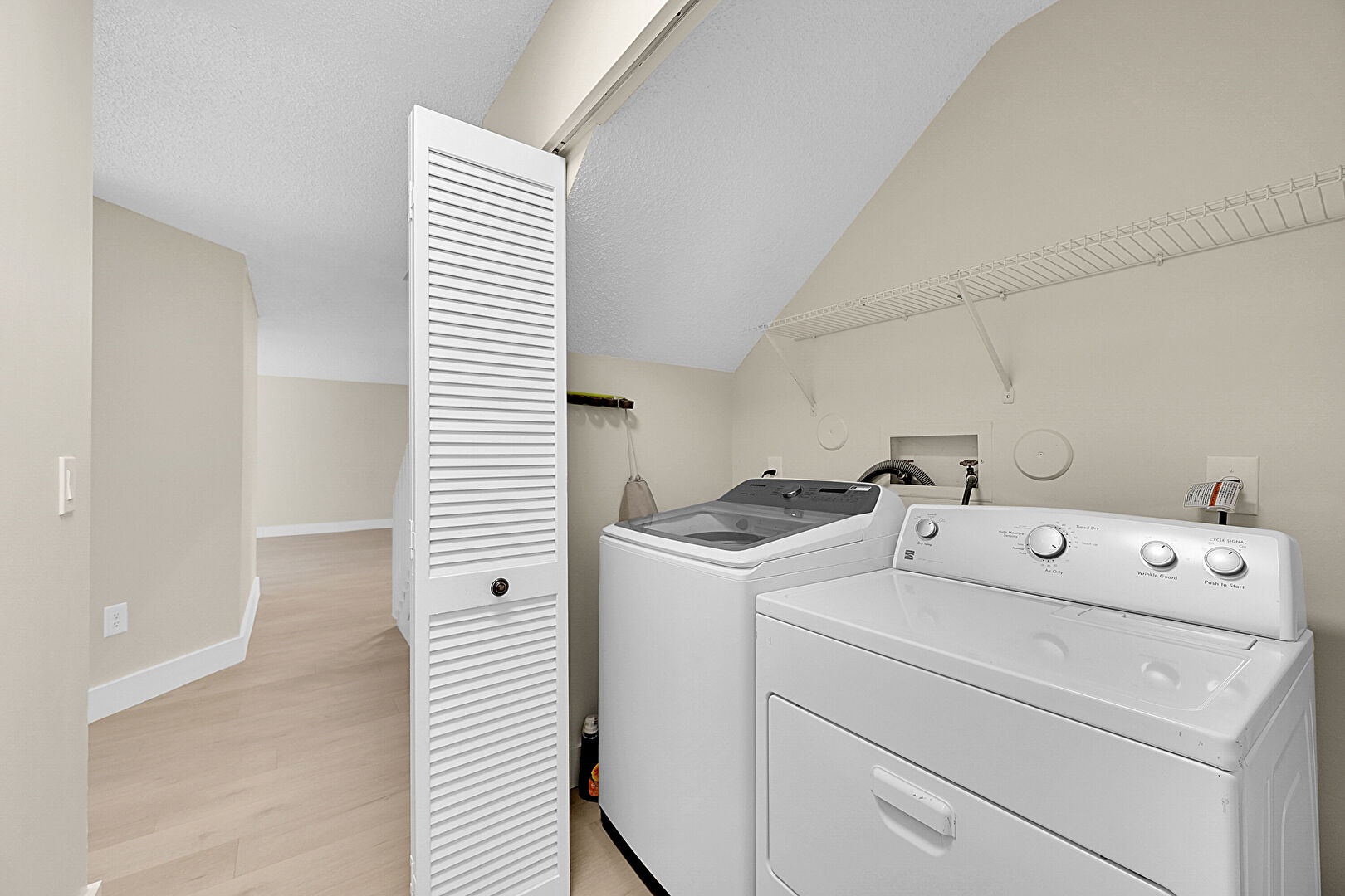 Baseboards Wall, Drywall, Laundry, Textured Ceiling, Washer Hookup, Wood Finish Floor, Vaulted Ceiling