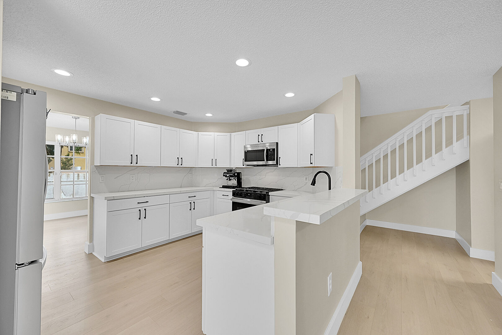 Baseboards Wall, Drywall, Kitchen Bar, Kitchen Peninsula, Natural Light, Notable Chandelier, Opens To Living Area, Recessed Lighting, Shaker Cabinets, Stone Countertops, Textured Ceiling, Vent, Wood Finish Floor, Kitchen Peninsula, Stone Countertops