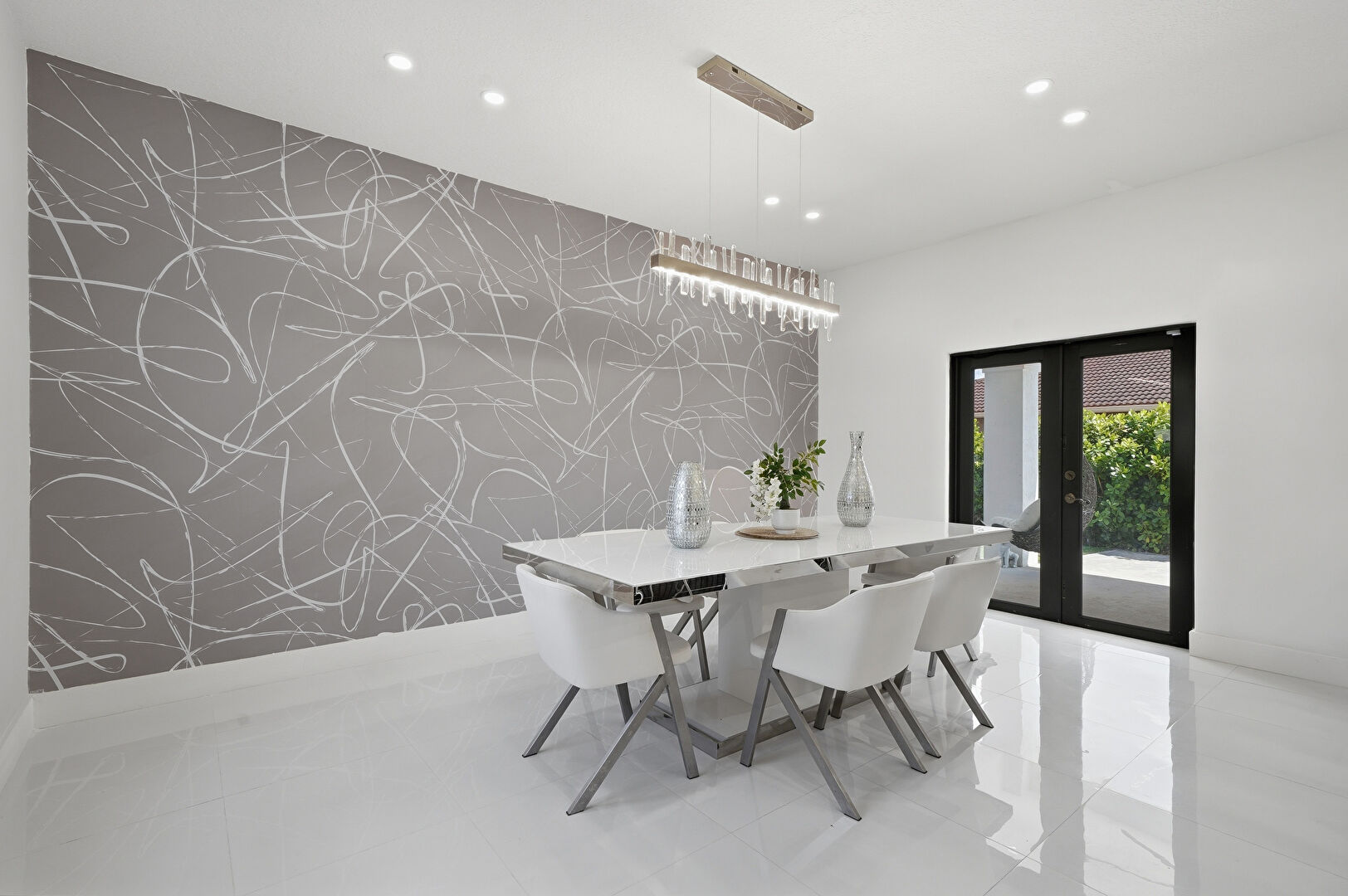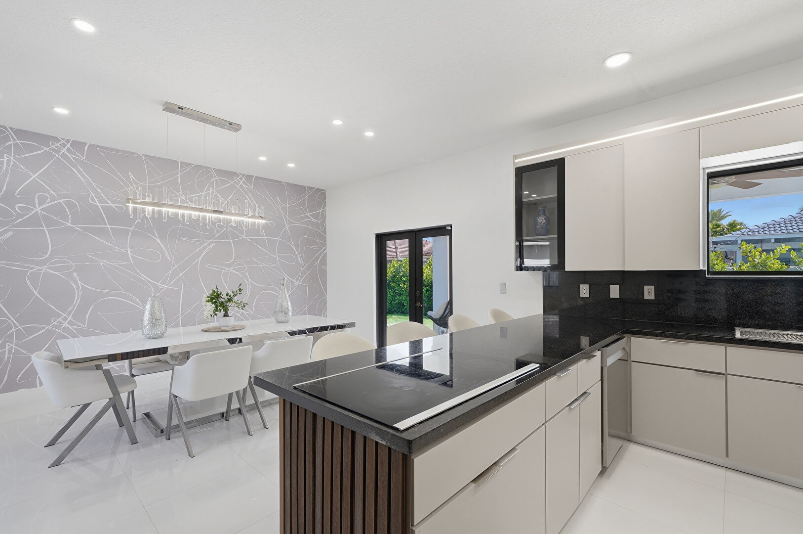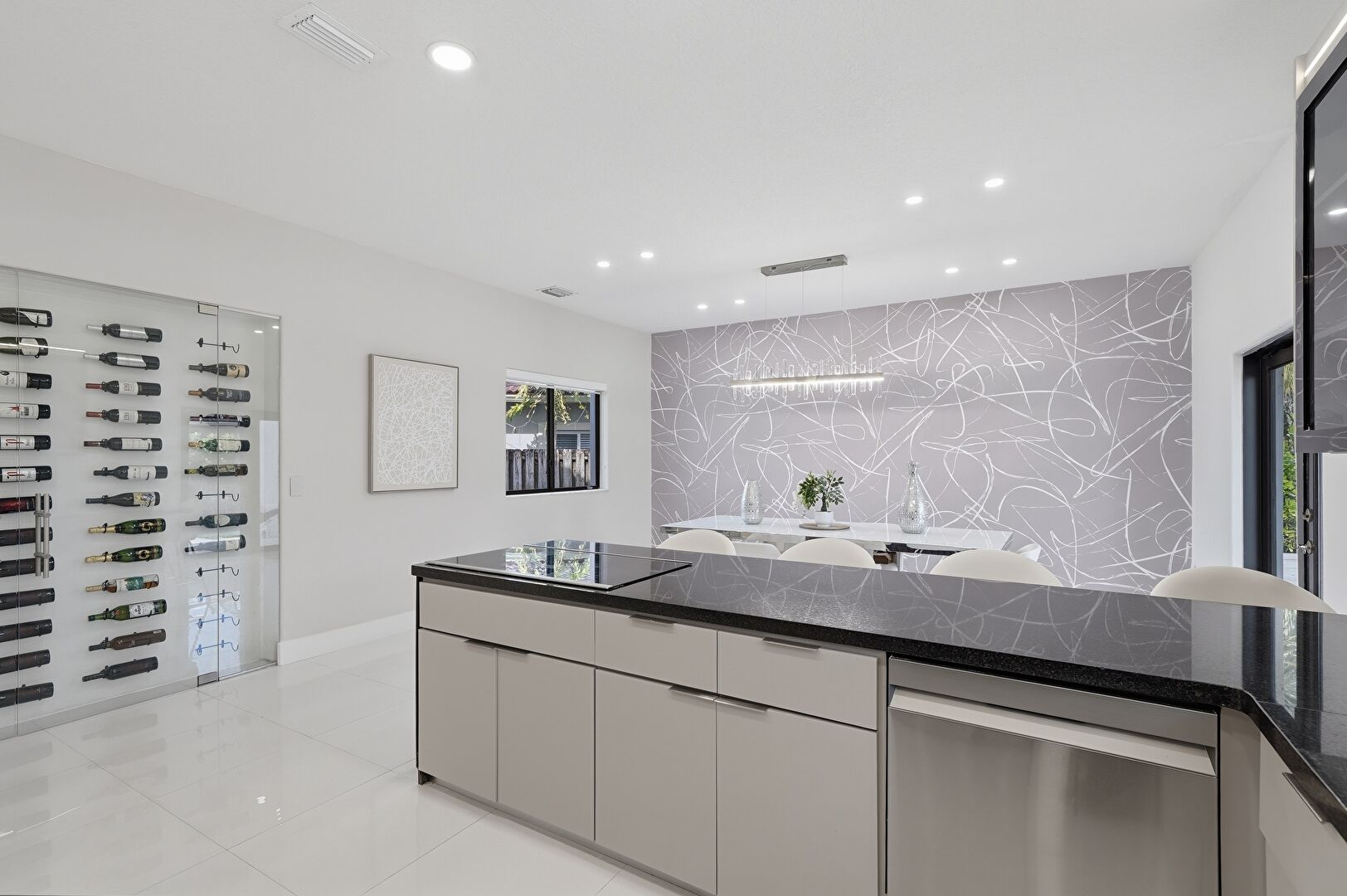 Accent Wall, Baseboards Wall, Ceiling Fan, Drywall, Flat Panel Cabinets, French Doors, Glass Insert Cabinets, Kitchen Bar, Kitchen Peninsula, Natural Light, Pendant Lighting, Recessed Lighting, Stone Countertops, Tile Floor, U Shaped Kitchen, Vent, Wallpaper Wall, Accent Wall, Flat Panel Cabinets, Kitchen Peninsula, Natural Light, Stone Countertops, Tile Floor, U Shaped Kitchen