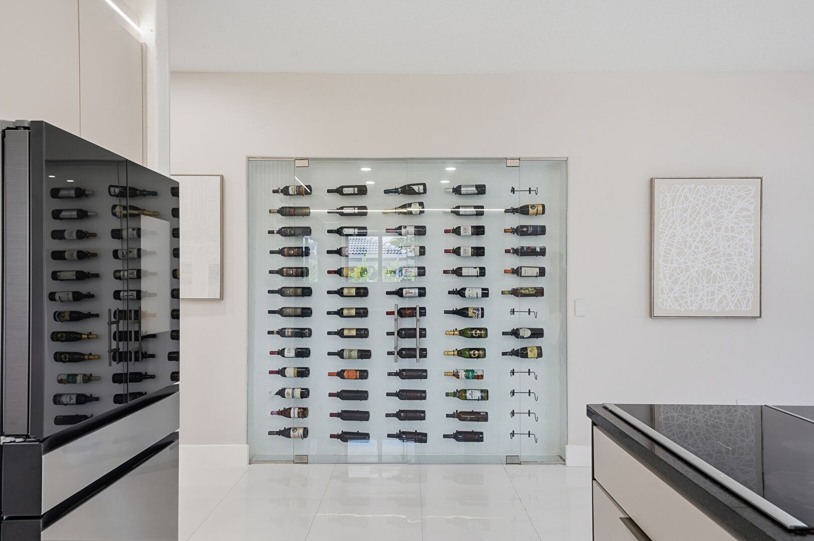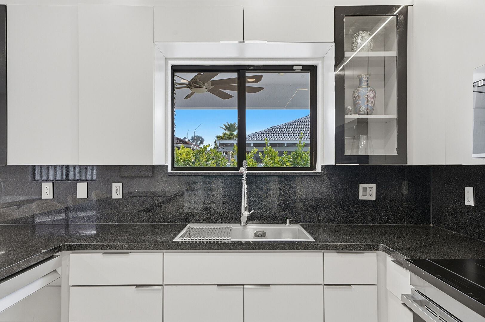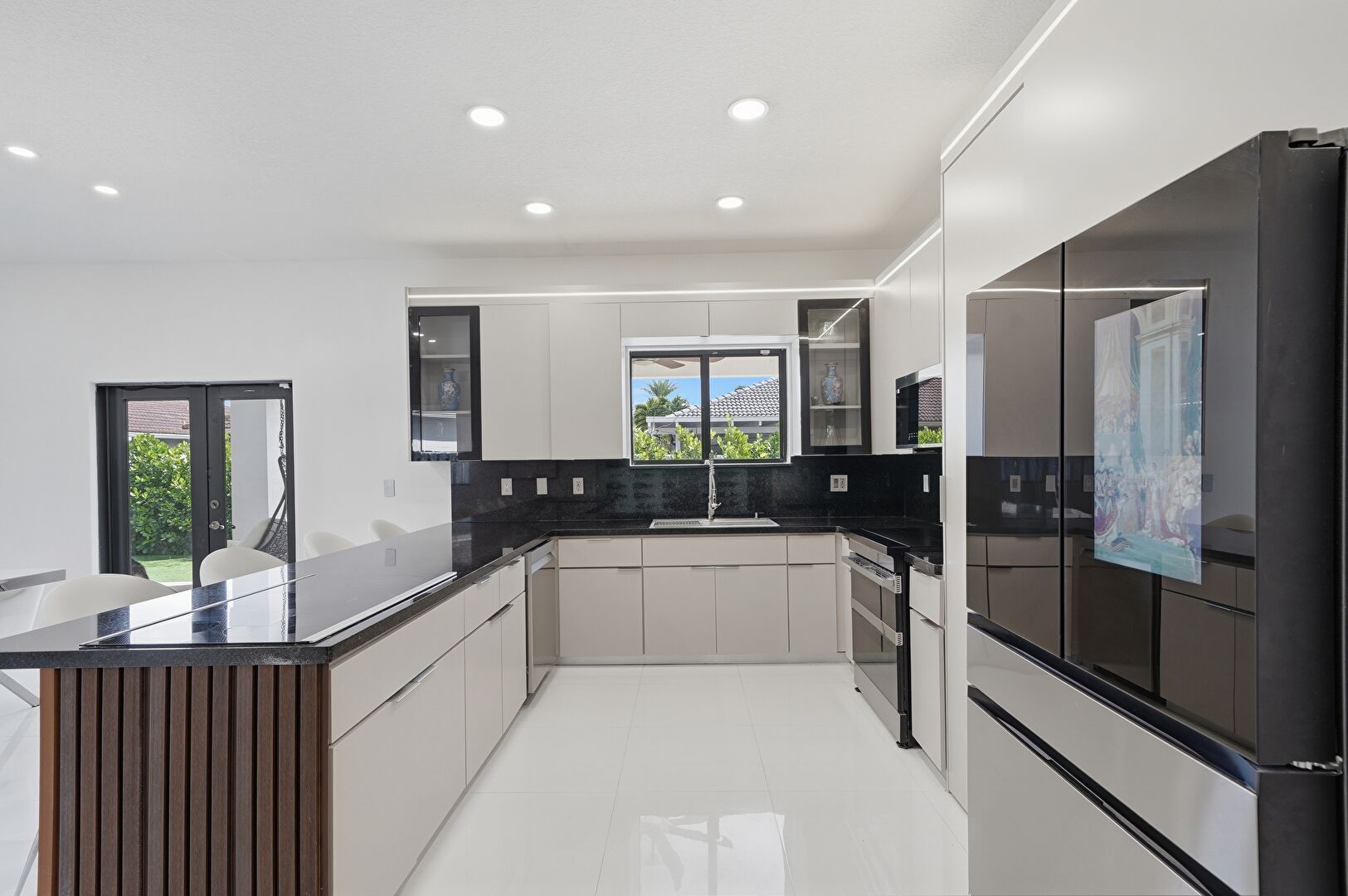 Accent Wall, Baseboards Wall, Ceiling Fan, Drywall, Flat Panel Cabinets, French Doors, Glass Insert Cabinets, Kitchen Bar, Kitchen Peninsula, Natural Light, Pendant Lighting, Recessed Lighting, Stone Countertops, Tile Floor, U Shaped Kitchen, Vent, Wallpaper Wall, Accent Wall, Flat Panel Cabinets, Kitchen Peninsula, Natural Light, Stone Countertops, Tile Floor, U Shaped Kitchen