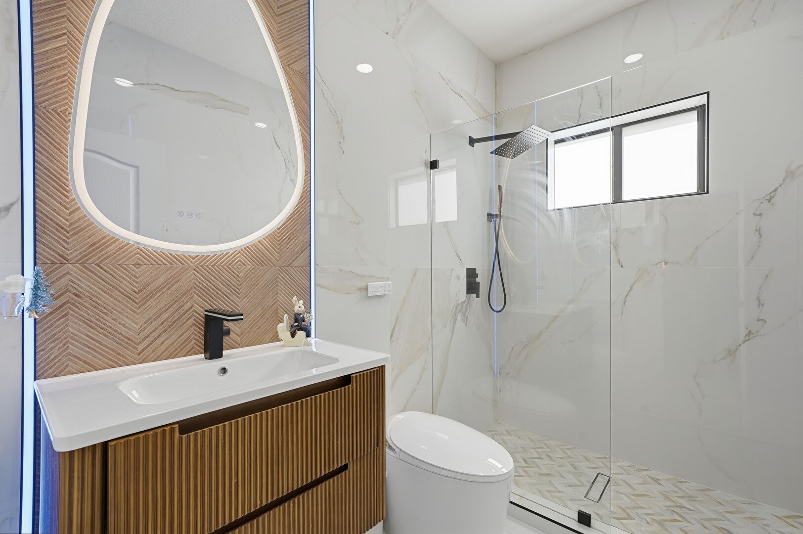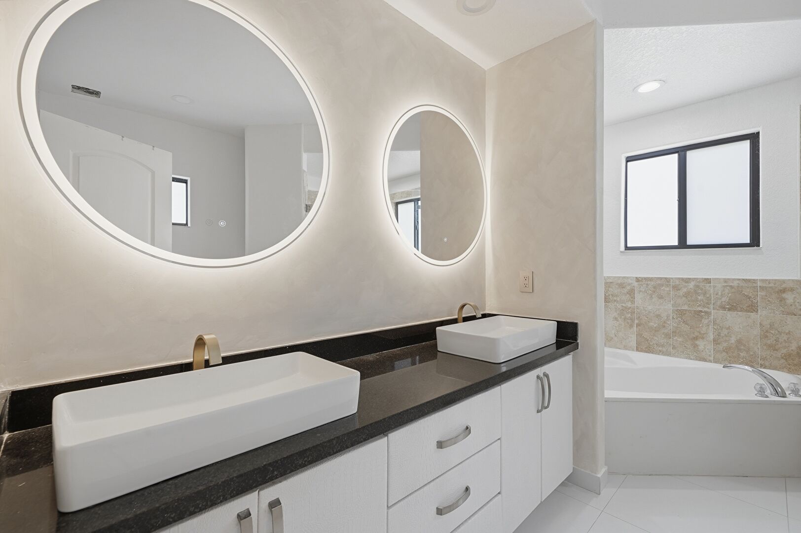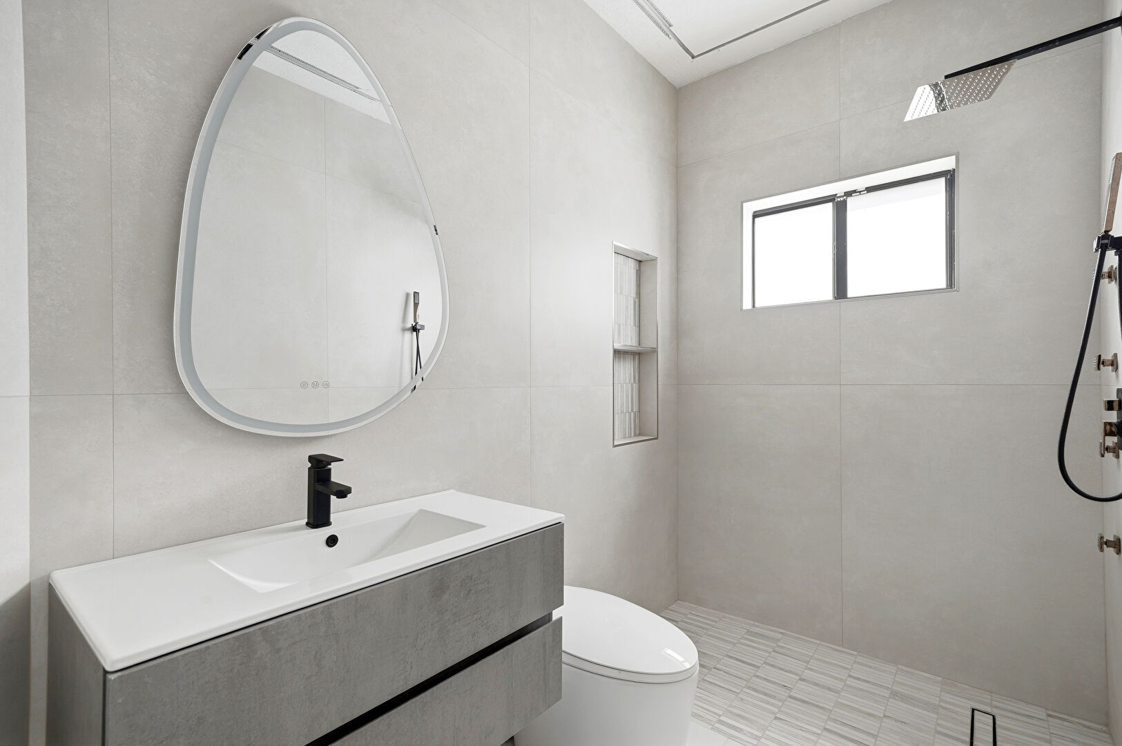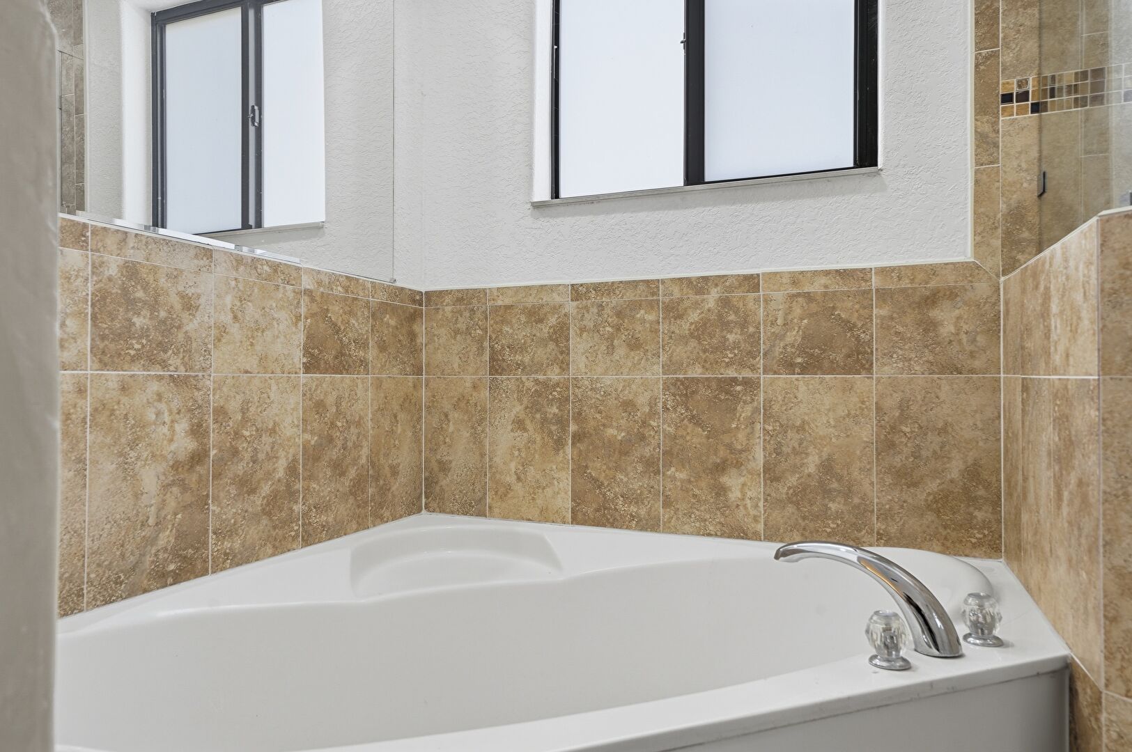Baseboards Wall, Bidet, Drywall, Full Bathroom, Natural Light, Recessed Lighting, Textured Wall, Tile Floor, Vanity, Vent, Double Vanity, Natural Light, Textured Ceiling