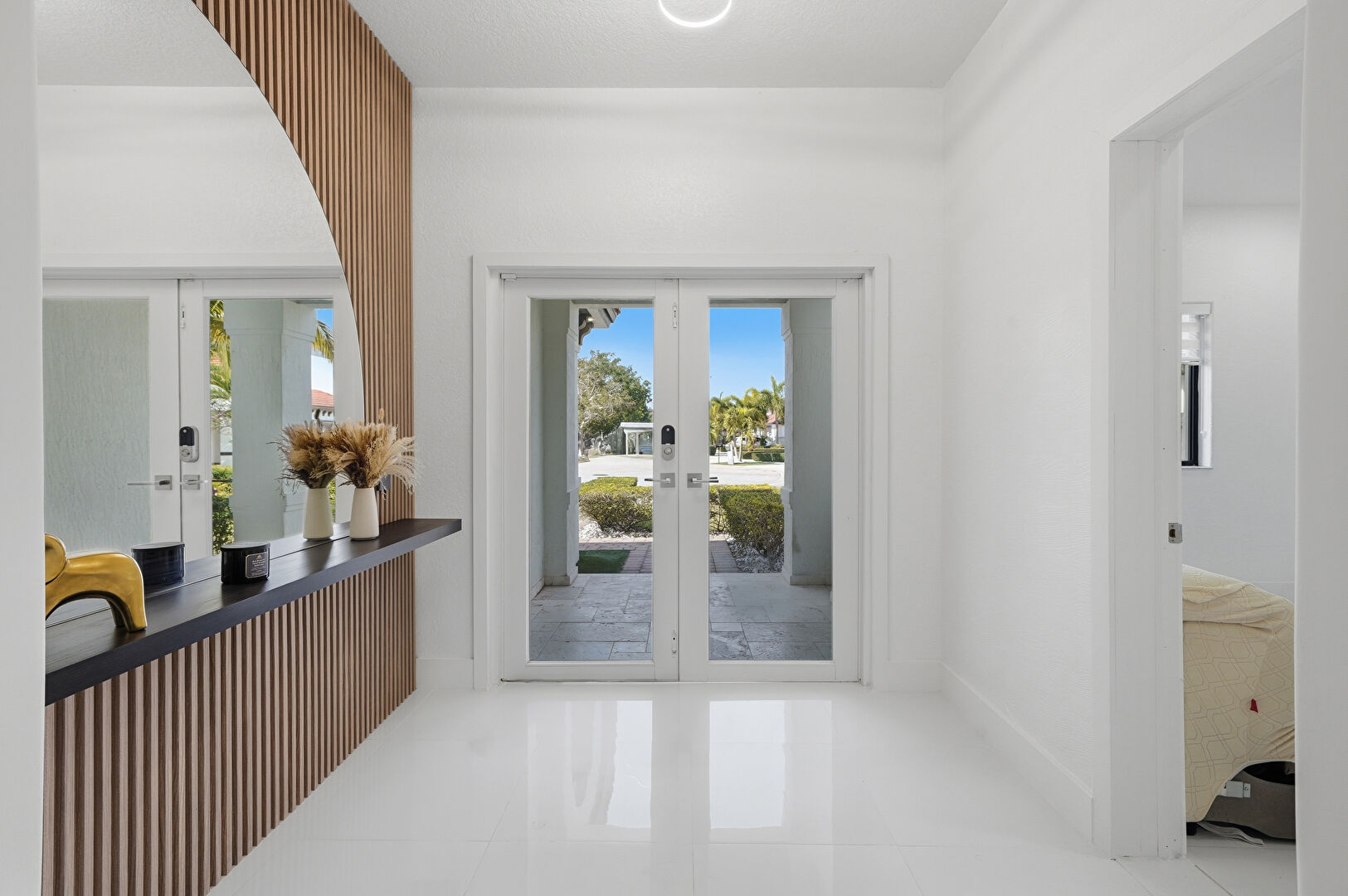 Baseboards Wall, Drywall, French Doors, Notable Chandelier, Pendant Lighting, Stairs, Tile Floor, Vent, Wallpaper Wall, Accent Wall, Natural Light