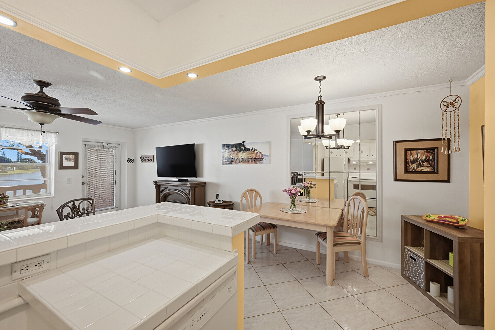 Baseboards Wall, Ceiling Fan, Crown Molding, Drywall, Kitchen Bar, L Shaped Kitchen, Natural Light, Notable Chandelier, Opens To Living Area, Pendant Lighting, Recessed Lighting, Shaker Cabinets, Textured Ceiling, Tile Countertops, Tile Floor, Tray Ceiling, Visible Hinge Cabinets, Ceiling Fan, Crown Molding Cabinets, Drywall