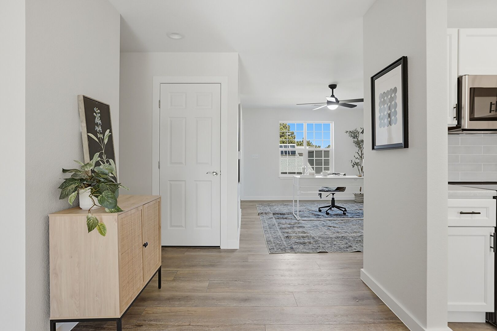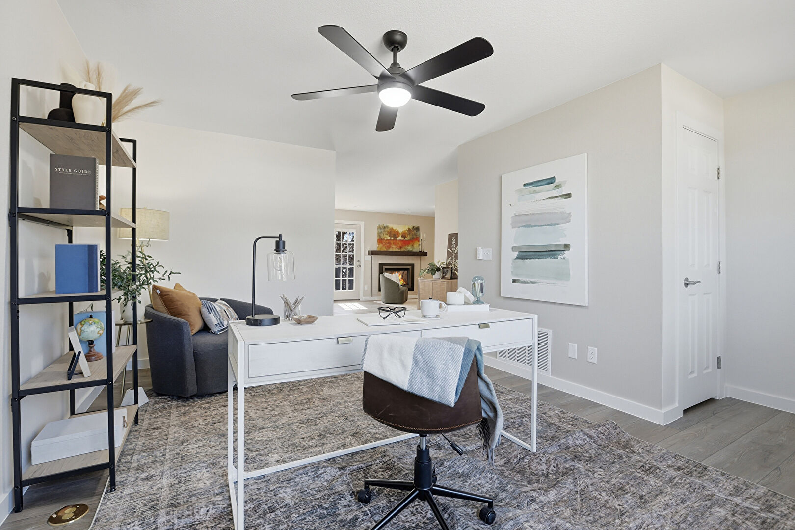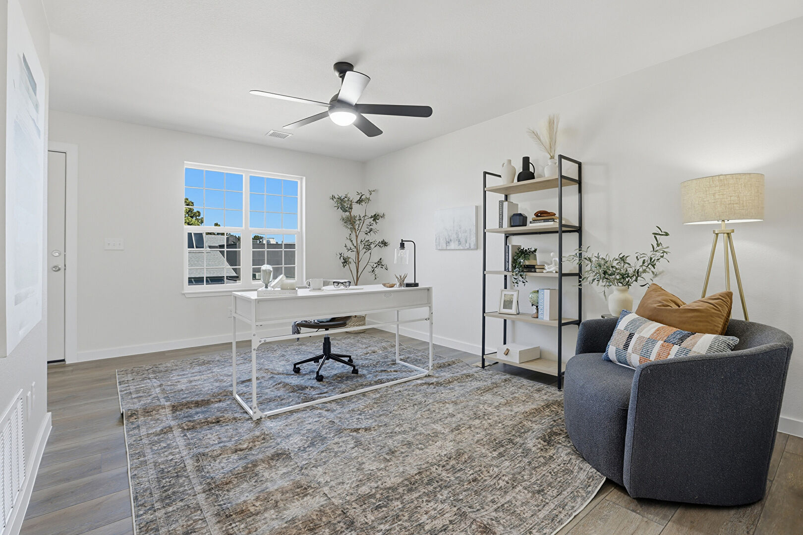 Baseboards Wall, Ceiling Fan, Drywall, Fireplace, Natural Light, Office Area, Vent, Wood Finish Floor, Baseboards Wall, Drywall, Vent, Wood Finish Floor