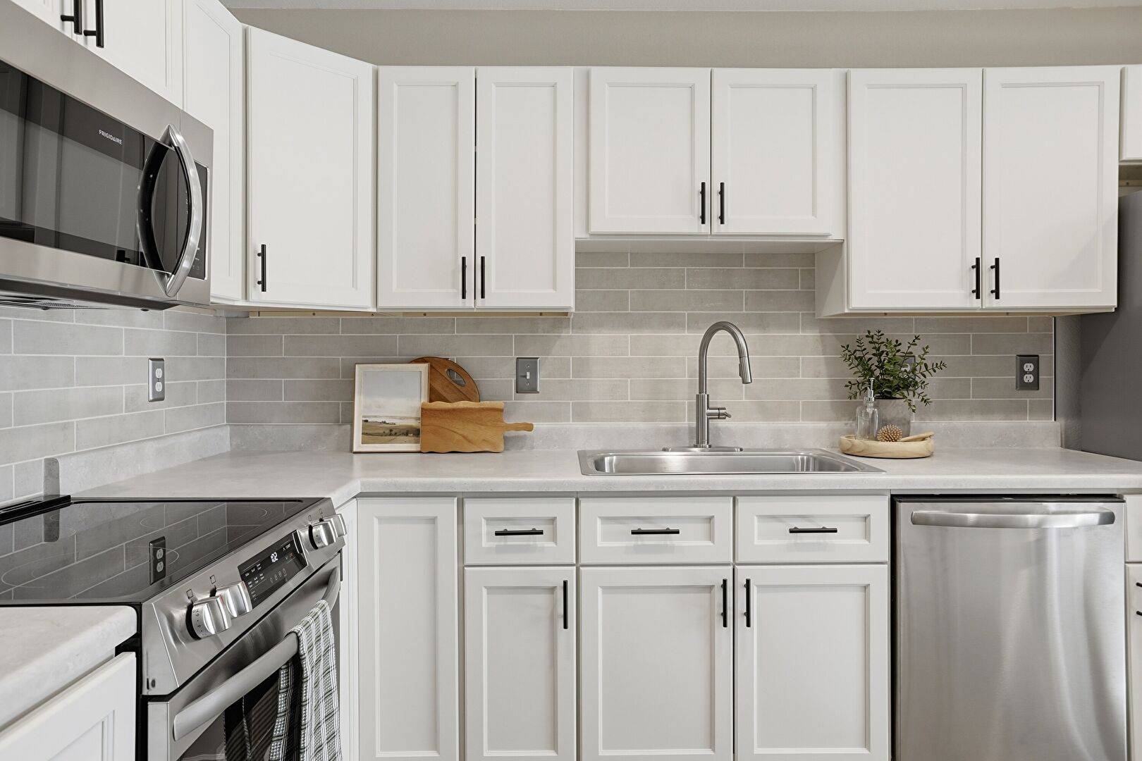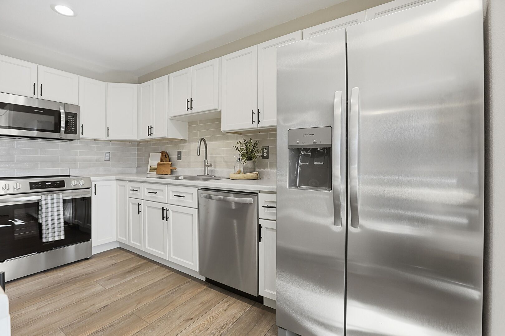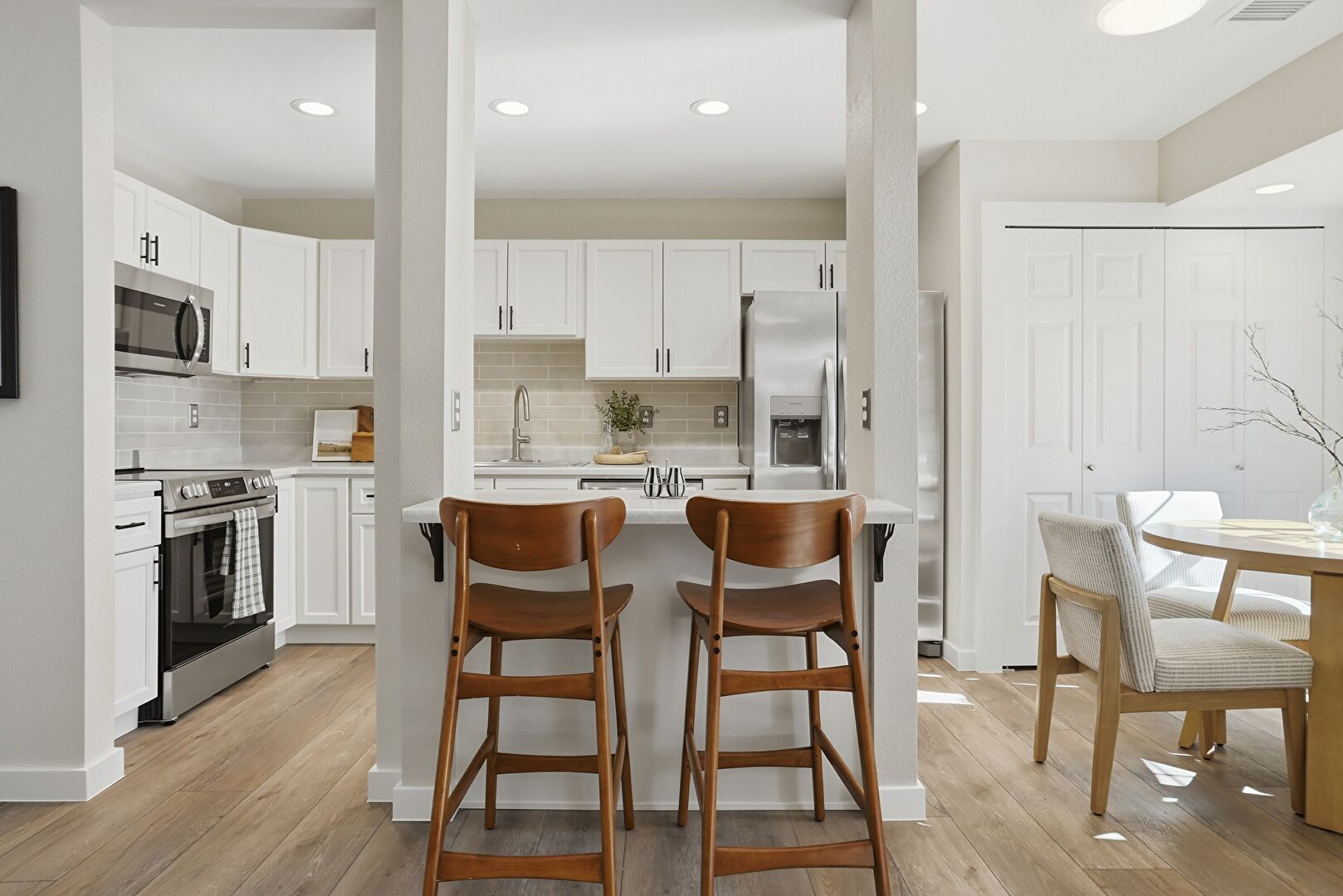 Baseboards Wall, Drywall, Kitchen Bar, Kitchen Island, L Shaped Kitchen, Natural Light, Recessed Lighting, Shaker Cabinets, Stone Countertops, Vent, Wood Finish Floor, Shaker Cabinets, Stone Countertops, Wood Finish Floor