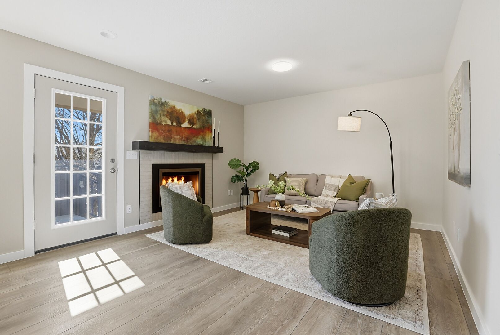 Baseboards Wall, Drywall, Fireplace, Recessed Lighting, Vent, Wood Finish Floor, Fireplace, Natural Light, Vent