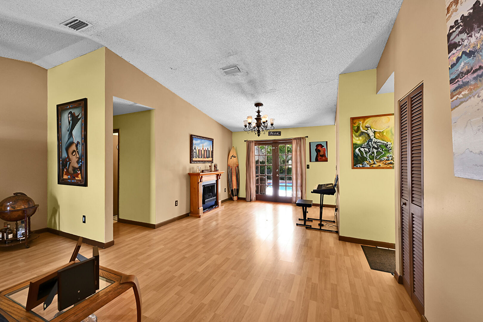 Baseboards Wall, Drywall, Fireplace, French Doors, Natural Light, Notable Chandelier, Textured Ceiling, Vaulted Ceiling, Vent, Wood Finish Floor, Drywall, Natural Light, Notable Chandelier