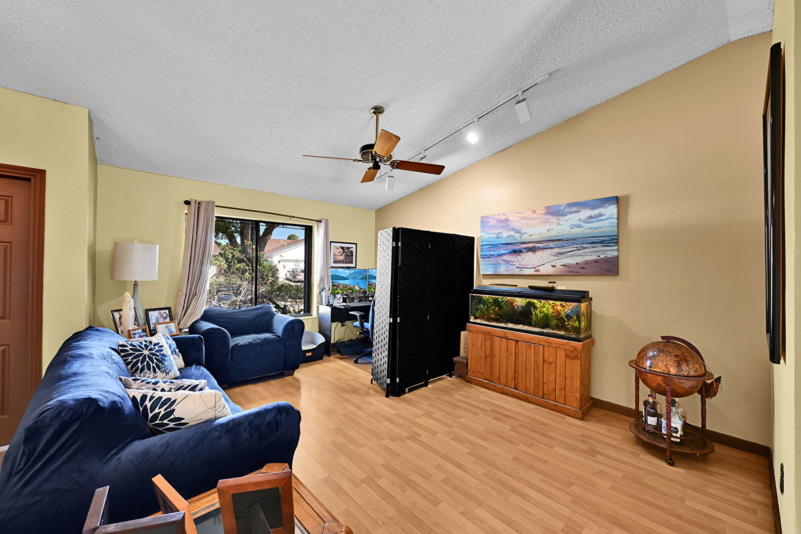 Baseboards Wall, Ceiling Fan, Drywall, French Doors, Natural Light, Office Area, Textured Ceiling, Track Lighting, Vaulted Ceiling, Vent, Wood Finish Floor, Baseboards Wall, Natural Light, Track Lighting