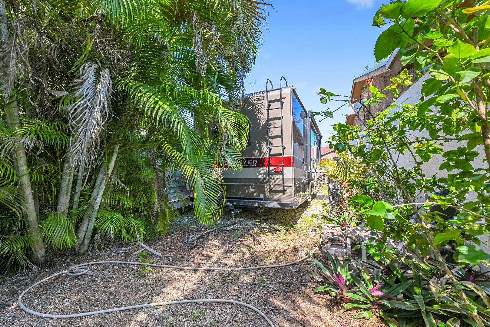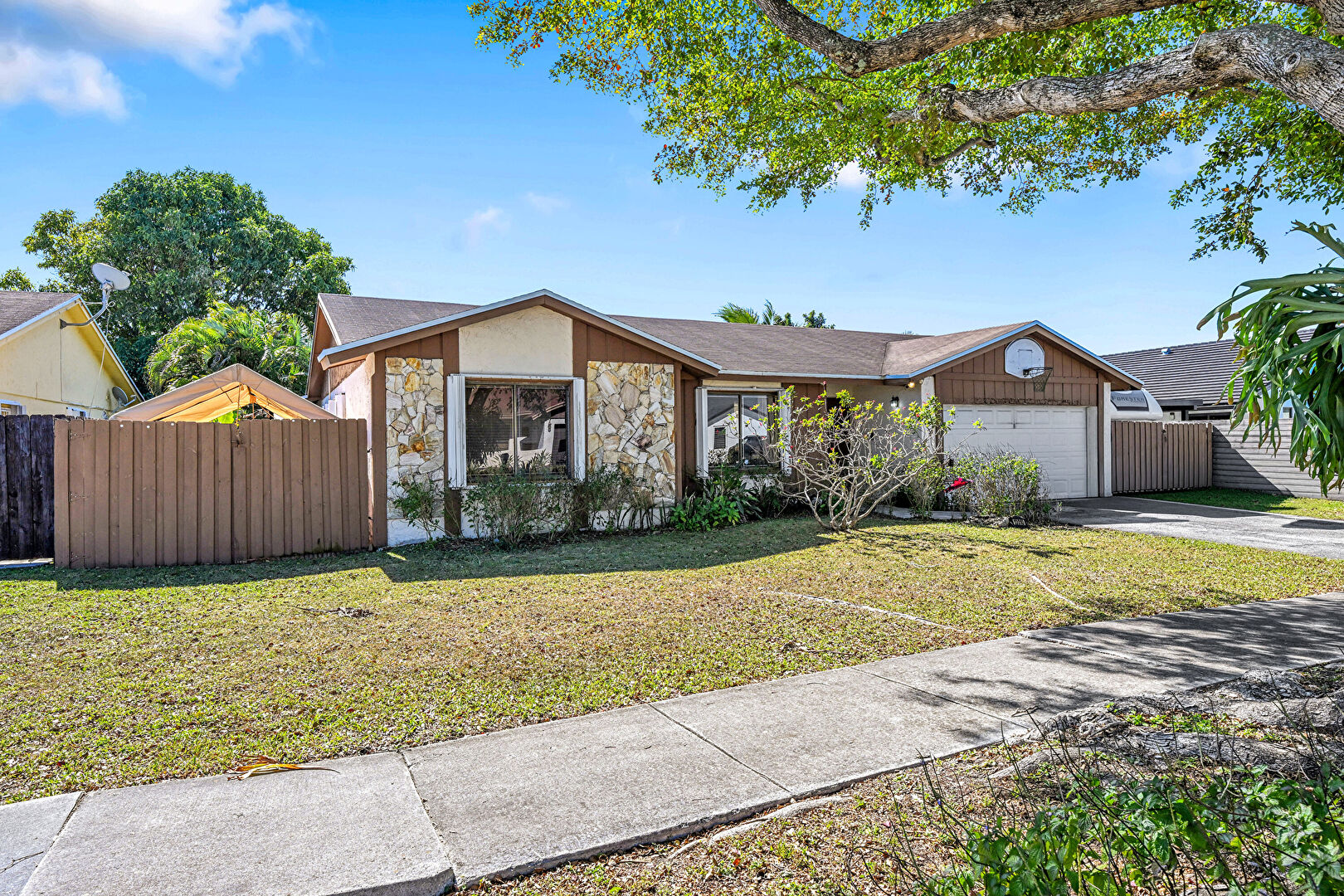Driveway, Fence, Gate, Lawn, Satellite Dish, Stone Siding, Stucco Siding, Vertical Siding, Driveway, Fence, Lawn, Satellite Dish